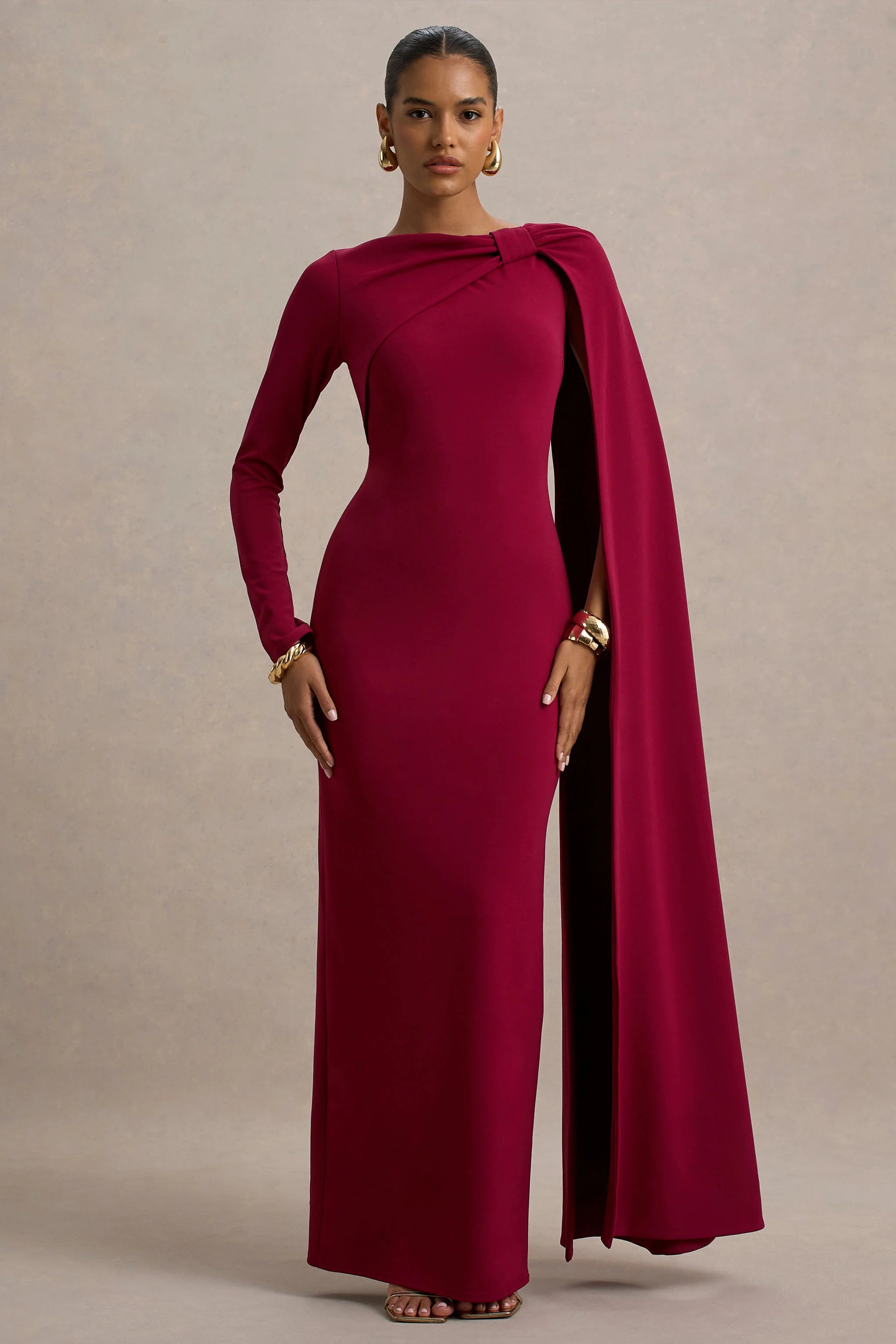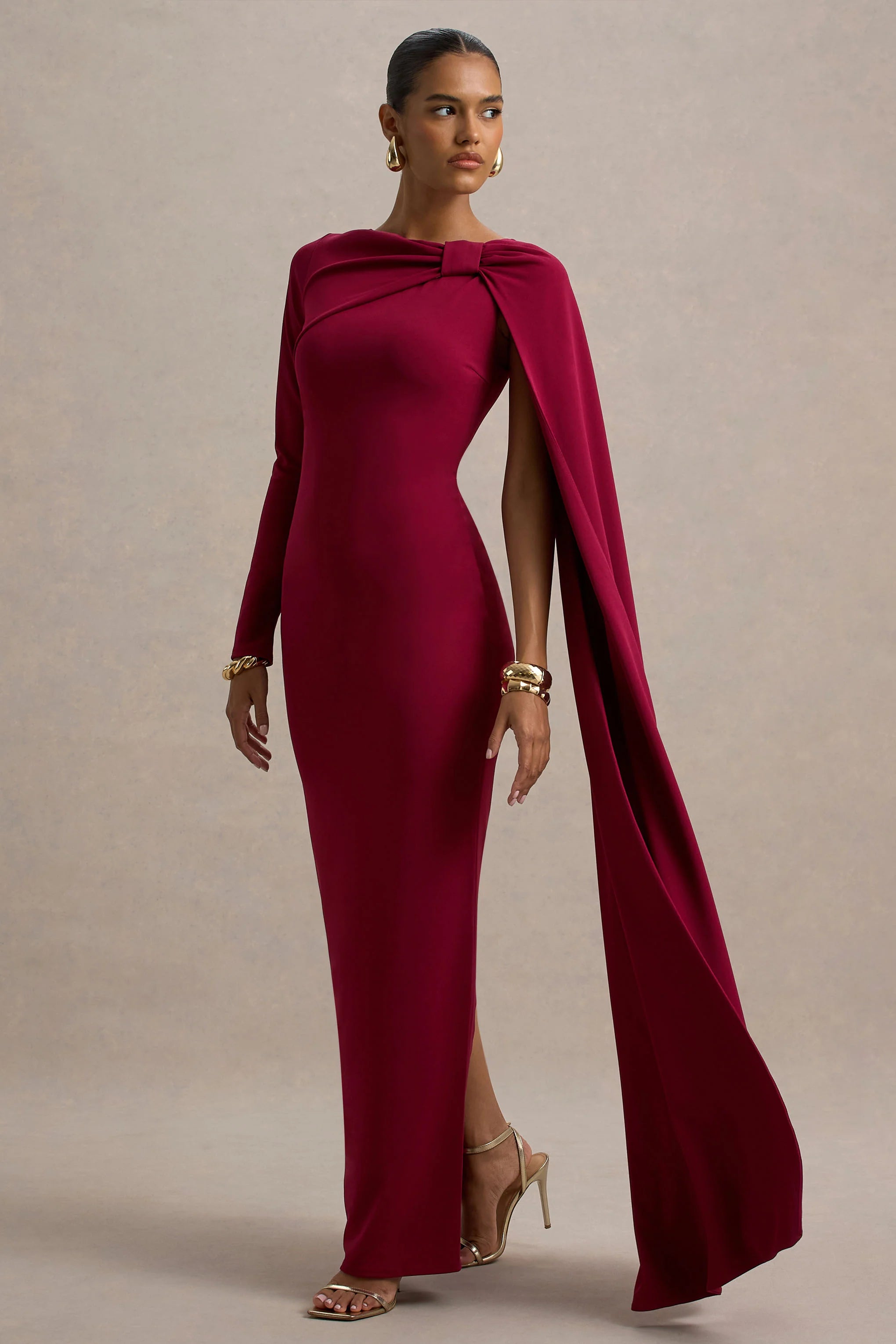 Make an entrance at your next special occasion in Frances. Designed in a rich burgundy hue of our premium scuba crepe, this maxi will graciously sculpt your curves and enhance your silhouette. Featuring a chic high neckline that is elevated with a statement cape detail, adding a touch of drama to this classic gown. Perfect for moments where you want to stand out, paired with sleek accessories.