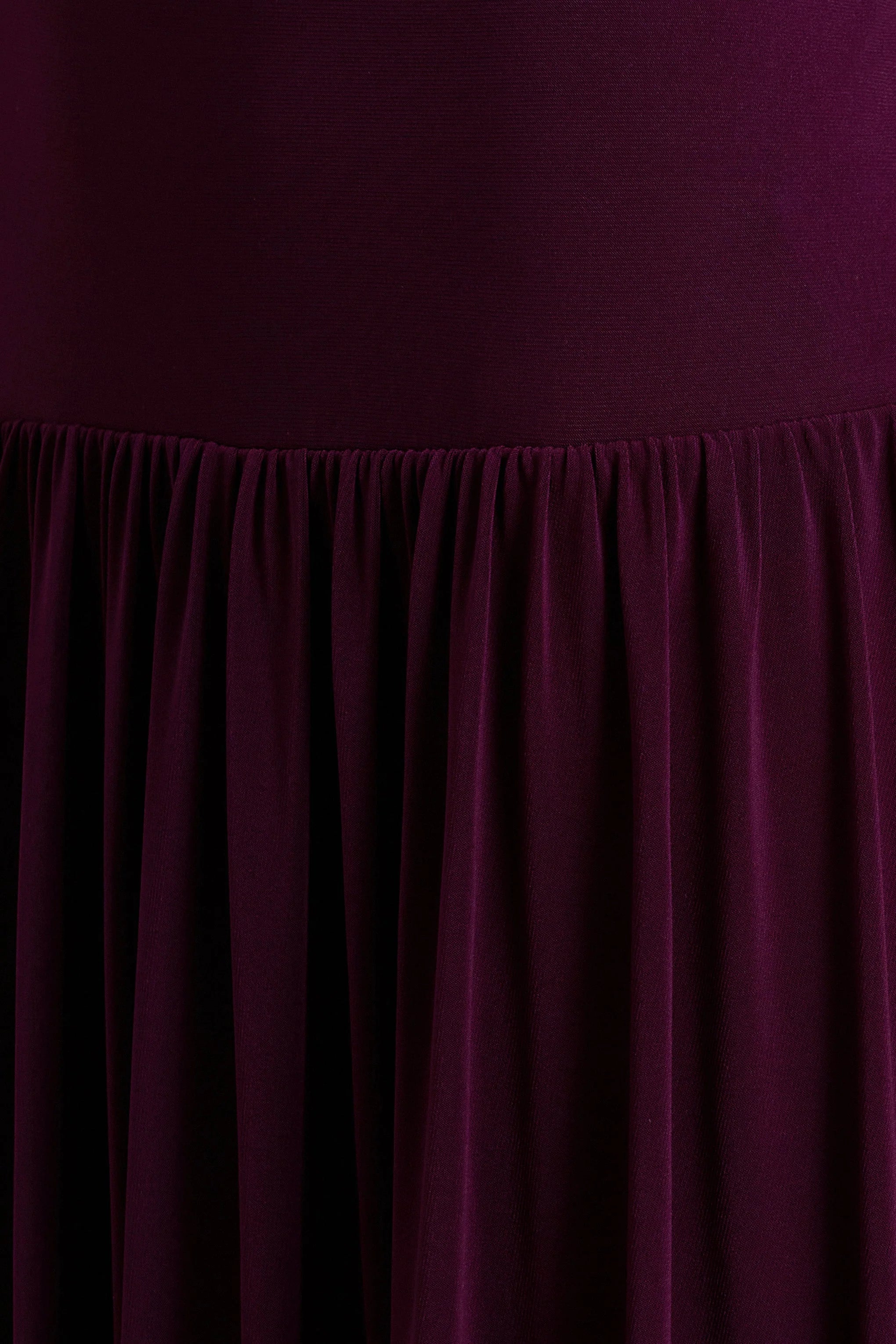 Turn heads with Freesia, a show-stopping design made for unforgettable entrances. Crafted from our signature premium stretch jersey, this plum-hued maxi clings in all the right places while offering a flawless, sculpted fit. The asymmetric neckline is elevated with a statement scarf detail that drapes effortlessly, while the adjustable strap allows for a custom fit. A drop waist adds a modern edge, flowing into a sleek, floor-sweeping silhouette. Finished with an open back for added allure, Freesia is your new go-to for evening elegance.
