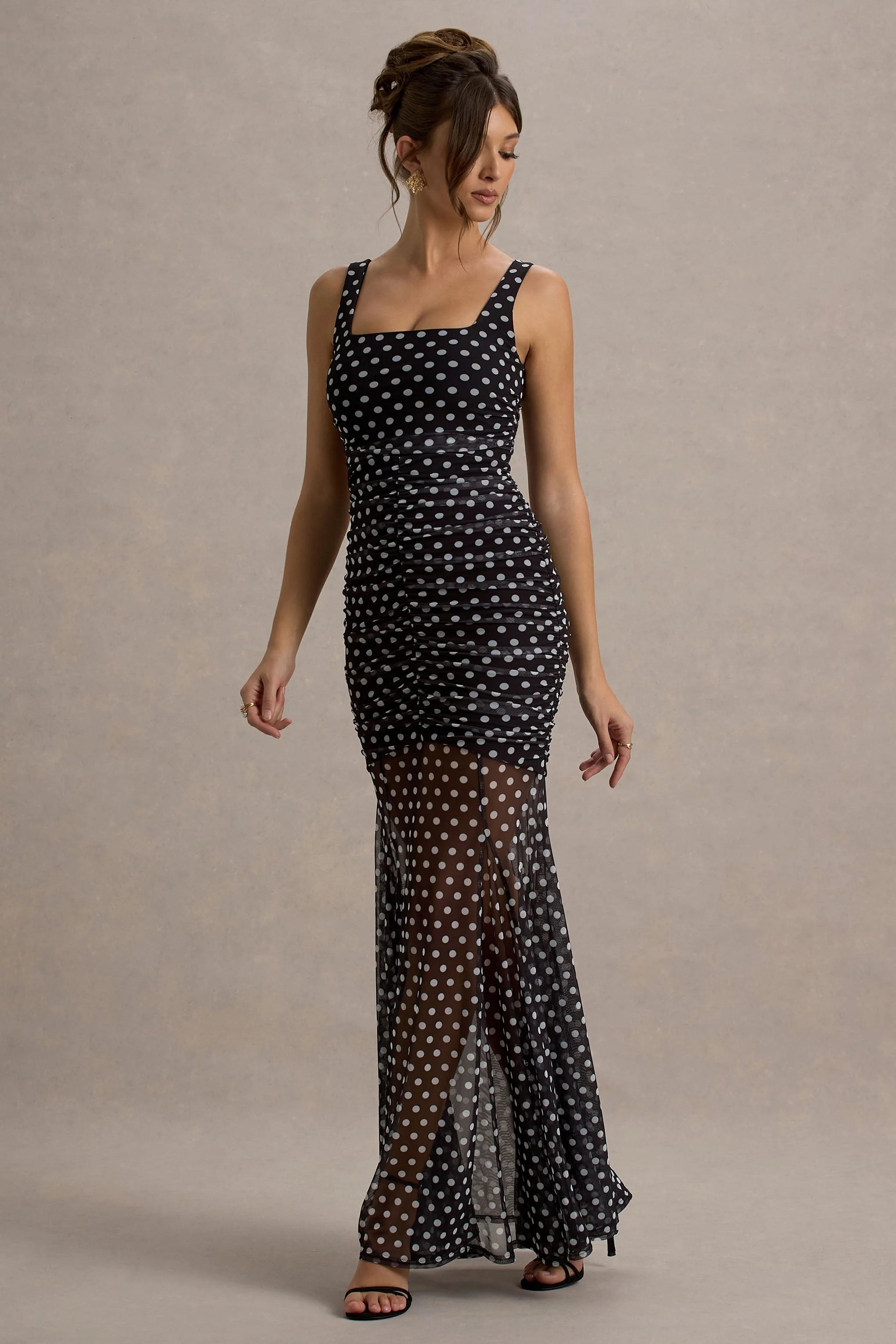 With the season's sweetest black & white polka dot pattern crafted from a premium maxi mesh overlay and stretch jersey mini dress, this unique style is perfect for every occasion on your social calendar.