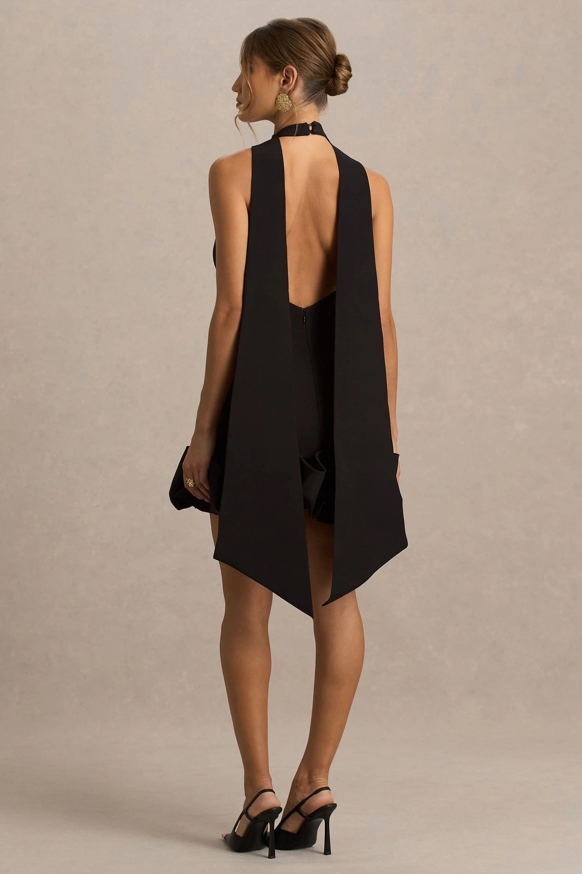 Effortlessly chic with a playful edge, Geneve is a style designed to make an entrance. Crafted from our premium black crepe, this mini dress balances sophistication with allure for a standout look. A sleek halter neckline is elevated with a flowing scarf detail, while the daring V-shape open back adds a touch of drama. Finished with a voluminous puff hemline, this design is perfect for evenings that call for glamour with a modern twist.