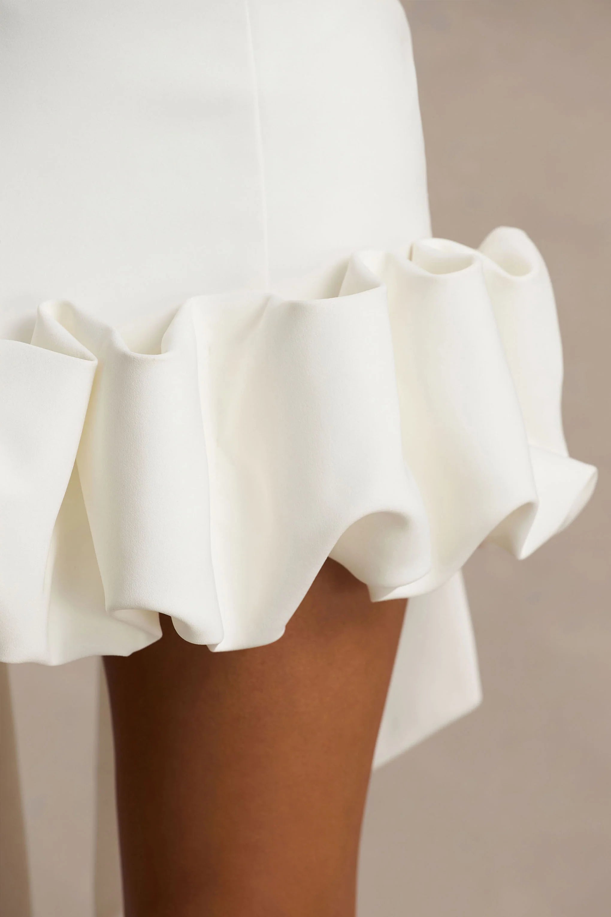 Effortlessly chic with a playful edge, Geneve is a style designed to make an entrance. Crafted from our premium white crepe, this mini dress balances sophistication with allure for a standout look. A sleek halter neckline is elevated with a flowing scarf detail, while the daring V-shape open back adds a touch of drama. Finished with a voluminous puff hemline, this design is perfect for evenings that call for glamour with a modern twist.