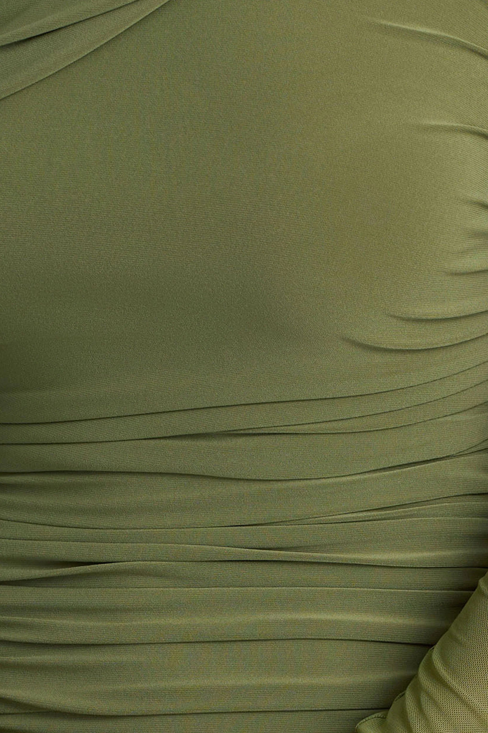 Introducing Velvetine, a striking piece made to steal the spotlight. Crafted from our premium olive stretch jersey, this mini hugs your curves while offering a flattering, figure-enhancing fit. The asymmetric neckline and long mesh sleeves add modern elegance, while ruched detailing accentuates your silhouette. Velvetine is perfect for nights when you want to make an unforgettable entrance.