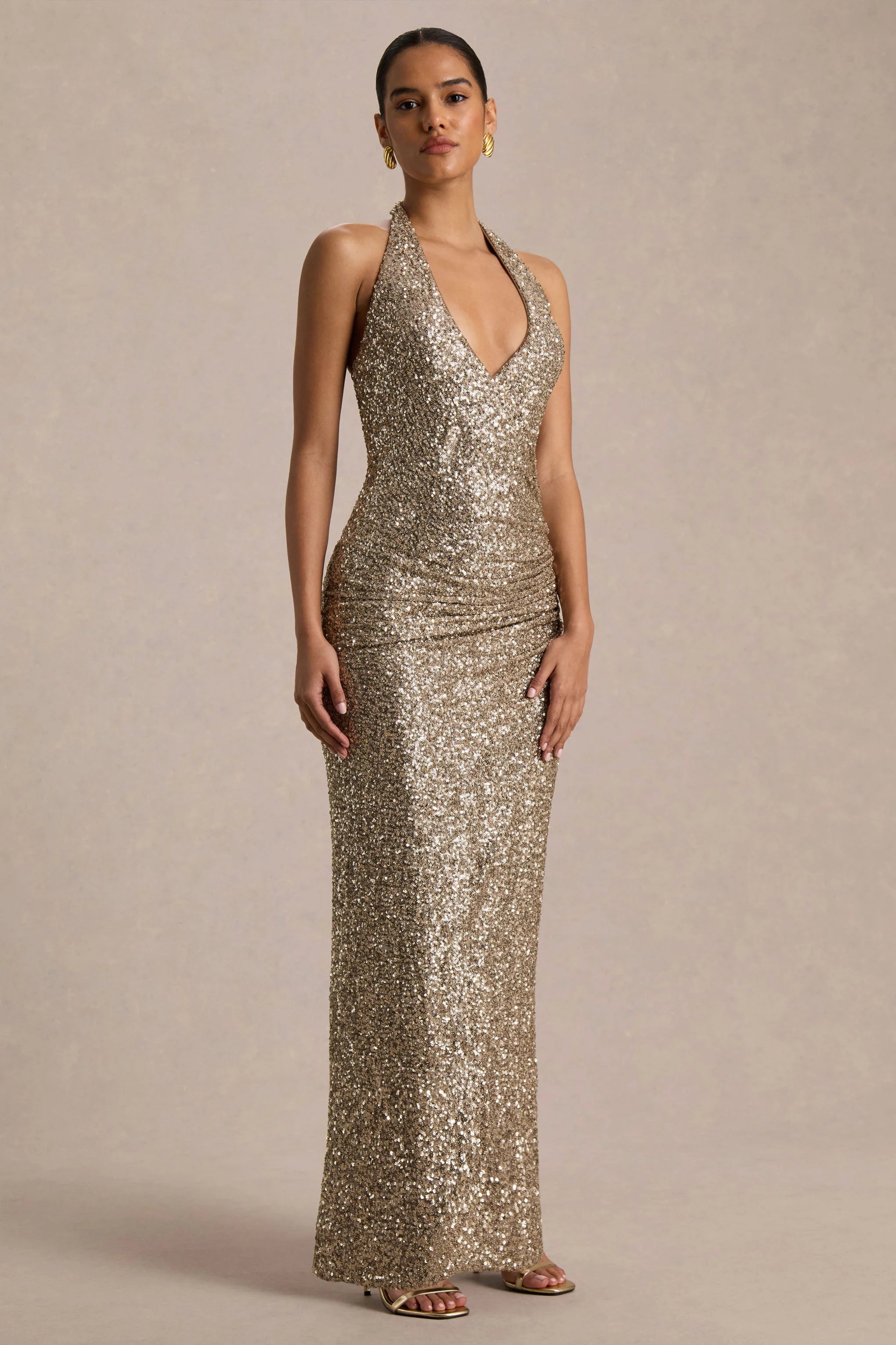 Gio is the ultimate show-stopper, made to turn heads from every angle. Crafted in our premium champagne sequin, this maxi dress glimmers with every movement, flattering your silhouette with a sleek fit. The plunge neckline and gathered detailing highlight your curves, while the open back and delicate tie-back detail add a touch of daring elegance. Gio is the perfect choice for making a sparkling, unforgettable entrance.