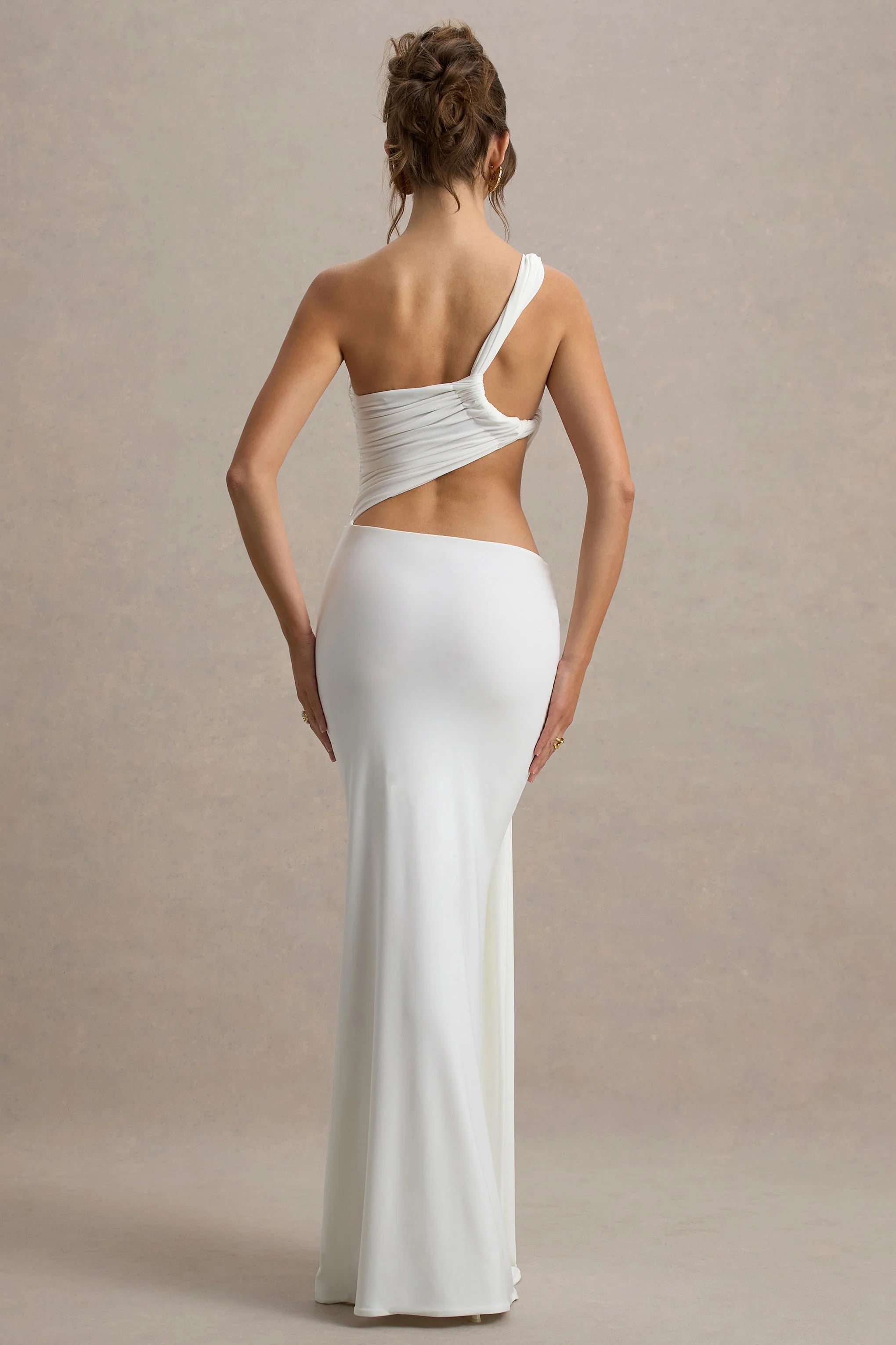 Create a lasting impression in Giovanna. Cut in our premium jersey in a striking white hue, this maxi features a mesmerising asymmetric neckline and intricate cut out details. Style this immaculate floor sweeper with stilettos for the perfect holiday dinner look.