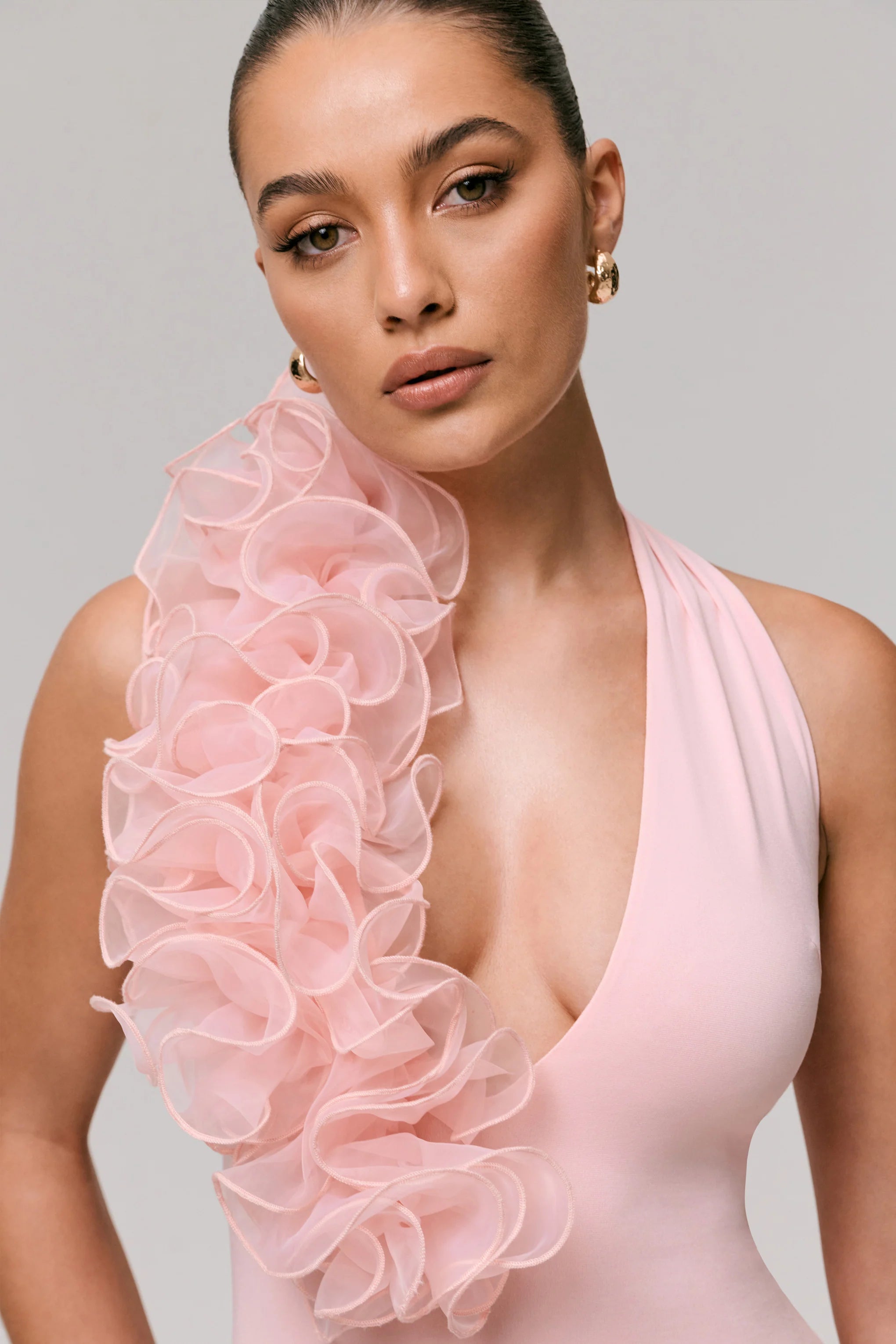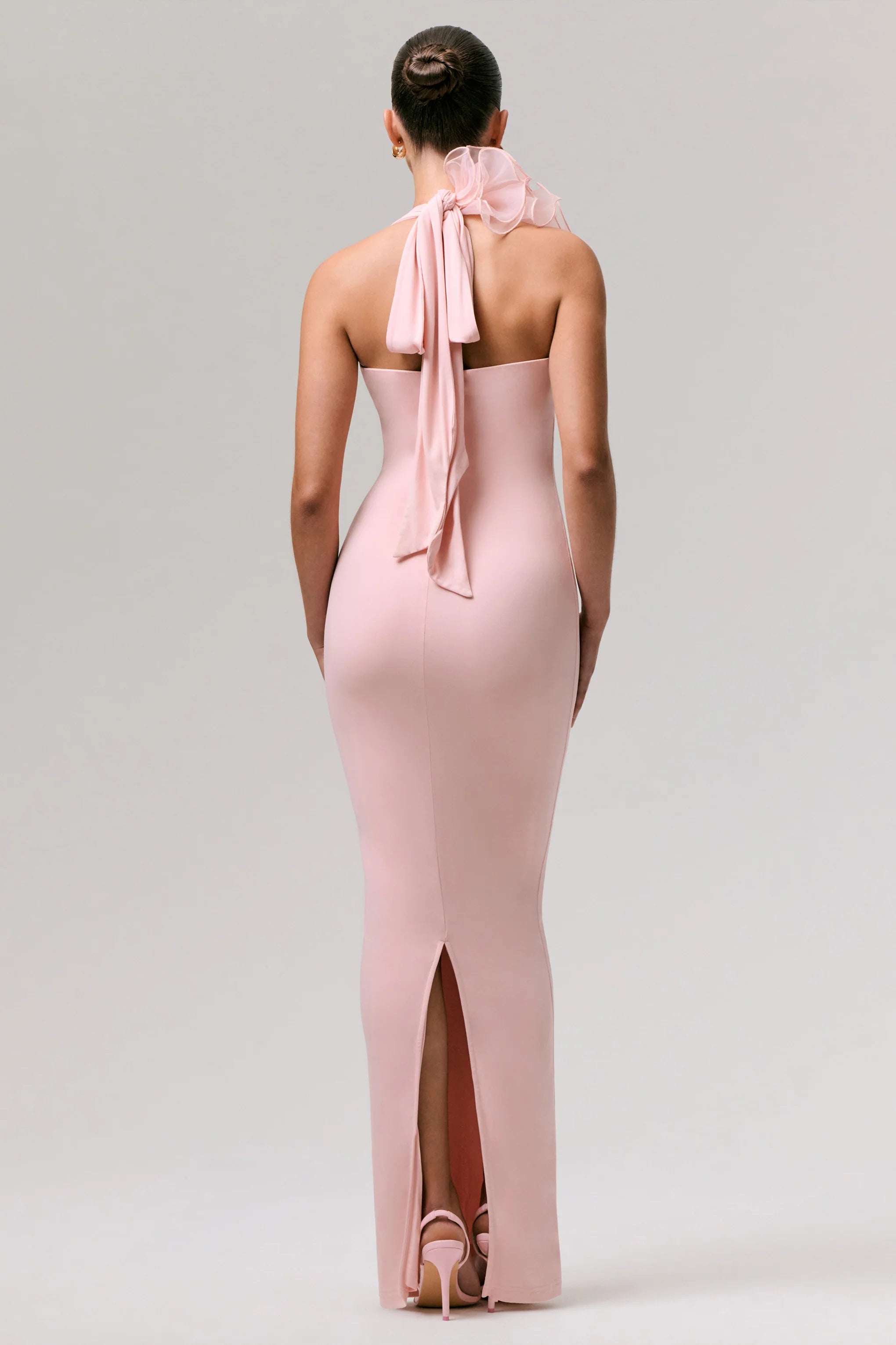 Radiate elegant femininity in our Harriet maxi. Curated in a soft pink hue of our sleek premium stretch jersey, this gown contours all your curves and sculpts you beautifully. Finished with a daring, extreme-plunge neckline that is complimented with a delicate floral detail. The functional neck tie not only ensures a perfect fit, but adds a statement bow detail at the back. Harriet is perfect for any occasion where you want to stand out.
