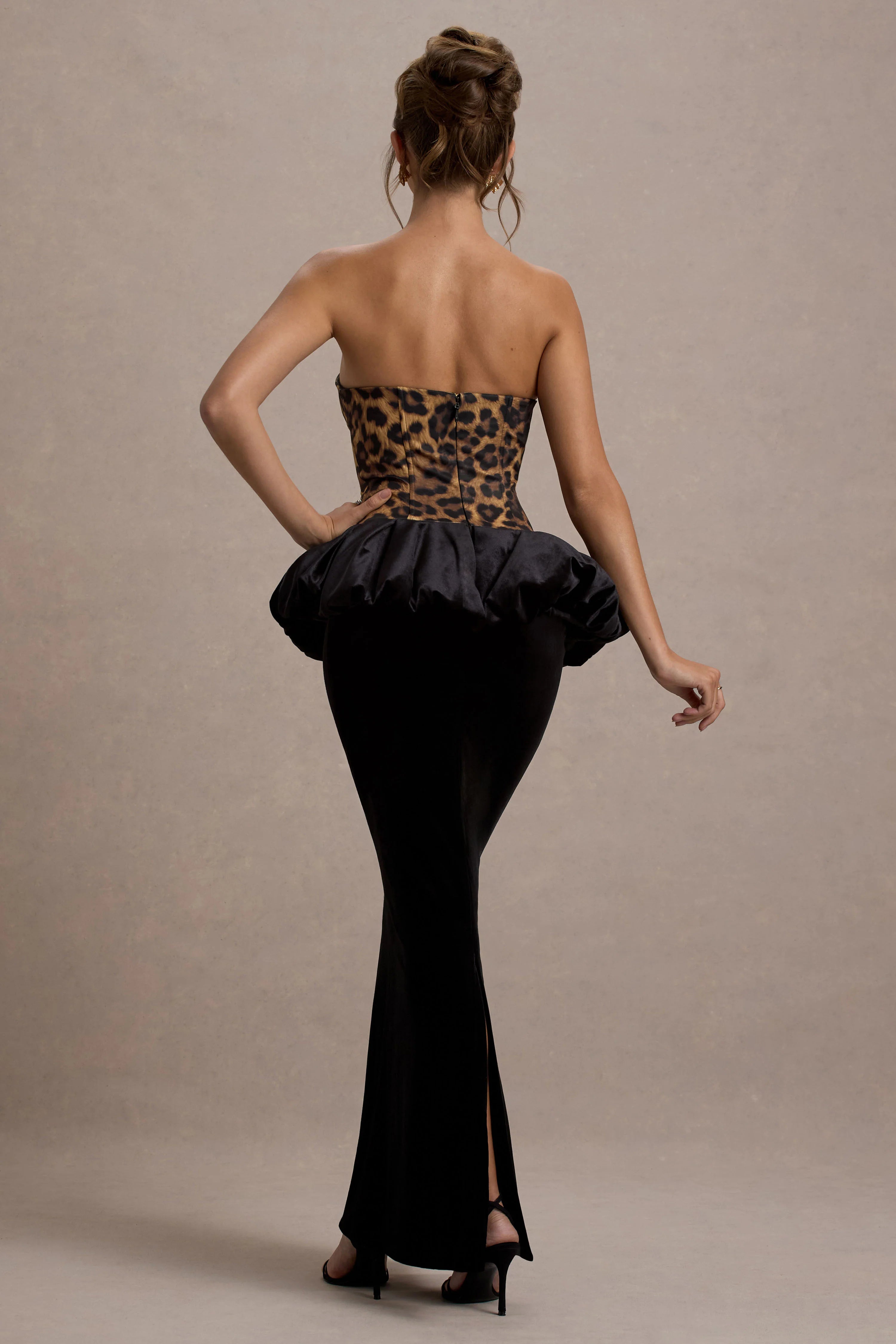 Party season calls for a lavish dress like Harriette. Irresistibly captivating, this leopard print floor-sweeper boasts a boned corset bodice, peplum waistline and long, velvet skirt. For a luxurious black tie ensemble, compliment yours with a sleek bun and some sparkling accents like Glimmery.