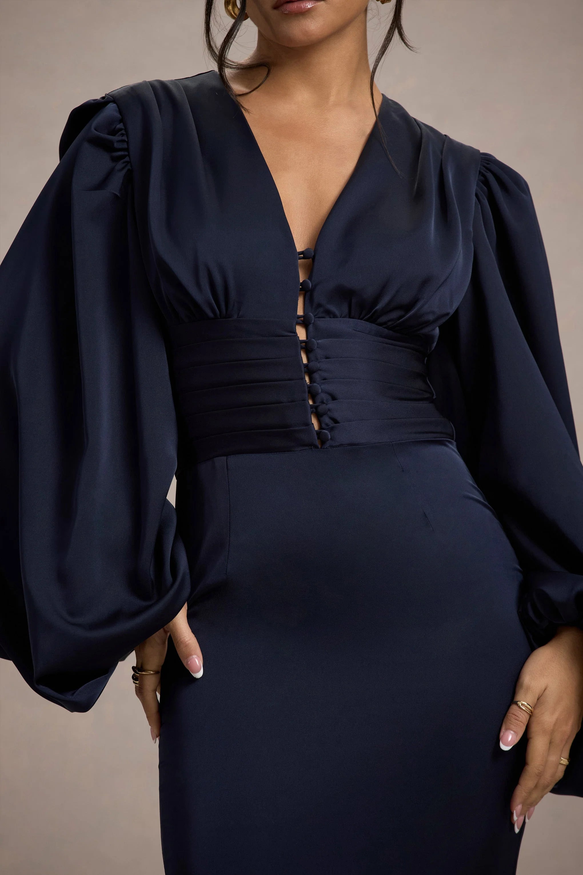 A stand-out staple, Helsinki is on everyones wish list this season. Designed in a sumptuous navy satin, this maxi dress is detailed by a timeless plunge neckline, billowy balloon sleeves and dainty self-covered buttons. Complete with a flattering waist panel, Helsinki is proof that simple silhouettes can have the most impact.