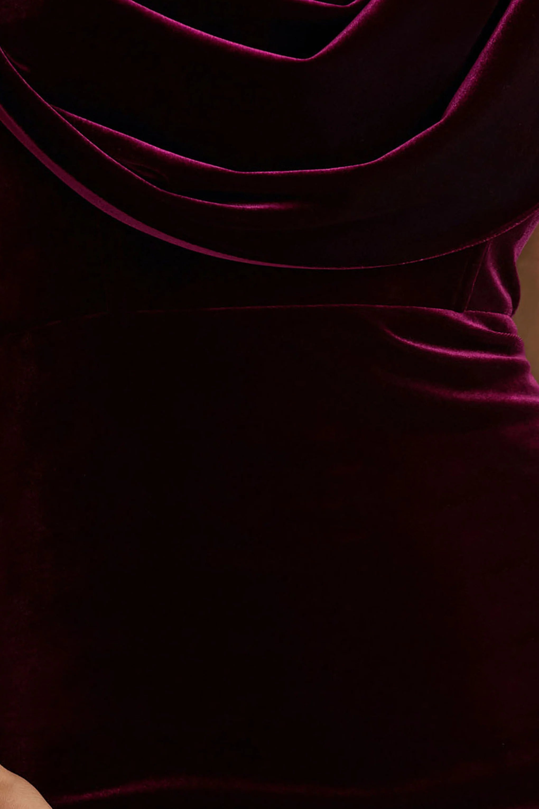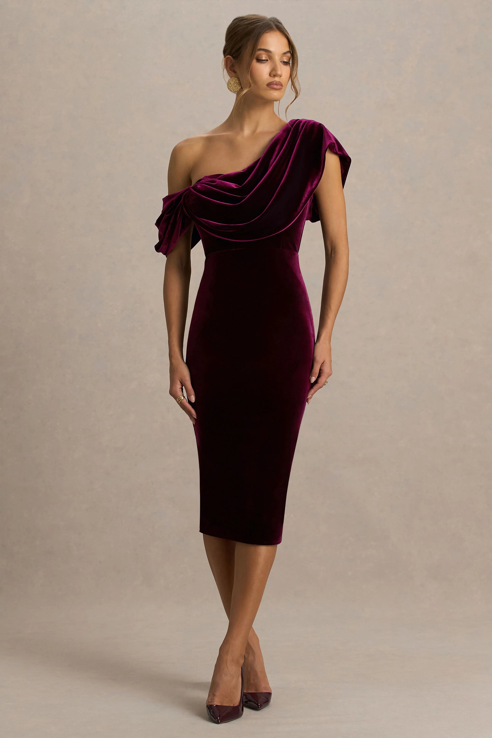 Sophistication meets allure in High End, a head-turner for your next special occasion. Crafted from our premium velvet, in a bold burgundy hue, this midi skims the figure for a flattering, refined fit. The draped asymmetric neckline adds an elegant edge, while a centre-back split adds subtle drama and allure. Designed for evenings that call for timeless glamour with a modern and feminine feel.