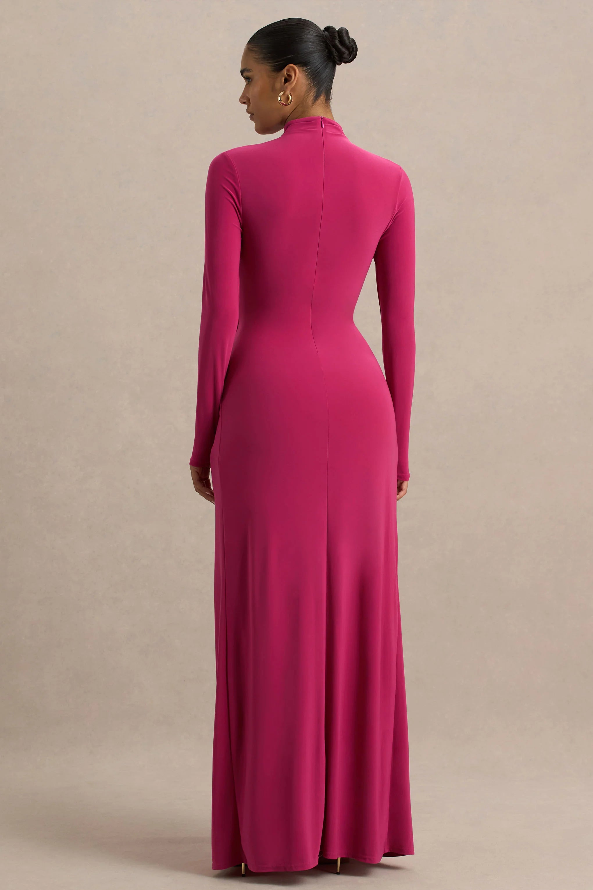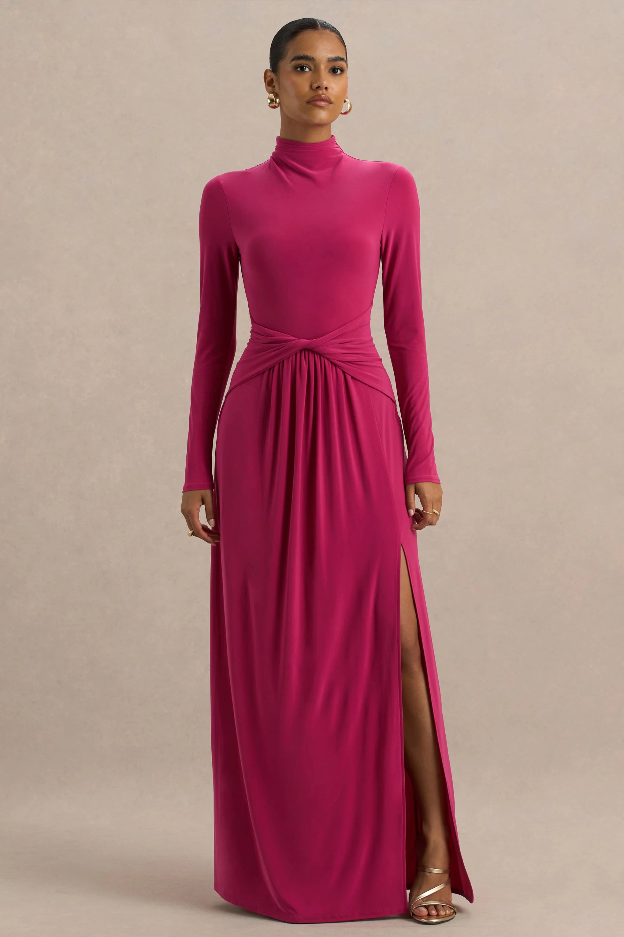 Understated glamour meets bold elegance in our Hourglass dress. Crafted in a bold hot pink hue of our premium stretch jersey, this maxi dress is designed to sculpt your curves seamlessly. Featuring a chic high neckline and an alluring wrap-waist detail, that enhances your silhouette from every angle. Finished with a daring front-high split for a touch of drama. Style Hourglass with sleek heels and gold jewellery, for a look that will turn heads.