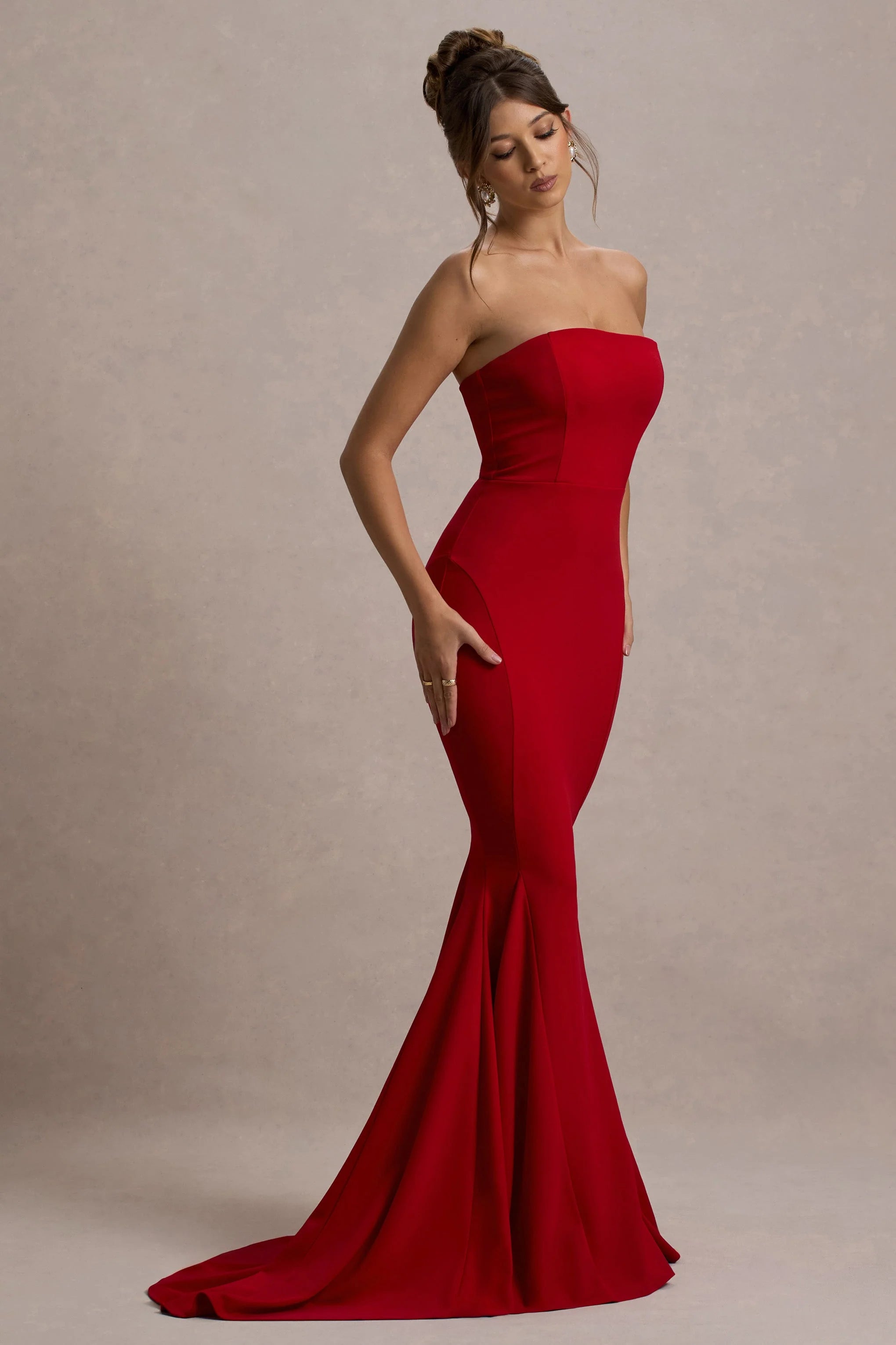 Dress to impress at your next black tie event in our aptly-named red maxi. Impress Me arrives in a premium stretch crepe fabric and is detailed by flattering panels for a curve-hugging fit. Accompanied by a pair of strappy stilettos, this fishtail dress would make the perfect piece for weddings, prom and everything in between.