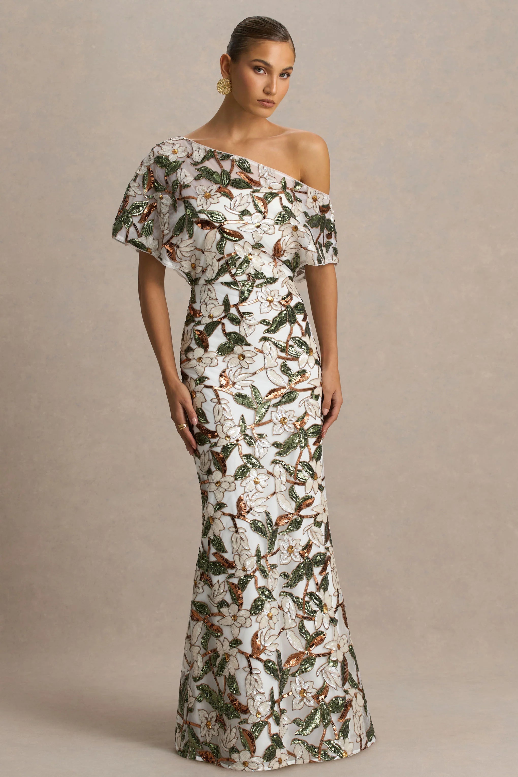Step into unforgettable glamour with Iony, a show-stopping maxi designed for special occasions. Crafted in our premium embellishment and mesh, this maxi-length dress is adorned in a delicate white and green floral design that exudes elegance and femininity. featuring an asymmetric neckline that creates a striking silhouette, perfect for turning heads from every angle. Style Iony with barley there heels and dainty jewellery and let the dress do all the talking.