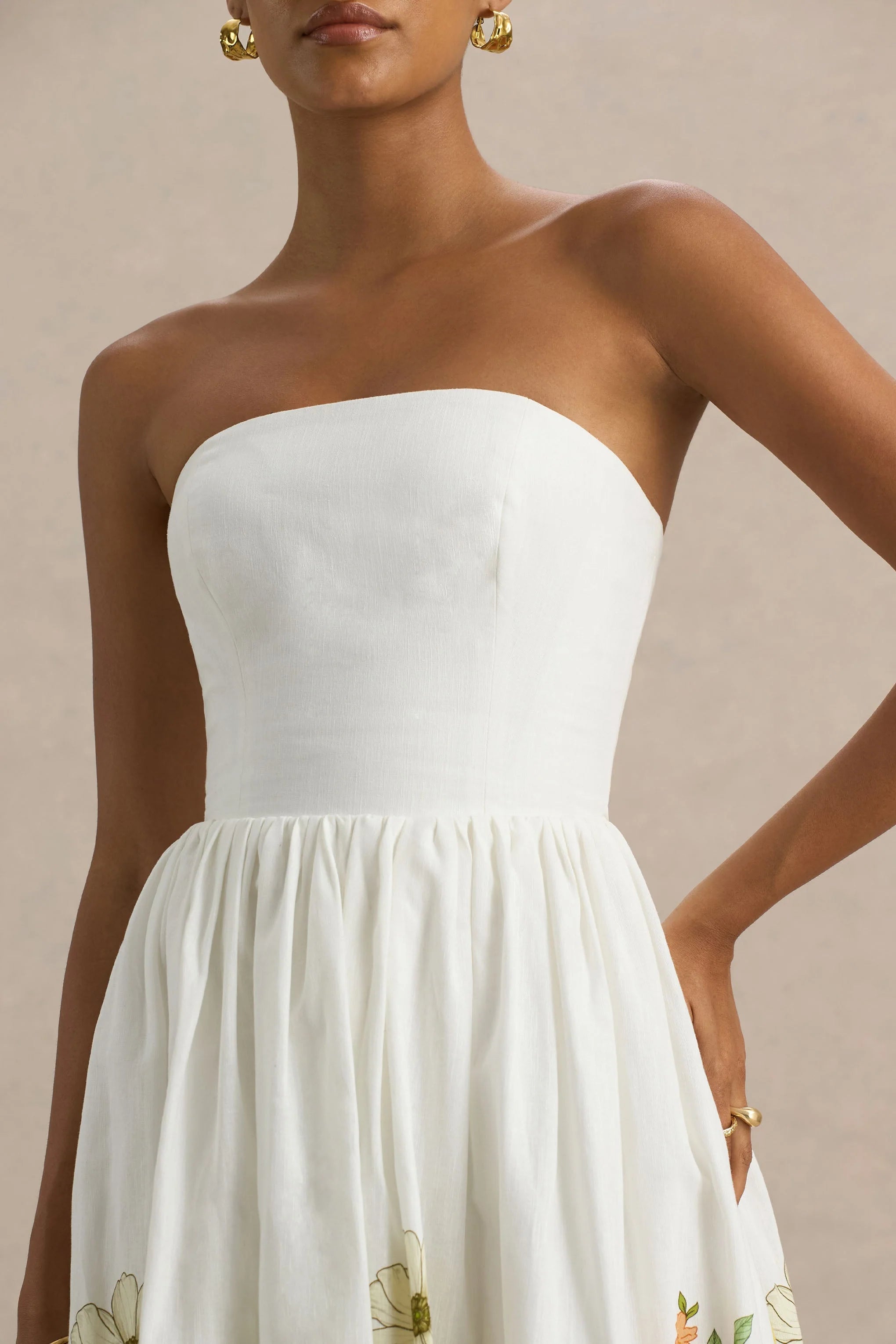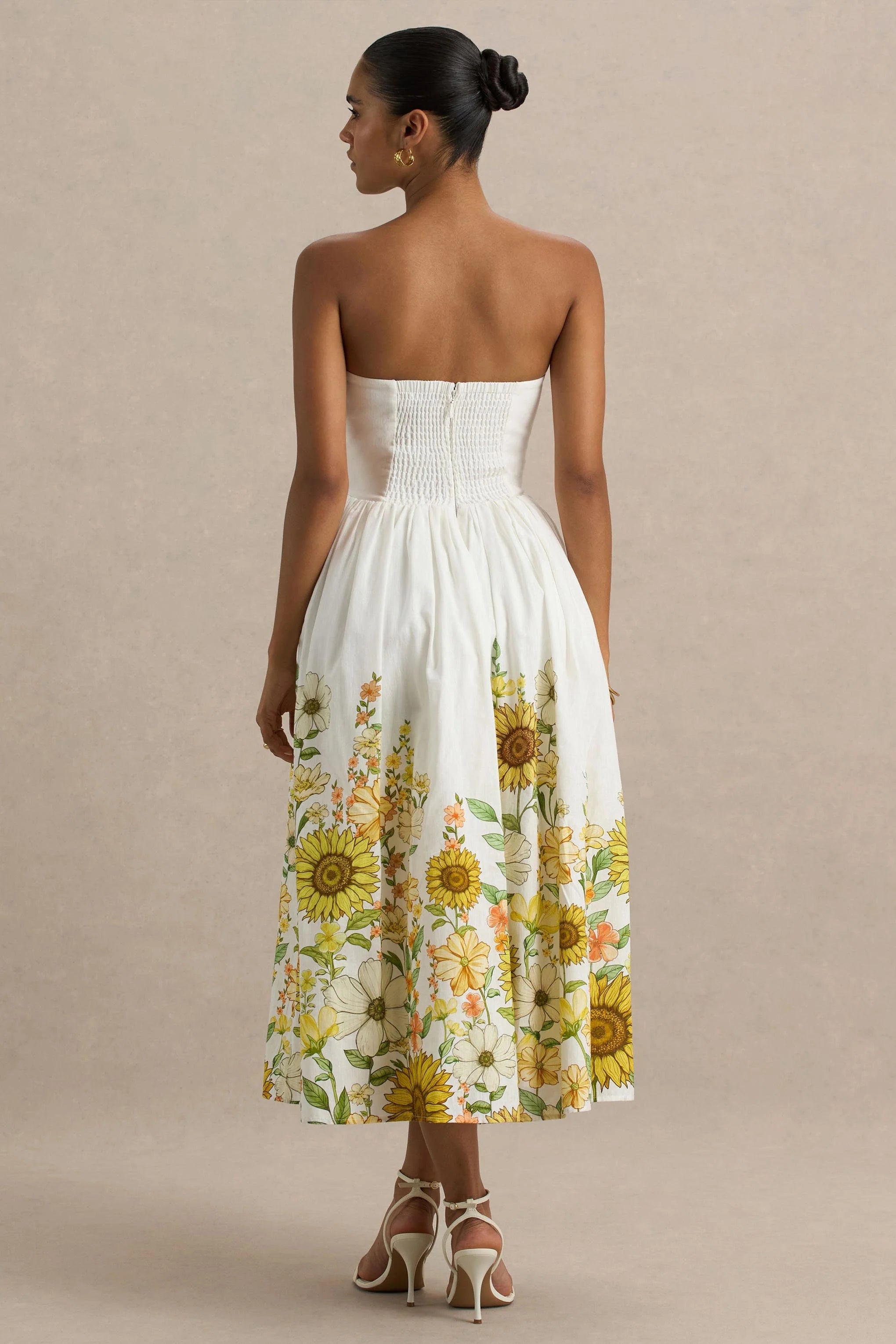 Step into the season with our effortlessly romantic Ivory midi dress, a seamless blend of timeless charm and bold florals. Crafted in our premium linen for a lightweight finish and adorned with a vibrant sunflower print, this eye-catching piece is made for summer moments. The structured bandeau neckline adds a touch of femininity and the corset bodice cinches your waist to perfection. Finished with a gathered volume skirt that brings a dramatic edge, Ivory makes an elegant statement in any room. From garden parties to sunset dinners, in this dress you will exude confidence and glamour.