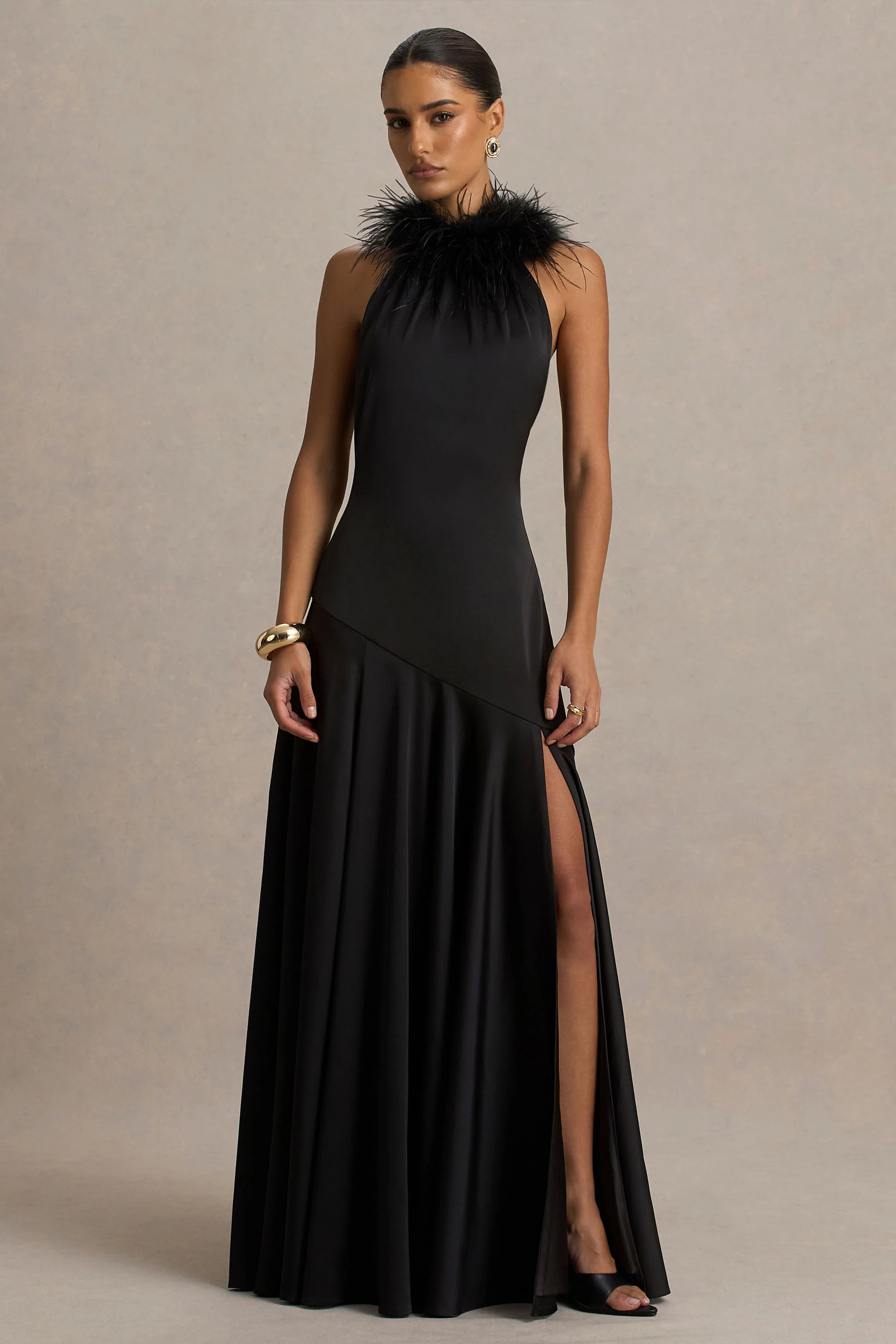 Jemima is the dress that brings high-octane glamour to every occasion. Crafted from our premium black satin, this maxi dress drapes fluidly for a sleek silhouette. The halter neckline is finished with a feather trim for a head-turning touch, whilst the asymmetric waist adds sculpting detail. A daring front split completes the look, making Jemima a statement in modern sophistication.