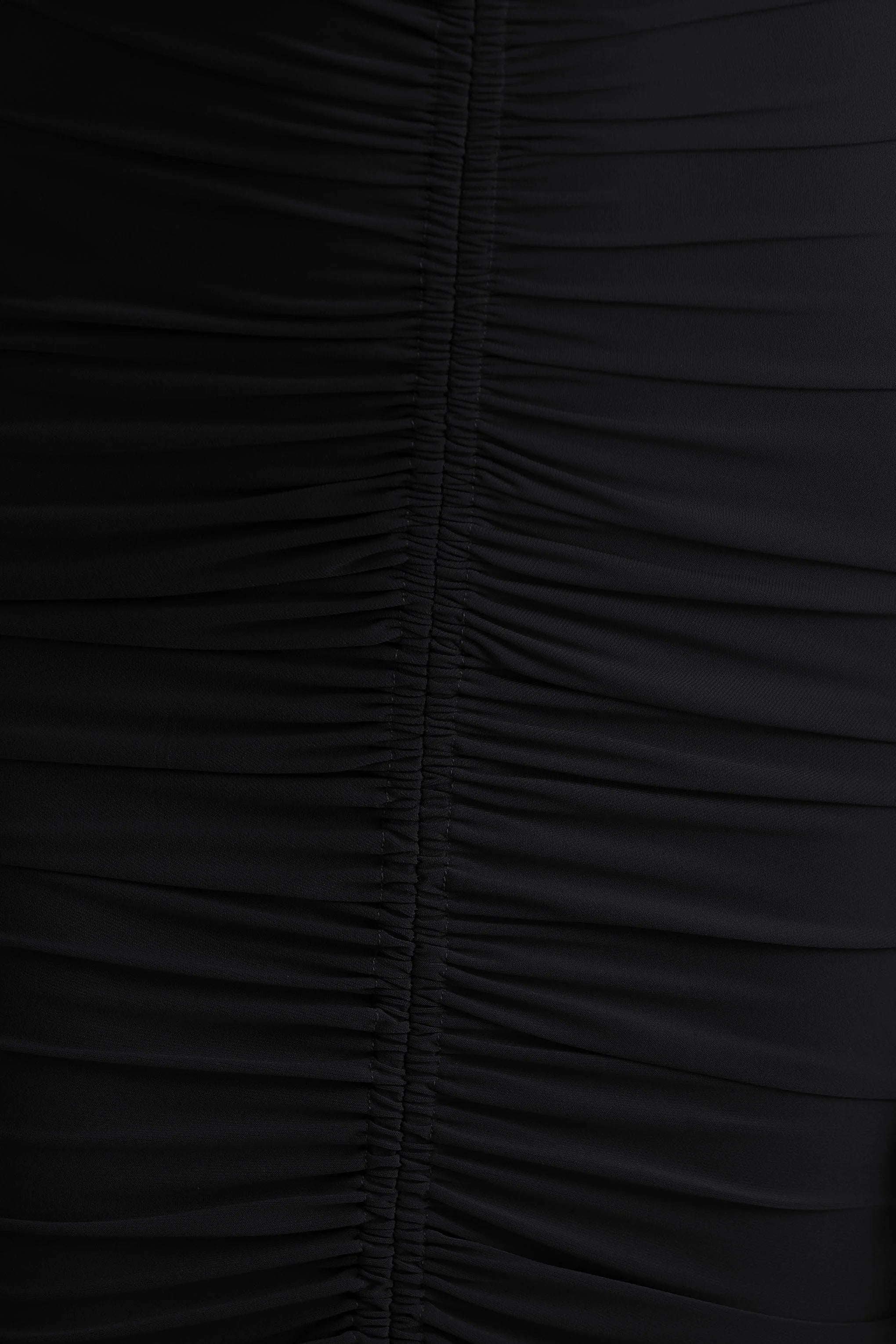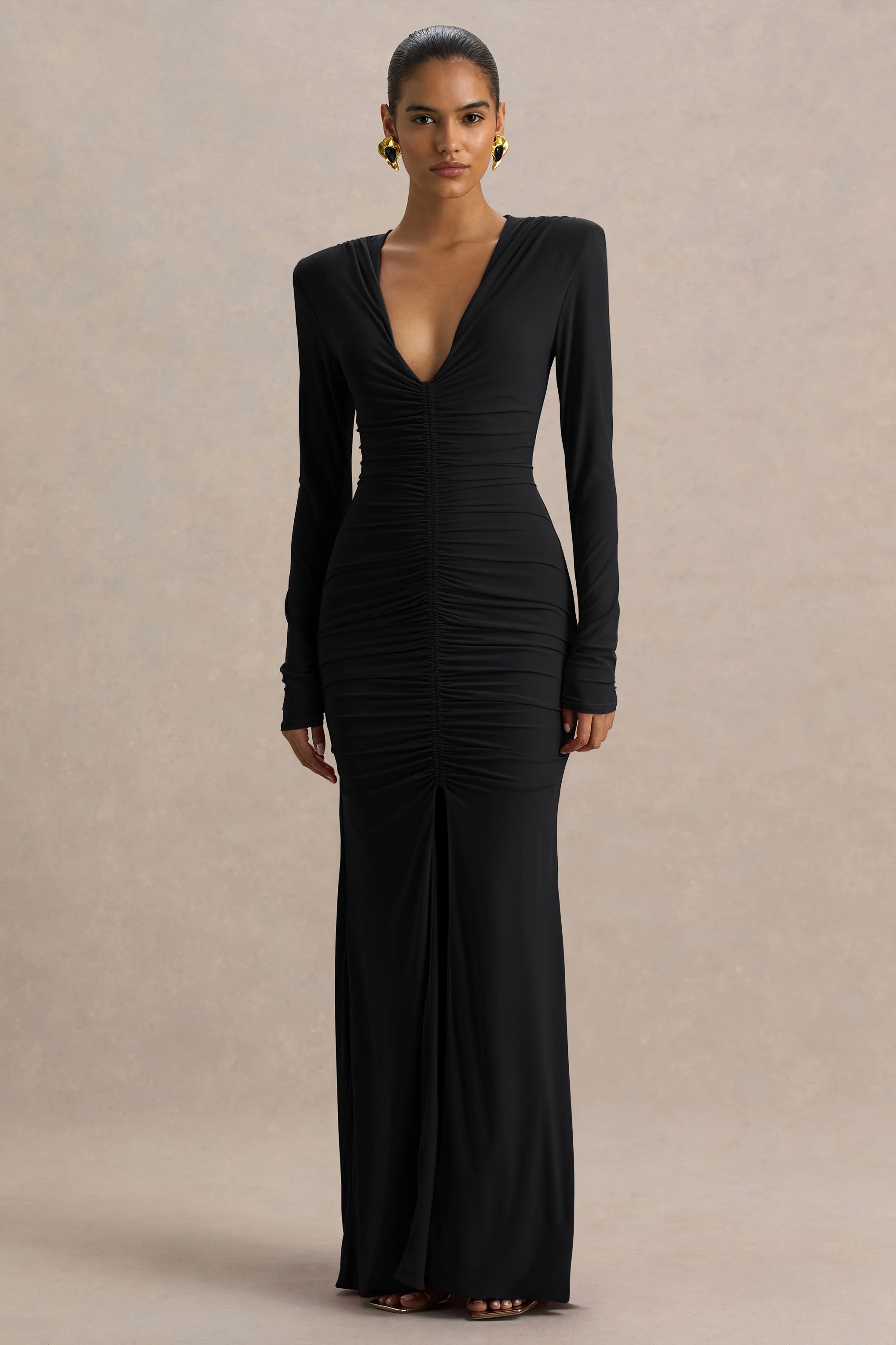 Introducing our latest show-stopped, Jewel. Cut from our premium stretch jersey in a striking black hue, this sculpting maxi hugs every curve while offering a sleek, floor-sweeping silhouette. With a sultry plunge neckline, elegant long sleeves, and flattering ruched detailing, this dress is all about refined glamour. The high-front split adds a bold finishing touch, making Jewel your go-to for unforgettable entrances.