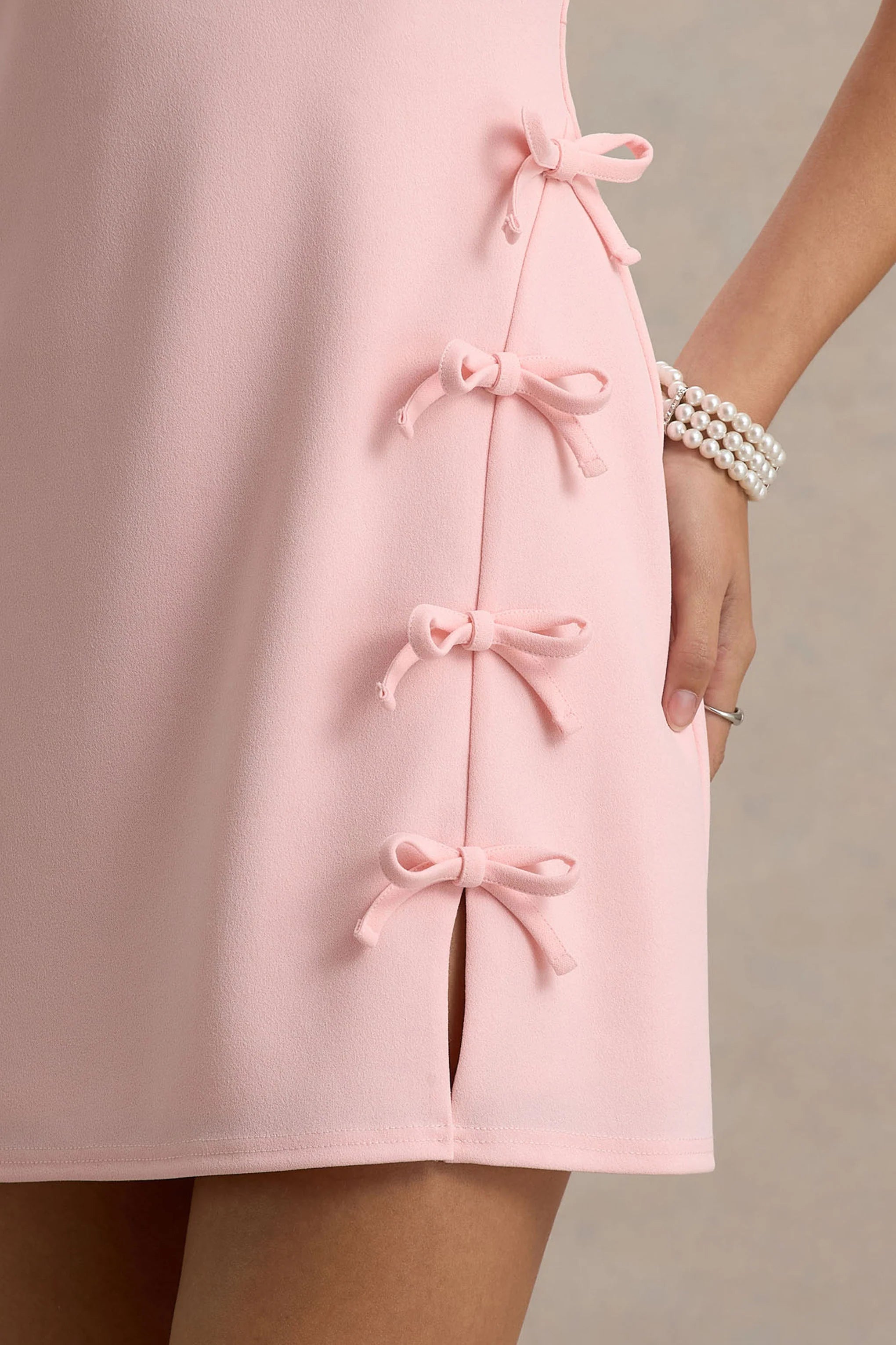 Steal the spotlight in Kalina, the ultimate show-stopping mini designed to make an impact. Crafted from our luxurious blush pink scuba crepe, this figure hugging dress smooths and sculpts for a flawless silhouette. The scoop neckline flatters the decolletage, while the leg split adds a daring touch. Finishing the look, bow details on the skirt bring a playful yet elegant twist, making Kalina the perfect choice for your next night out.
