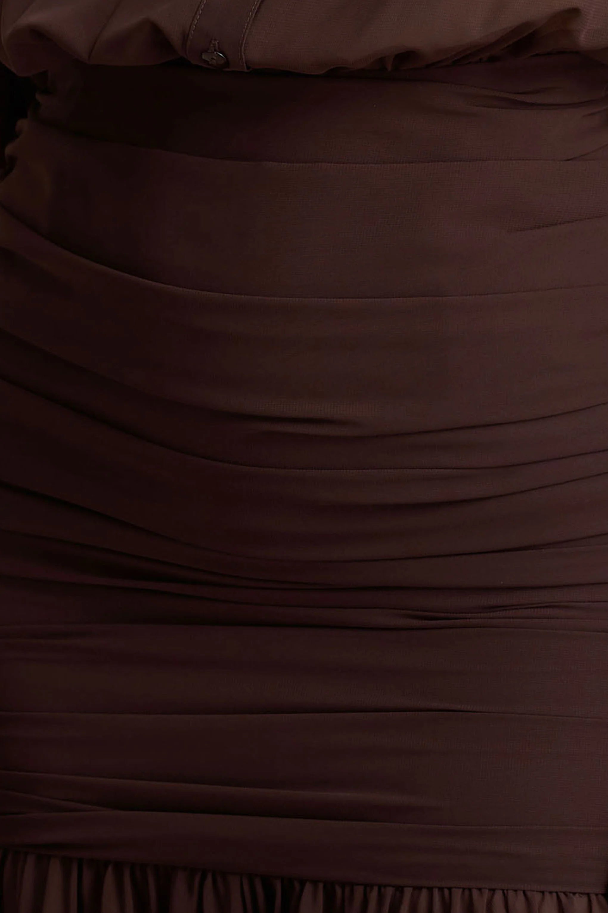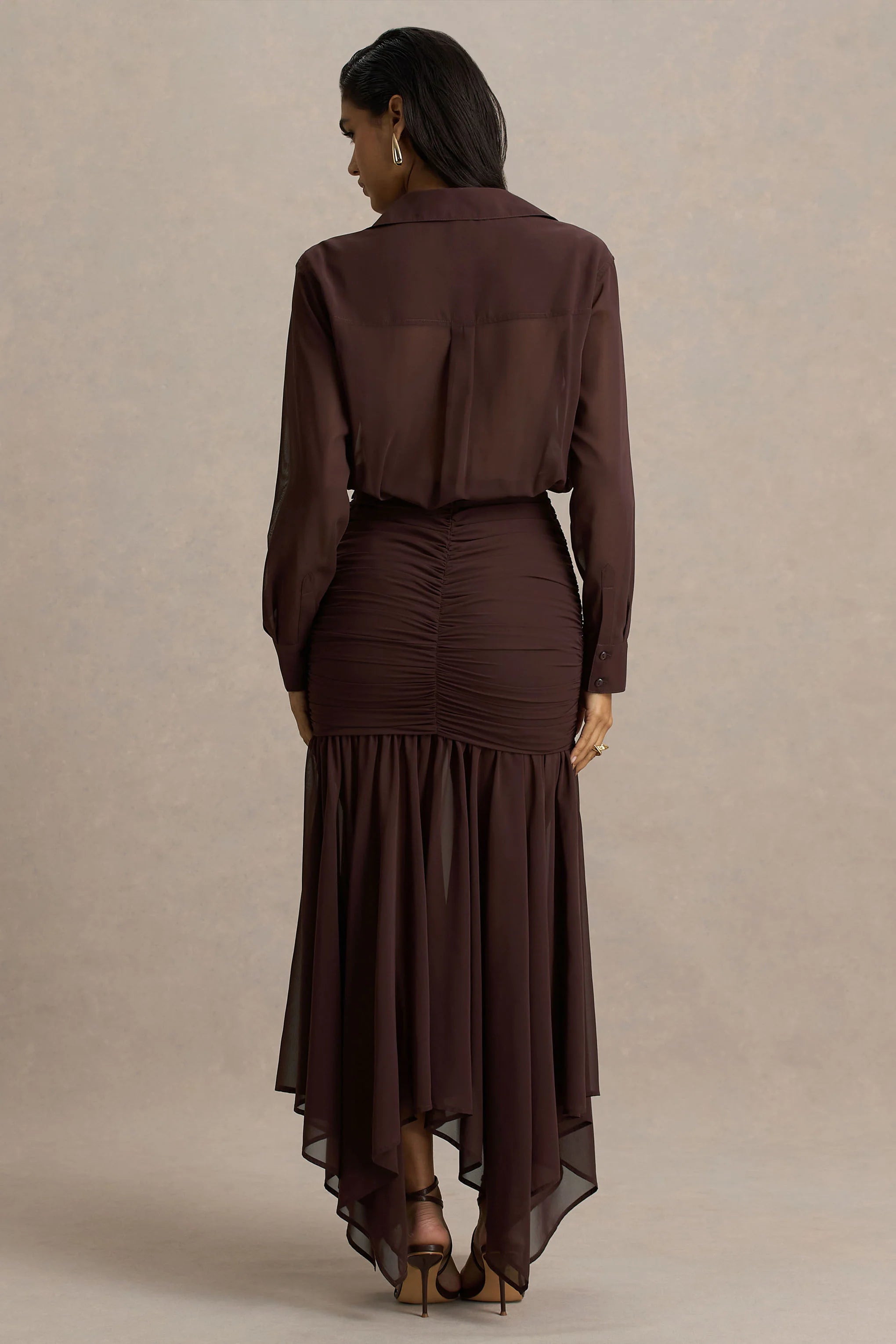 Own the spotlight in Kris, a flowing silhouette with a sultry edge. Crafted from our premium brown chiffon in a sweeping maxi length, it moves with grace and ease. The plunge neckline and sharp collar bring a tailored touch, while ruched detailing flatters the waist and adds soft definition. Finished with a hanky hemline for dramatic movement, Kris is made for glamorous evenings, special occasions, and every moment in between.
