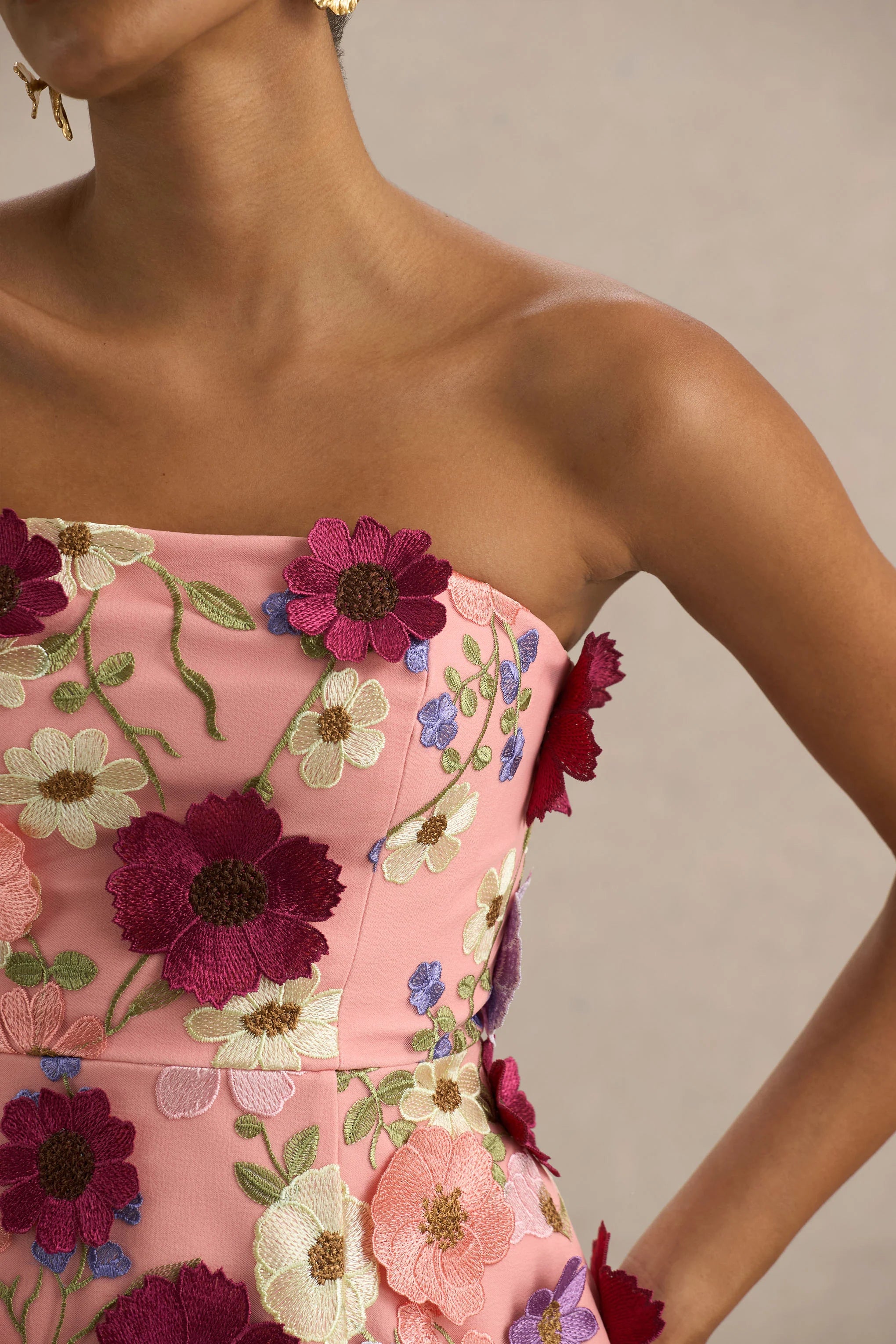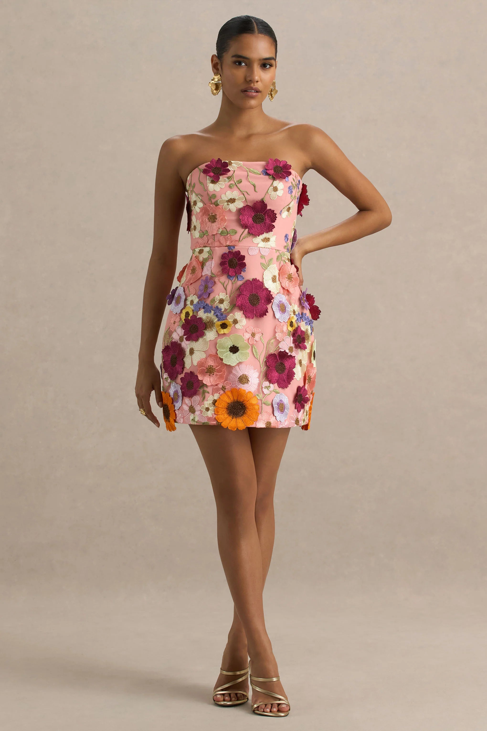 Be prepared to turn heads in our bold Kristen mini. Curated in a blend of our premium stretch crepe and our pink 3D floral fabric, this intricate design will captivate any room you enter. The feminine bandeau neckline elegantly displays your decolletage, whilst the boned bodice provides gorgeous structure that frames your silhouette seamlessly. From date nights to upscale evening affairs, in this detailed piece you wont be forgotten.