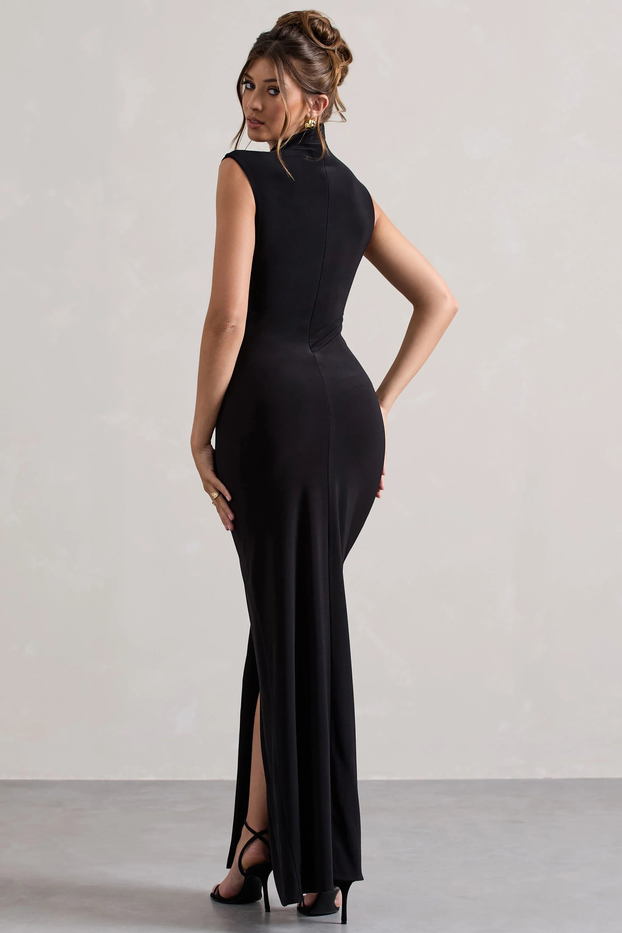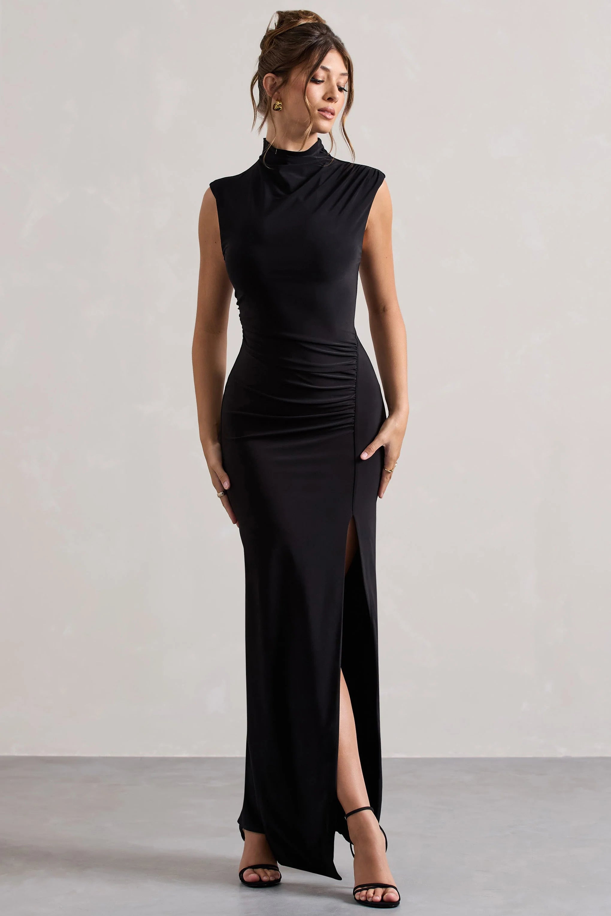 As flattering as it is flawless, captivate from all angles in Lanetta. Crafted in a classic black shade of our premium jersey known for its stretch properties, this curve-enhancer boasts flattering ruching to cinch your natural silhouette. Further enhancing its charm is a delicately tucked high neckline and sultry leg split thats ensured to turn heads at your next event.