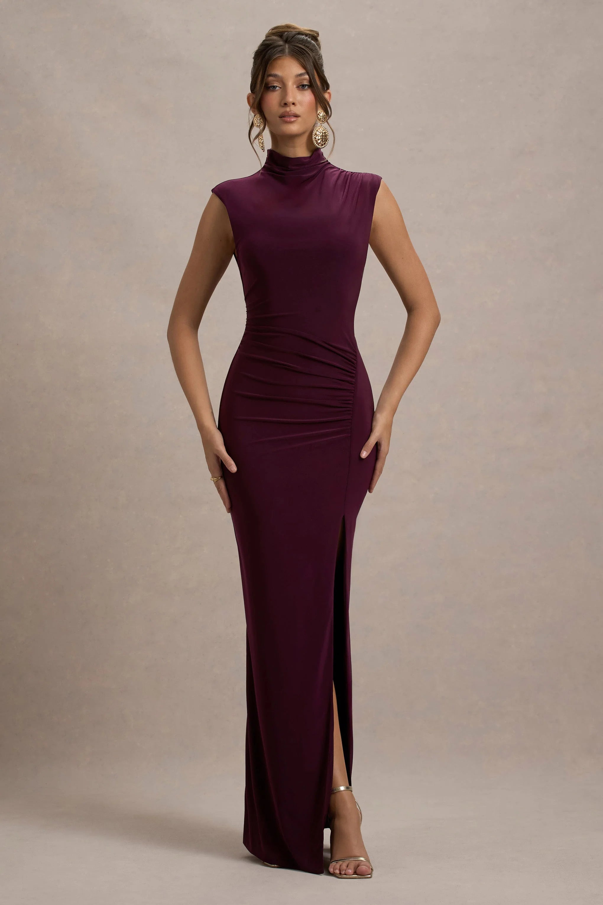 As flattering as it is flawless, captivate from all angles in Lanetta. Crafted in a rich plum shade of our premium jersey known for its stretch properties, this curve-enhancer boasts flattering ruching to cinch your natural silhouette. Further enhancing its charm is a delicately tucked high neckline and sultry leg split that's ensured to turn heads at your next event.
