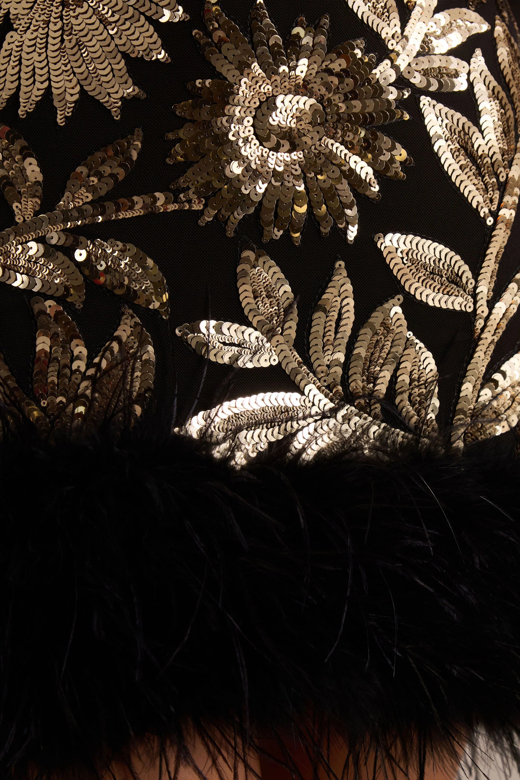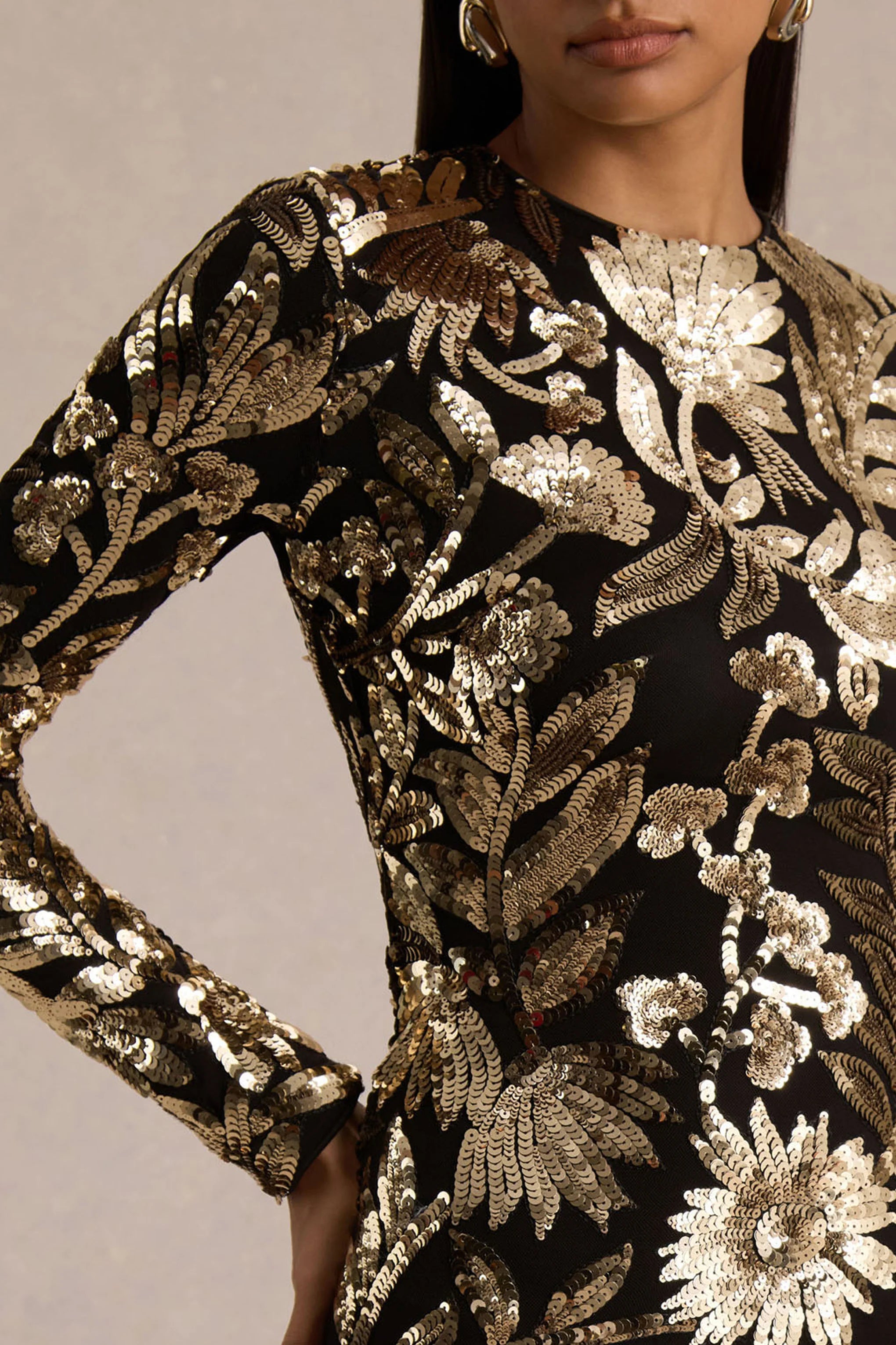 Introducing Lara, the mini that demands the spotlight. Designed in our premium black and gold embellishment, this dress shimmers from every angle while keeping a sleek, body-skimming fit. The crew neckline and long sleeves balance the drama, while a feather-trim hem adds playful, high-glam flair. Lara is made for nights that demand a head-turning entrance.