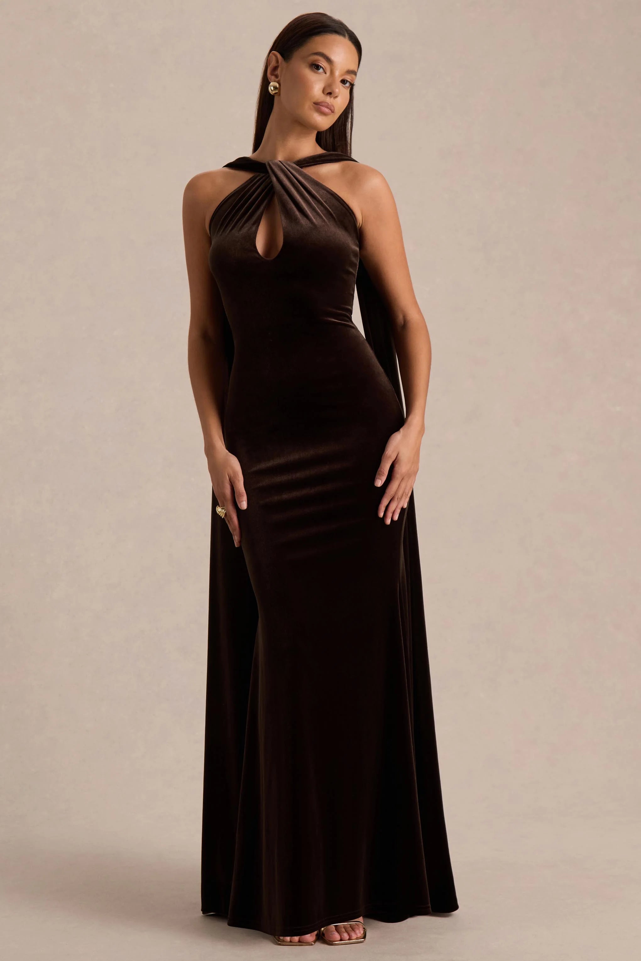 Turn heads in Layli, a sultry statement maxi made to captivate. Crafted from our premium velvet in a rich brown hue, it smooths and flatters your figure with a soft, sculpting fit. Featuring a chic halter neckline and a daring chest cut-out, Layli strikes the perfect balance between sophistication and allure. The elegant back sash detail adds a touch of drama, while the sweeping maxi length ensures a show-stopping silhouette from every angle.
