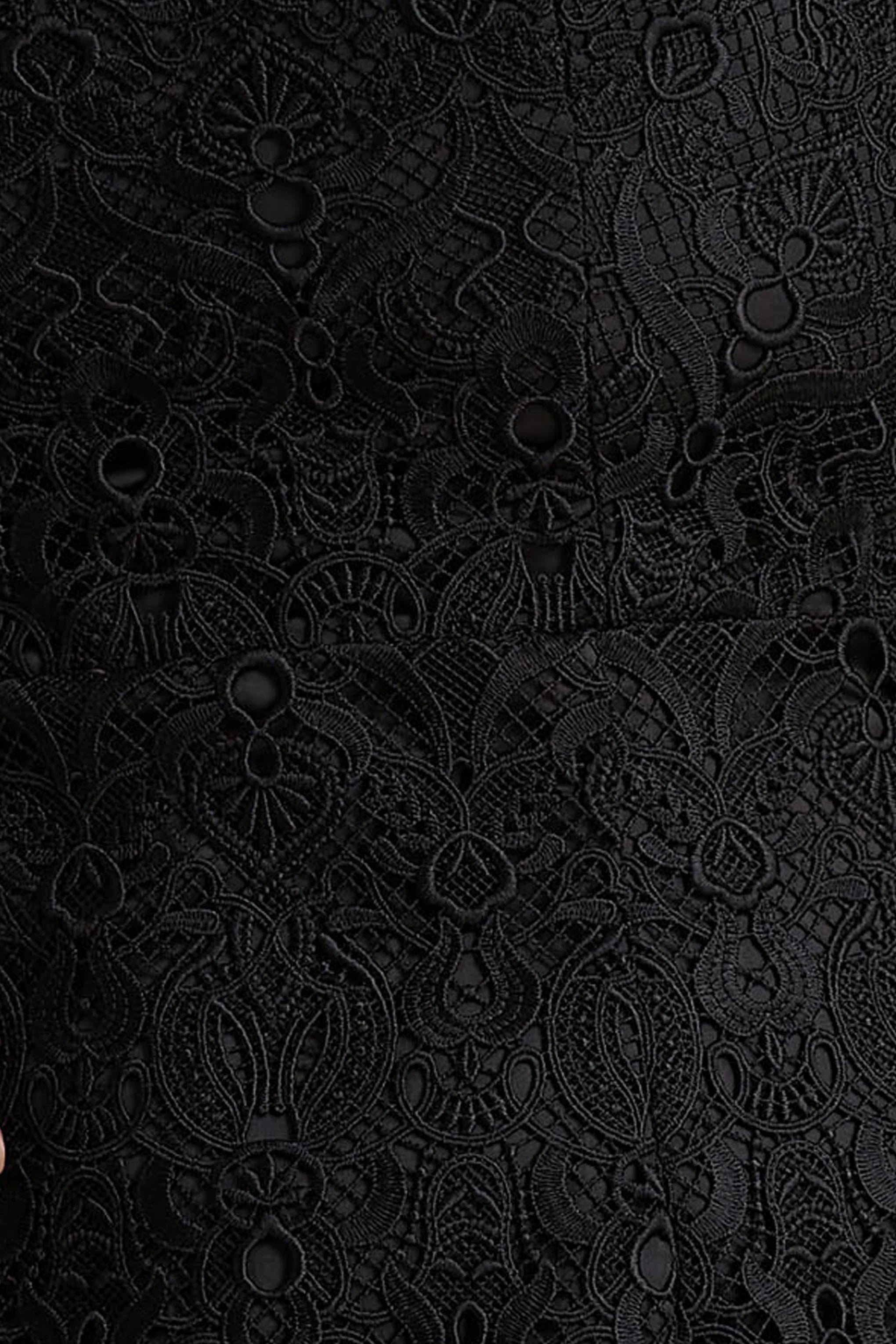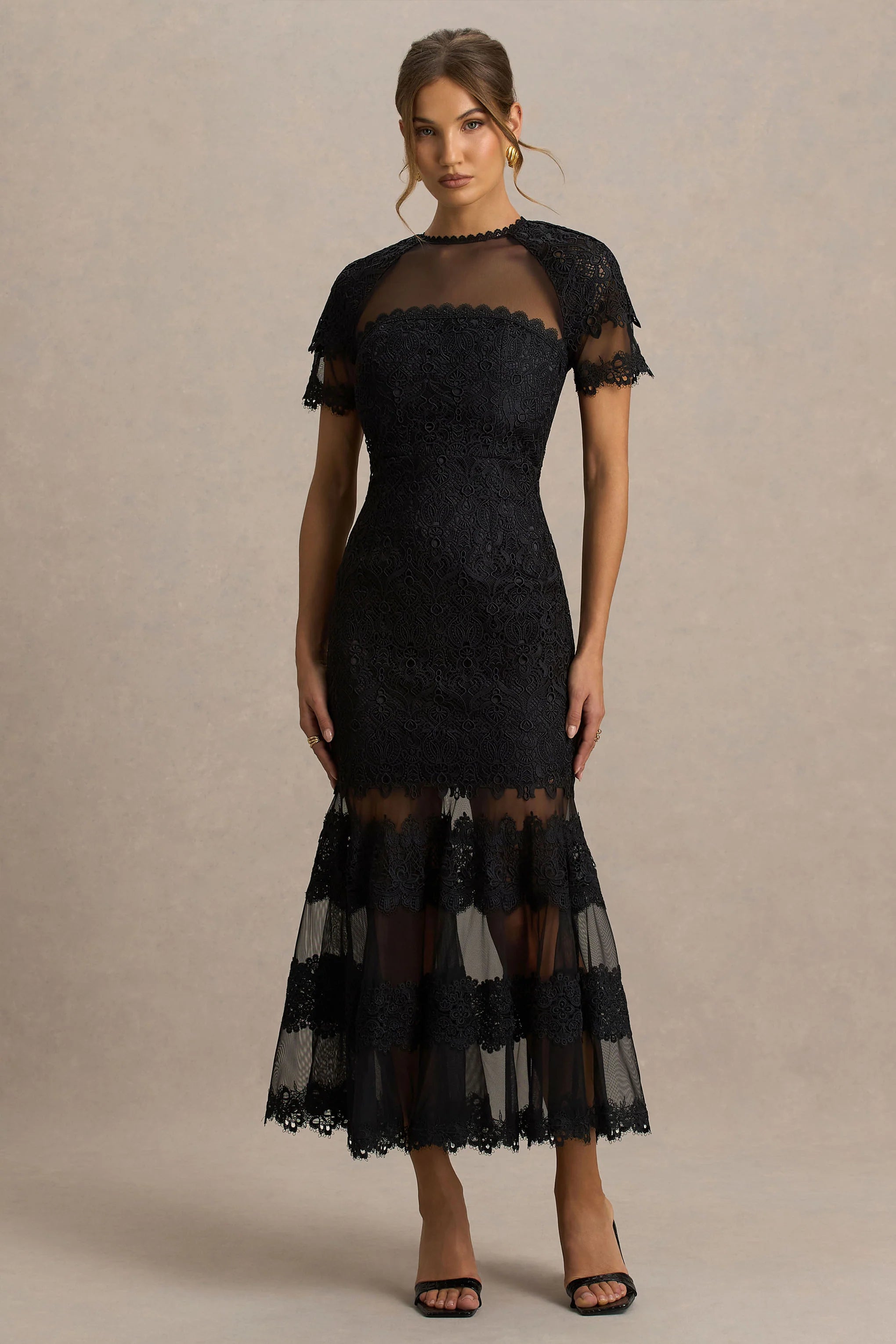 Turn heads with effortless elegance in Leanne, a perfect fusion of sophistication and contemporary charm. Crafted in our premium black mesh and lace, this midi-silhouette skims the body beautifully, offering a flattering and graceful fit. The crew neckline and short sleeves are adorned with delicate scalloped edging, adding a feminine touch, while the scalloped hemline completes the look with subtle, romantic detailing. Ideal for evening occasions or special events, Leanne combines classic design with modern allure.