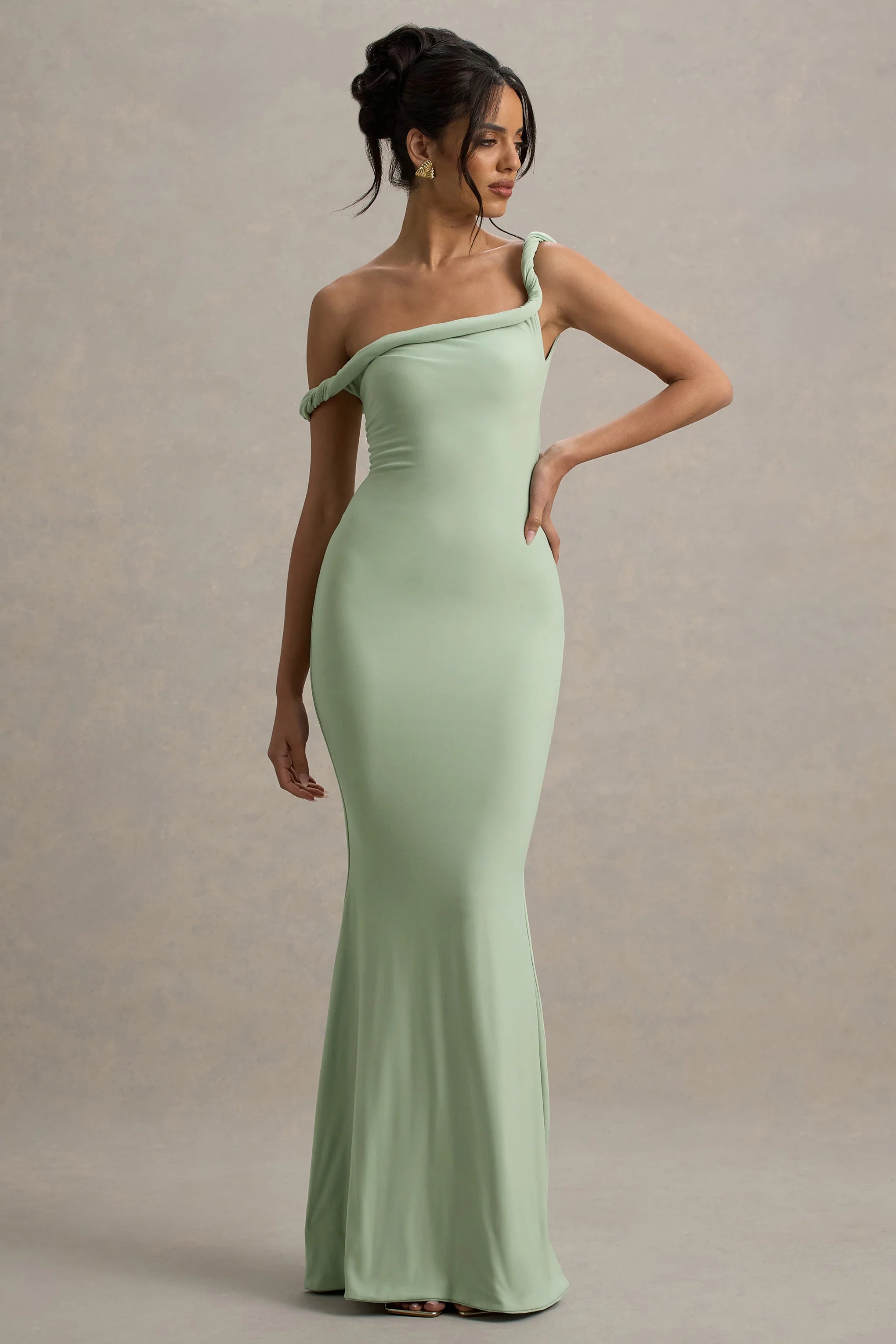 The latest must have maxi of the season is Lita. This maxi dress has been cut in a light green shade of our premium stretch jersey that hugs every curve. Boasting a twisted asymmetric neckline, style this stand-out staple with a tousled bun and some gold accents for a classic look.
