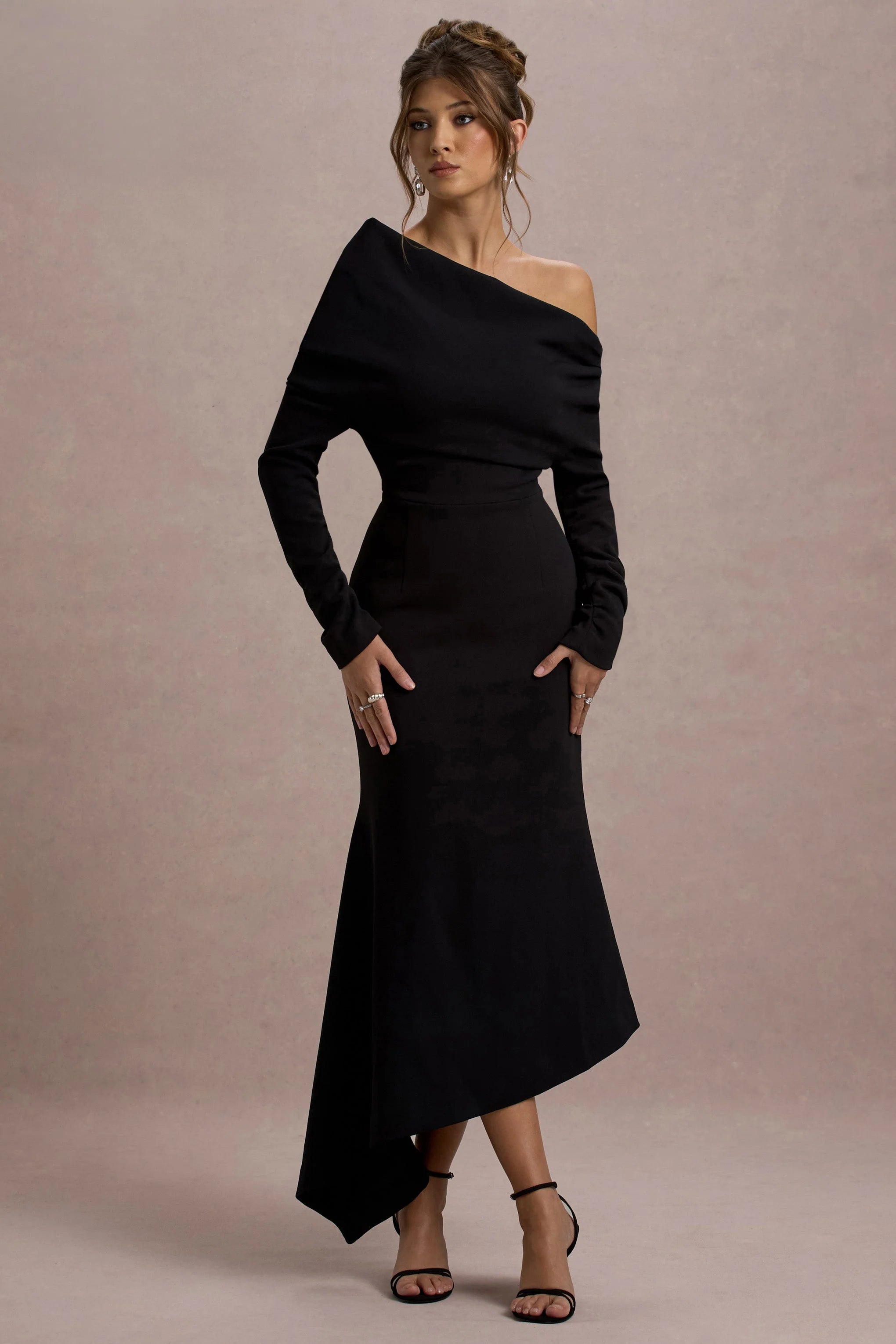 Embrace the wow-factor at every event in our latest black maxi Lou. Presented in a premium crepe, this elegant choice is detailed with a graceful bardot neckline and flouncy asymmetric hemline. Style Lou with a sleek bun for an iconic graduation look.