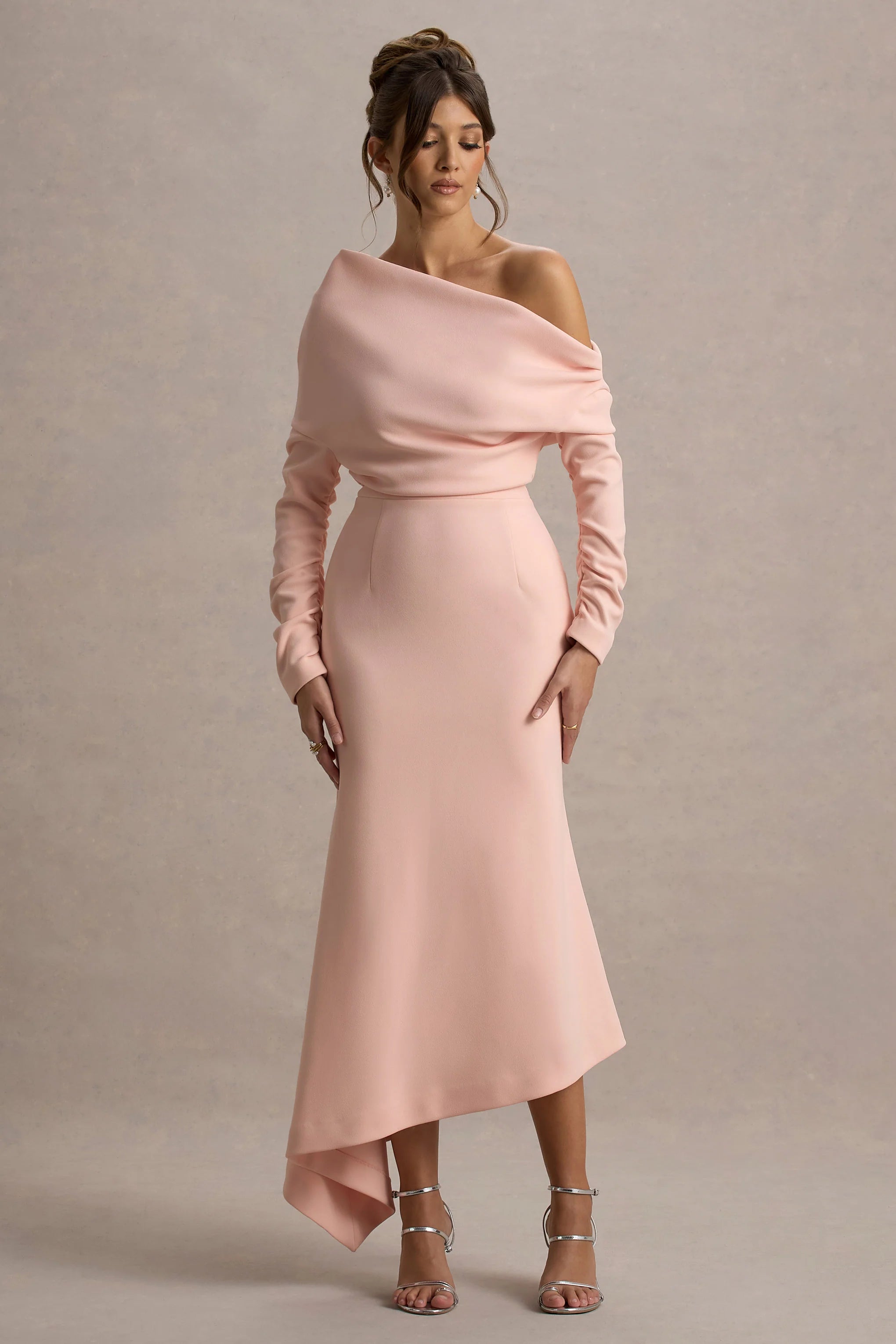 Embrace the wow-factor at every event in our latest pink maxi Lou. Presented in a premium crepe, this elegant choice is detailed with a graceful bardot neckline and flouncy asymmetric hemline. Style Lou with a sleek bun for an iconic graduation look.