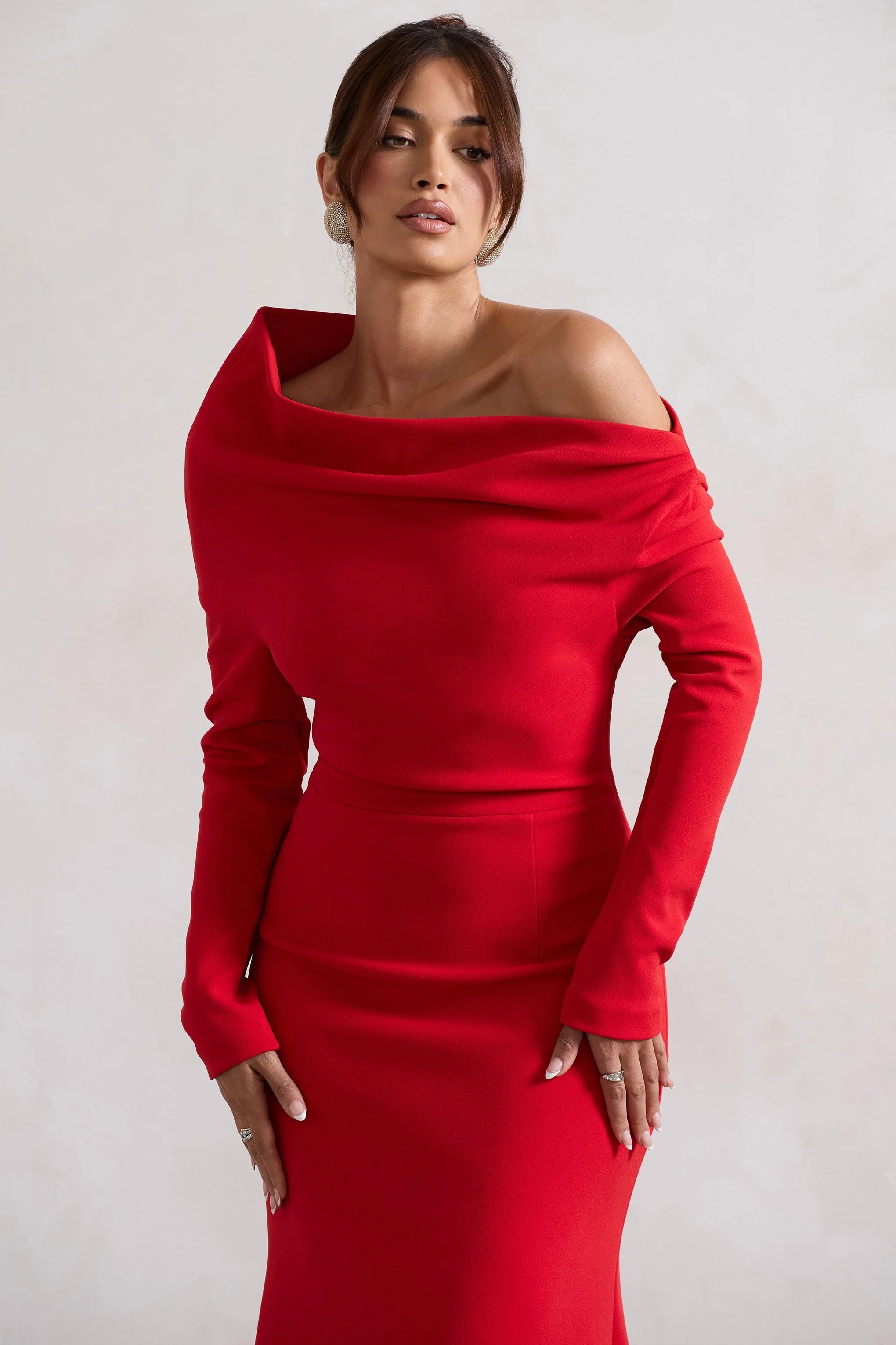 Embrace the wow-factor at every event in our latest red maxi Lou. Presented in a premium crepe, this elegant choice is detailed with a graceful bardot neckline and flouncy asymmetric hemline. Style Lou with a sleek bun for an iconic graduation look.