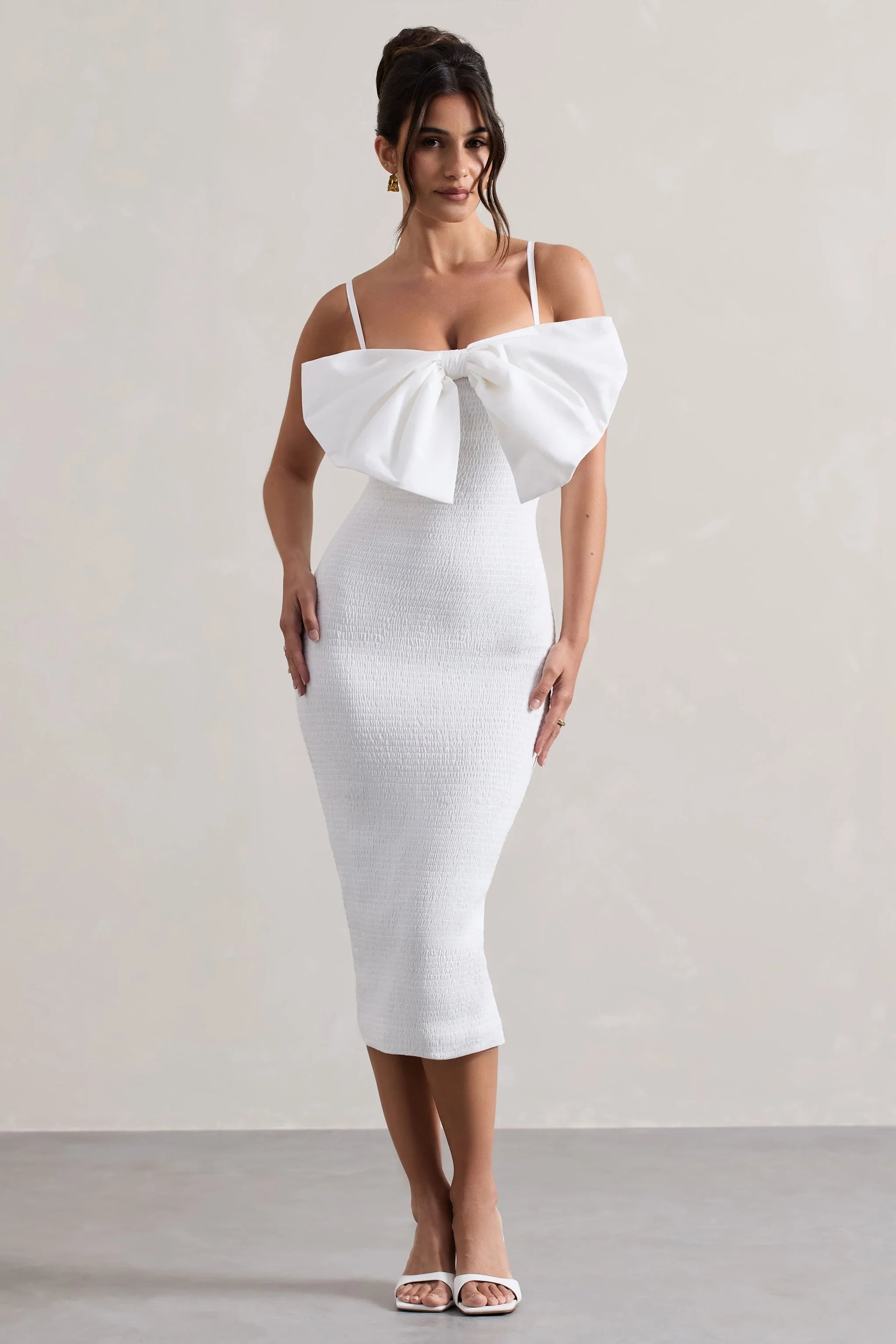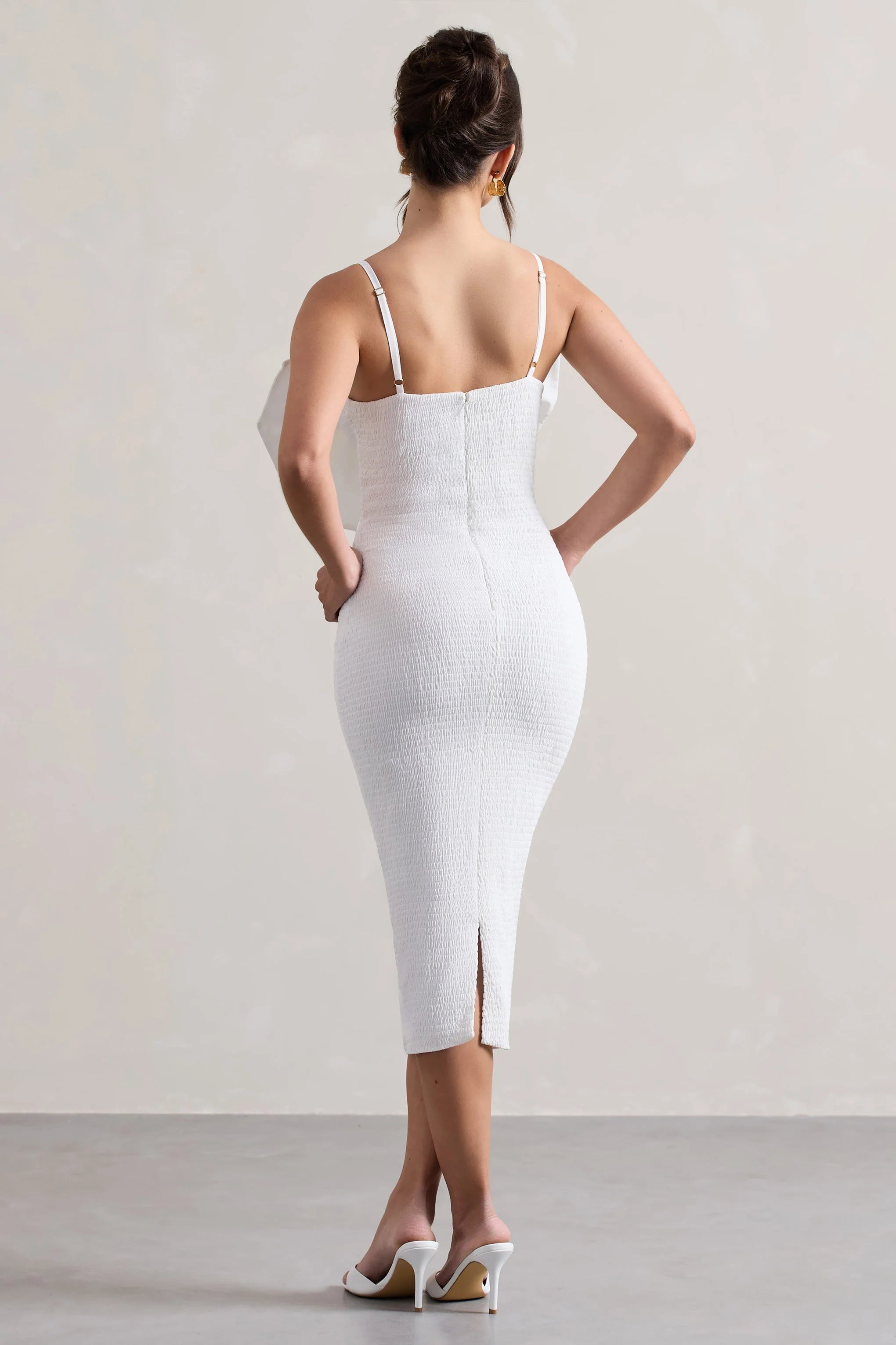 Add some summer romance to your suitcase with Love Poem. Arriving in a shirred jersey fabric this white midi dress gives an ultra flattering fit and is defined by a statement bow. Style yours with our Kai sunglasses for the ultimate summer day look.