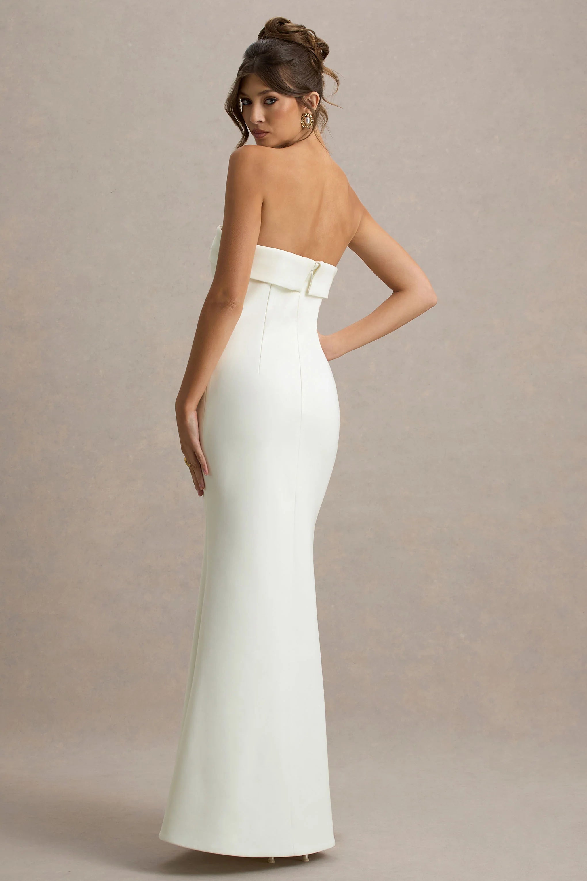 Introducing the epitome of timeless elegance, Lucia. This maxi is curated in a soft cream shade of our premium crepe, ensuring an ultra flattering fit that feels as good as it looks. The self covered buttons and pocket flap details bring this piece to next level chicness. Also boasting a bandeau neckline that highlights your decolletage, this piece is utterly elegant and feminine. The front high splits adds a modern edge that brings the whole look together. Style with statement earrings for a look that'll have all eyes on you.