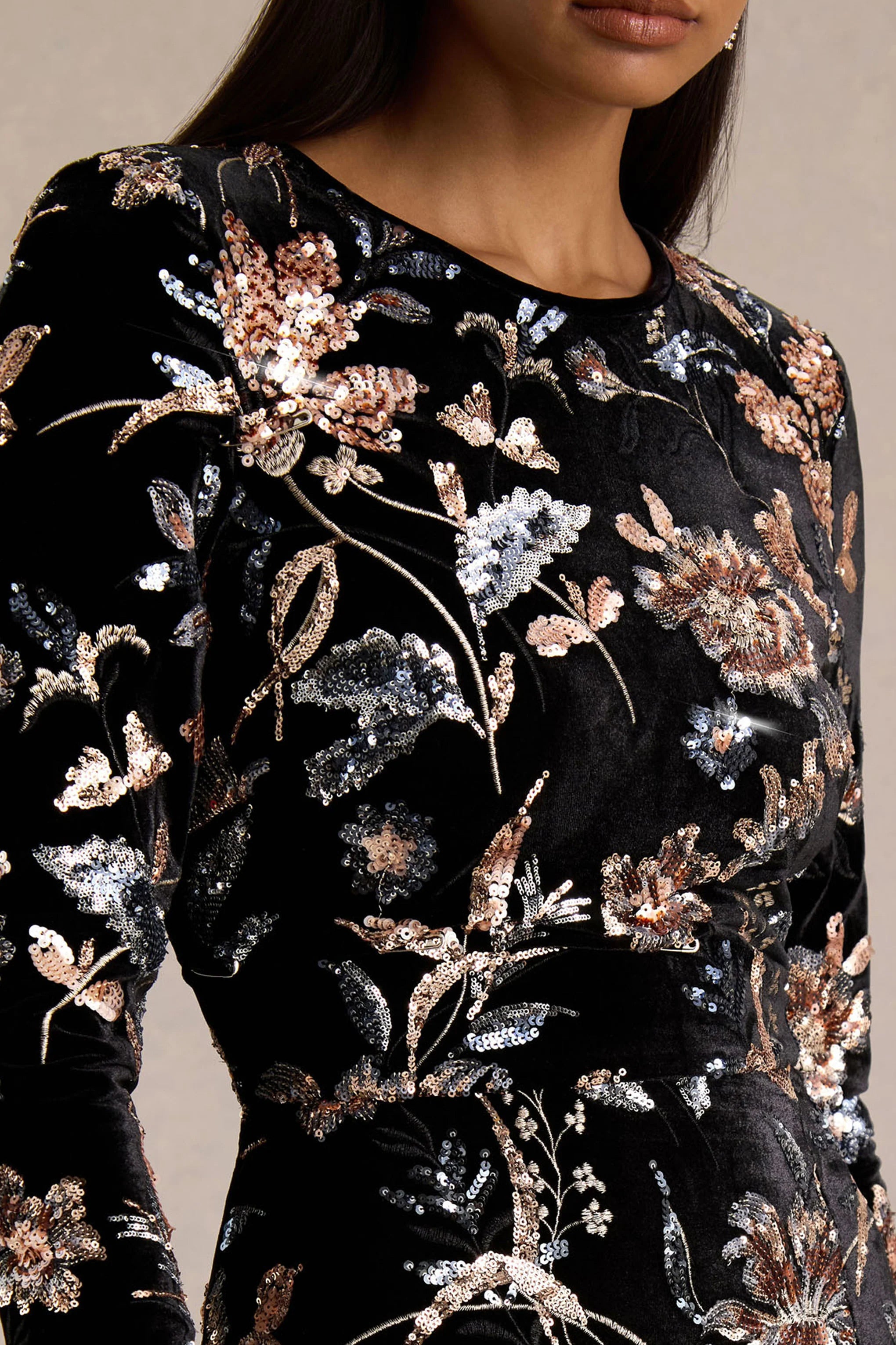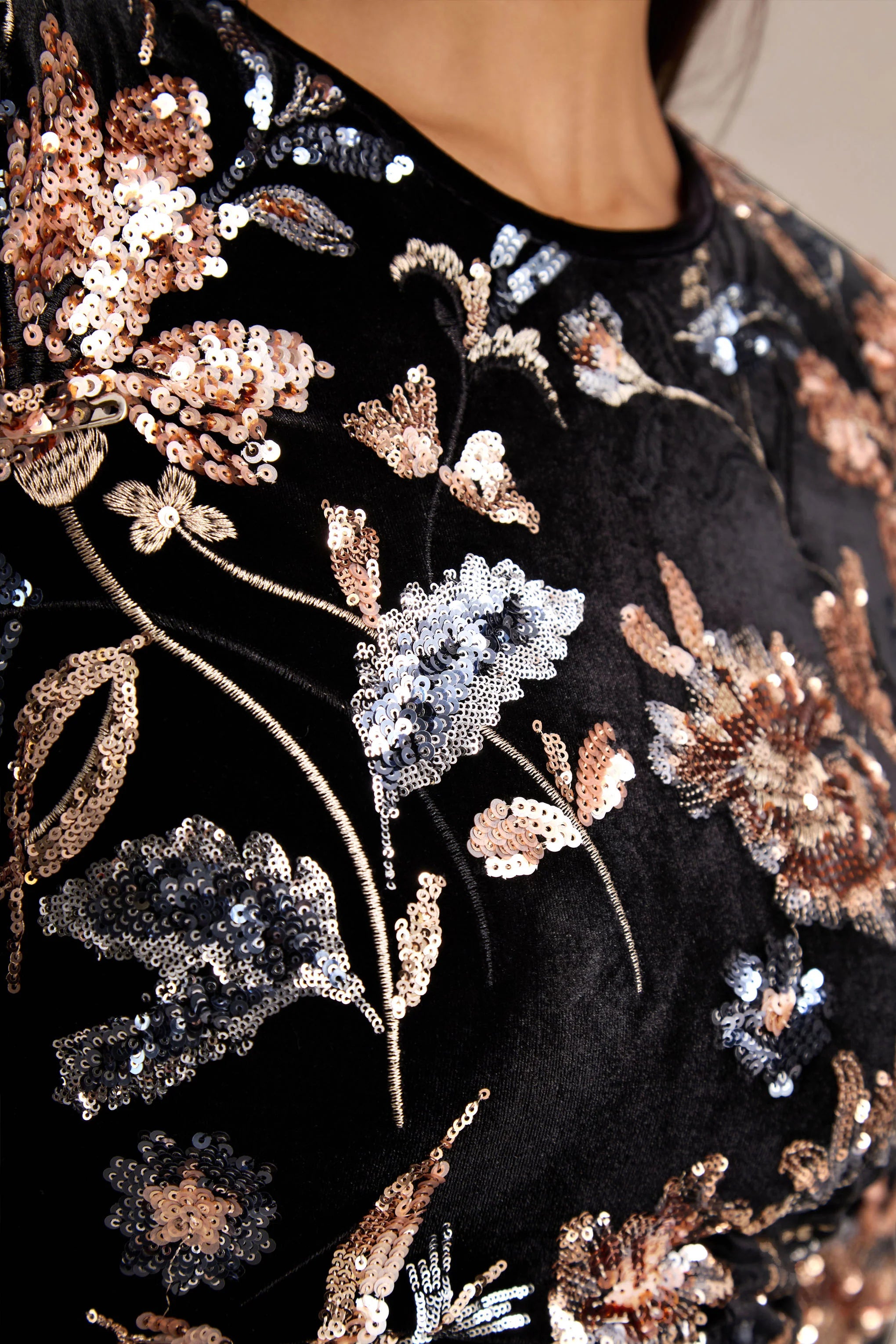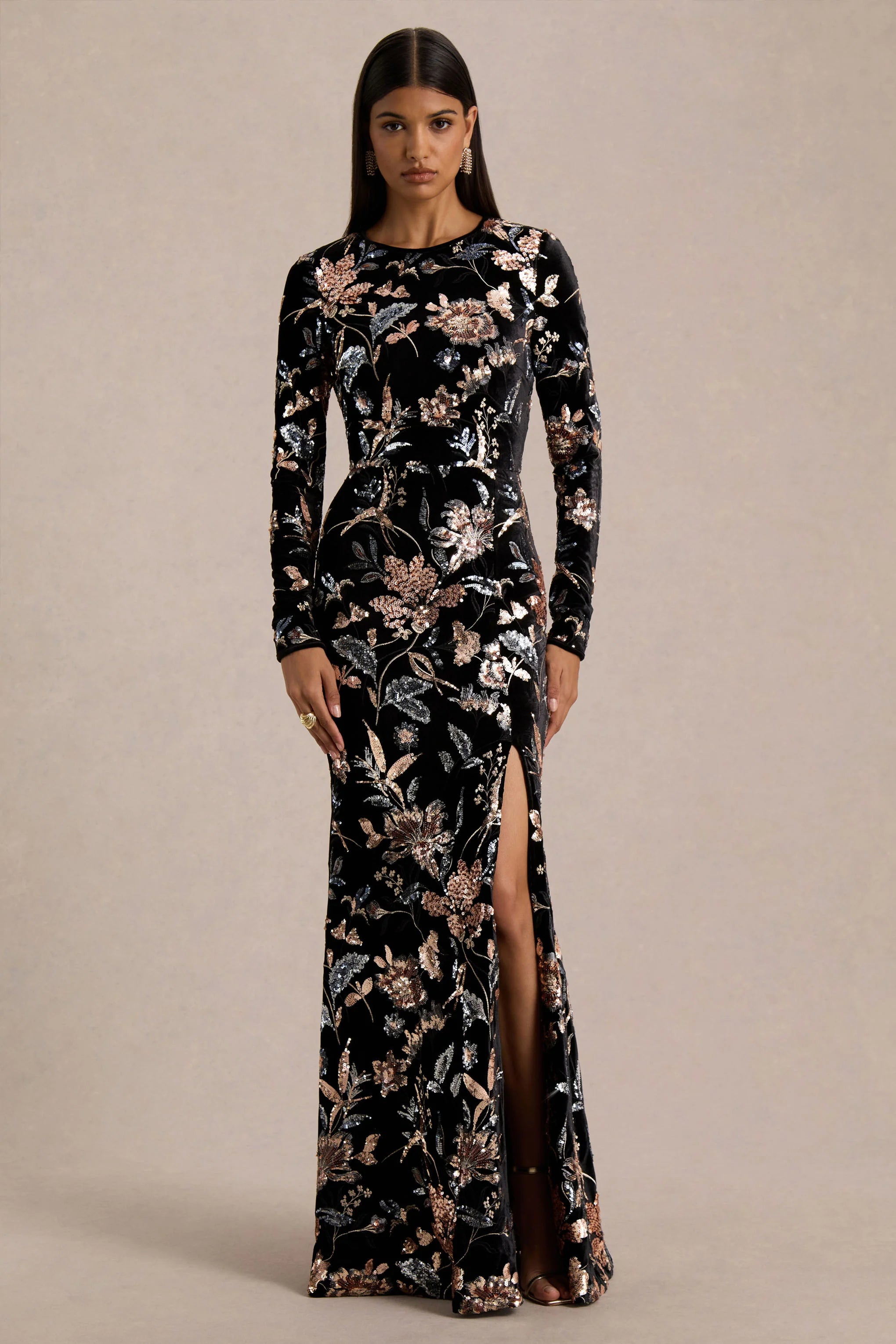 Step into dazzling sophistication with Lyric, a gown designed to command attention in every room. Crafted from our premium black velvet, this elegant maxi features intricate sequin floral embellishments for a touch of sparkling detail. Finished with a refined crew neckline and a front-high split that adds a daring, modern edge, making it perfect for any occasion where you want to leave a lasting impression.
