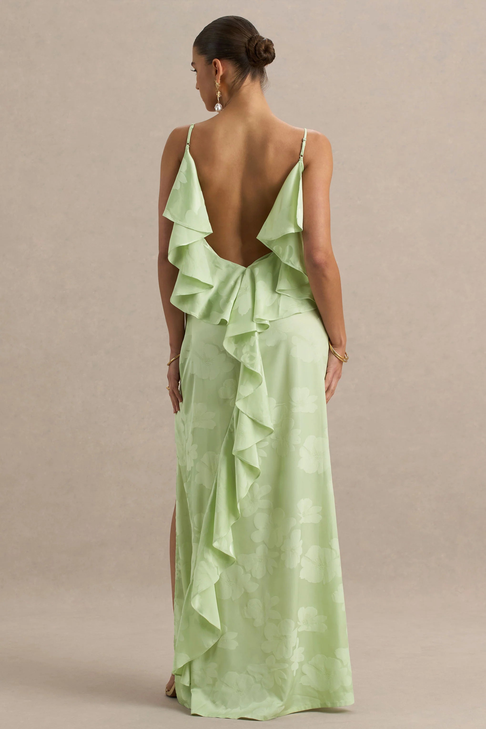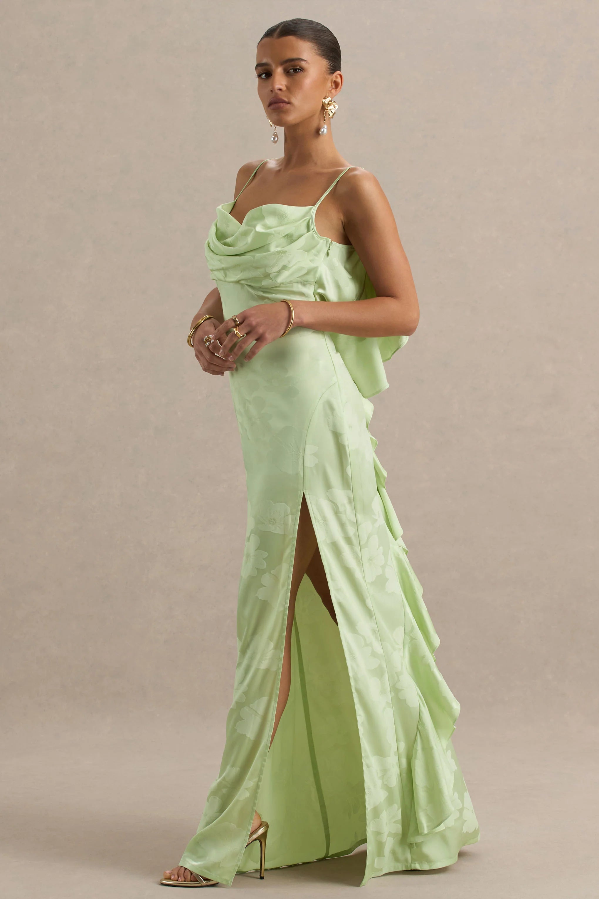 Turn every head in Maddie, a romantic statement dress blooming with bold femininity. Designed in a vibrant floral print and cut from our premium satin, this maxi dress moves with elegance and allure. The soft cowl neckline and adjustable straps offer a delicate drape, while the V-shaped open back adds a sultry finish. Finished with ruffled detailing and complemented by a high front split that brings a daring edge. Style with beach waves and strappy heels for an effortlessly chic look.