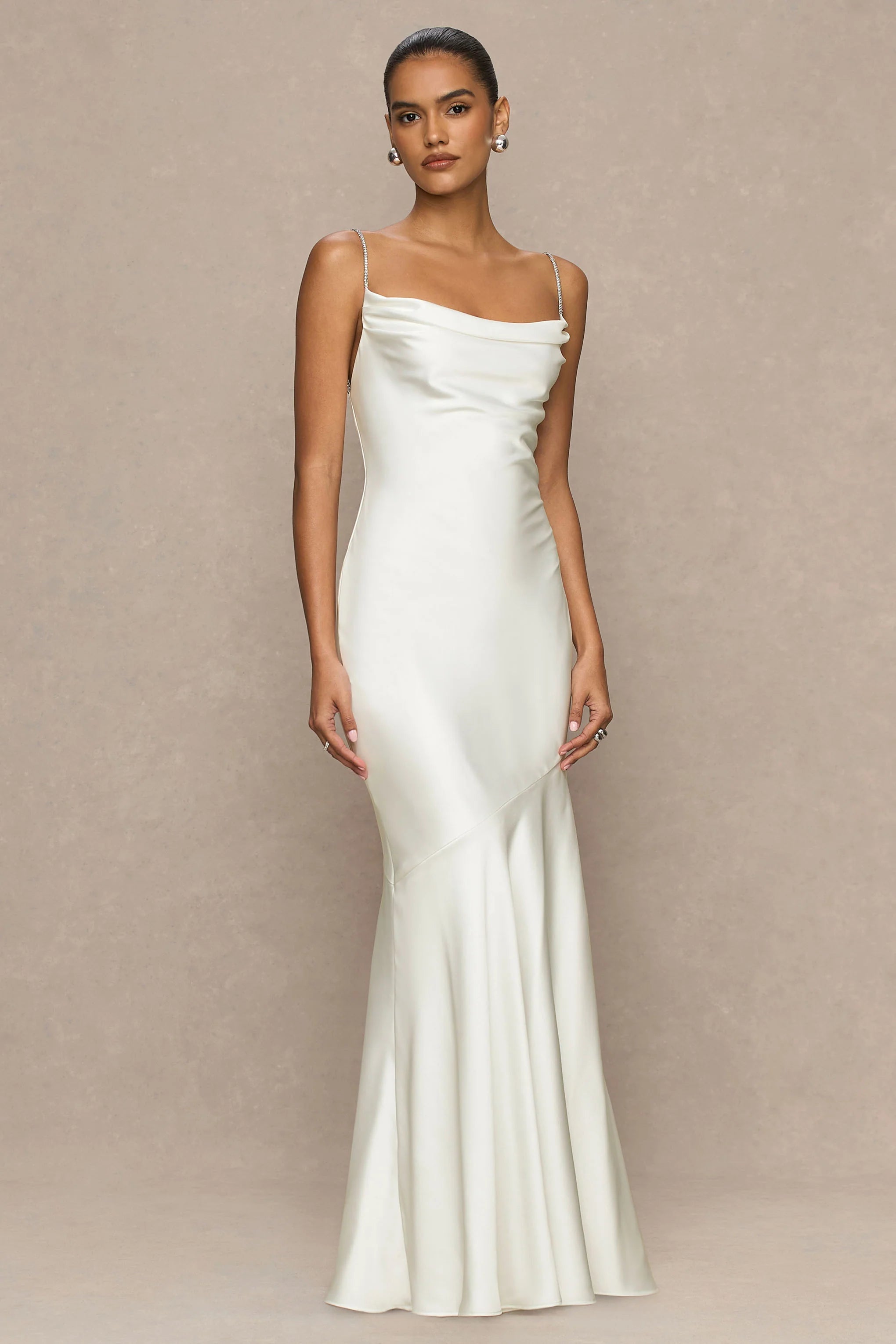 Turn heads in Maelia, a dress that combines sleek sophistication with shimmering detail. Crafted from our premium cream satin, it drapes effortlessly over the body to an elegant maxi length, catching the light with every movement. A soft cowl neckline enhances the décolletage, while delicate embellished straps lead to a dramatic knotted back detail that spans across the open back and cascades down the length of the dress. Maelia is an unforgettable statement piece, perfect for evenings where elegance meets allure.
