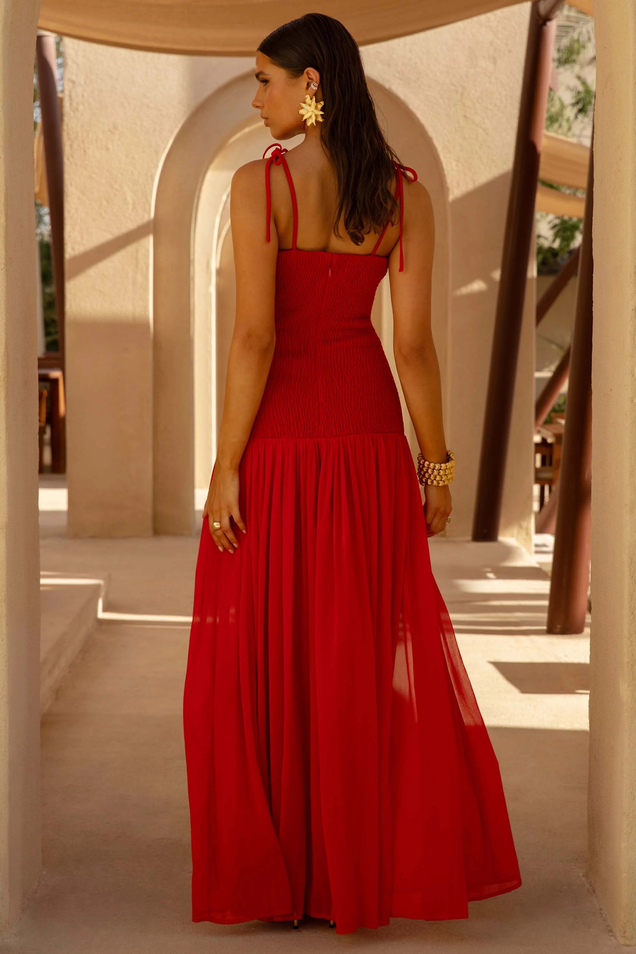 Make a dramatic statement this season in Maeva. Crafted in a blend of our premium stretch jersey and chiffon in a striking red shade, this maxi dress exudes elegance from every angle. Featuring a feminine square neckline and delicate self-tie straps that gorgeously frame your decolletage. Maeva is expertly designed to flatter your figure with a shirred bodice and drop waist to enhance your hourglass silhouette. Finished with a sheer chiffon skirt, cut with a front split, that moves effortlessly with every gesture. This maxi is made for memorable moments.
