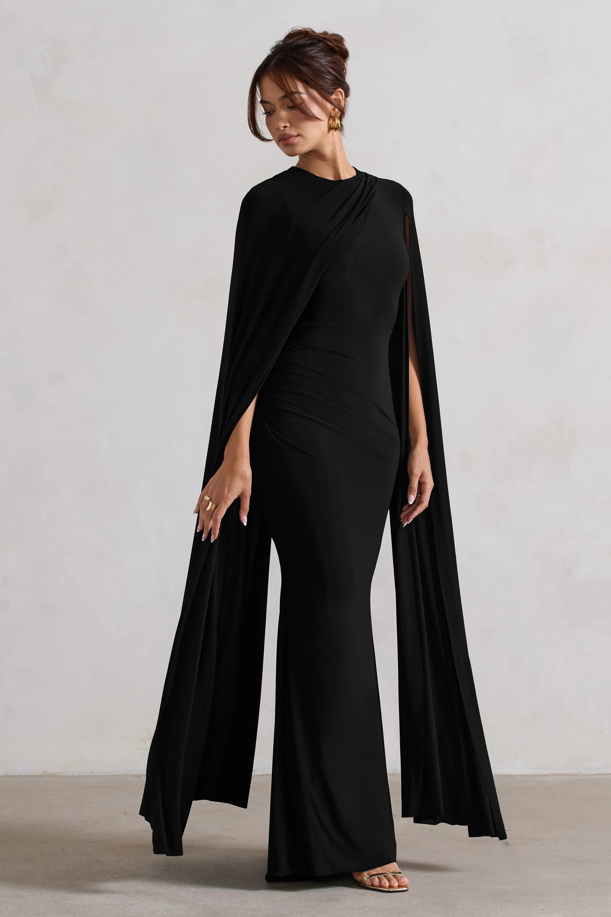 Defined by an extravagant asymmetric cape, Magdelena is a sophisticated option for your next black tie wedding or race day event. Crafted in our signature stretch jersey, this black maxi dress features a crew neckline and gathered waist before falling into an elegant floor sweeping skirt.