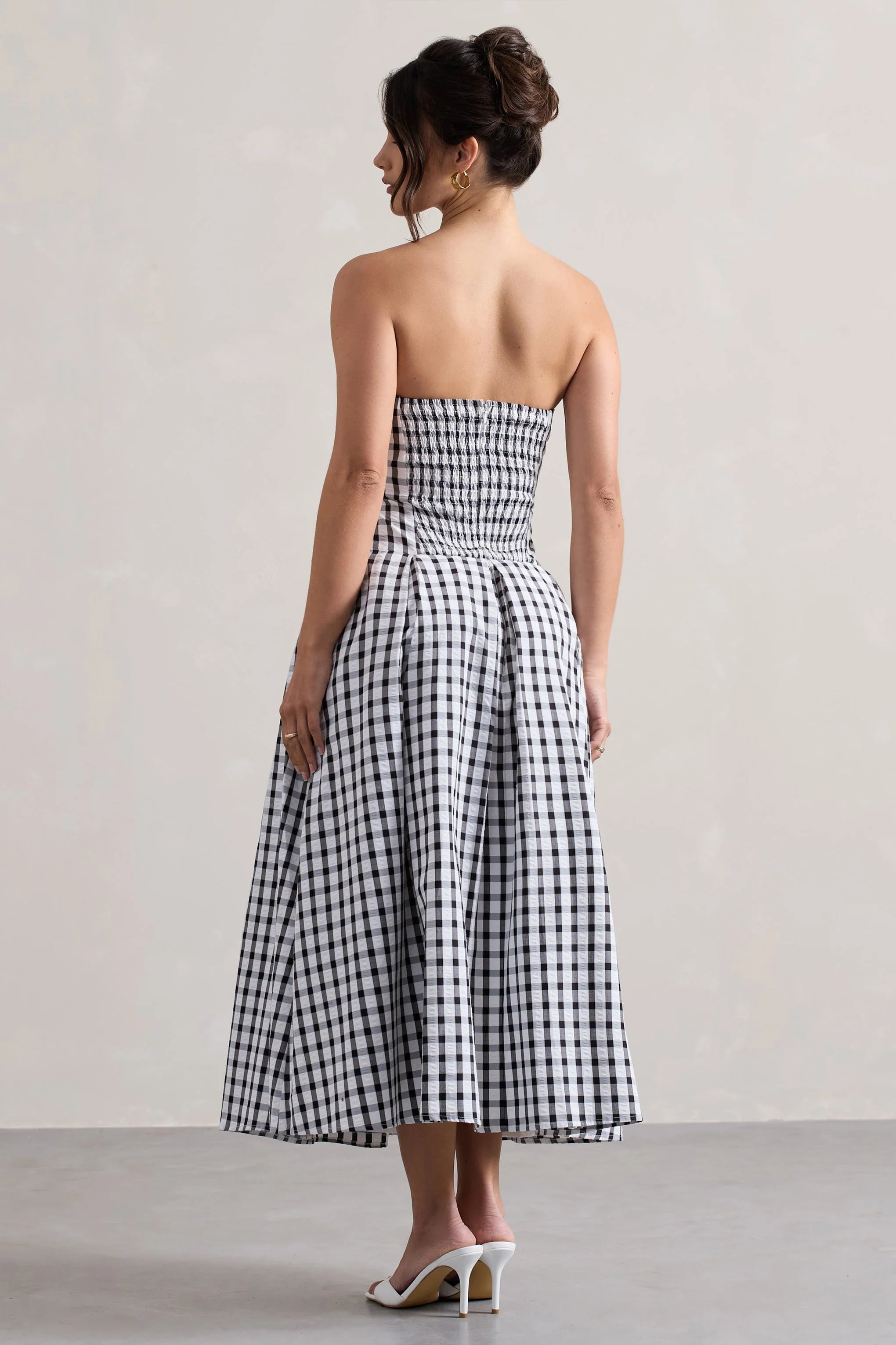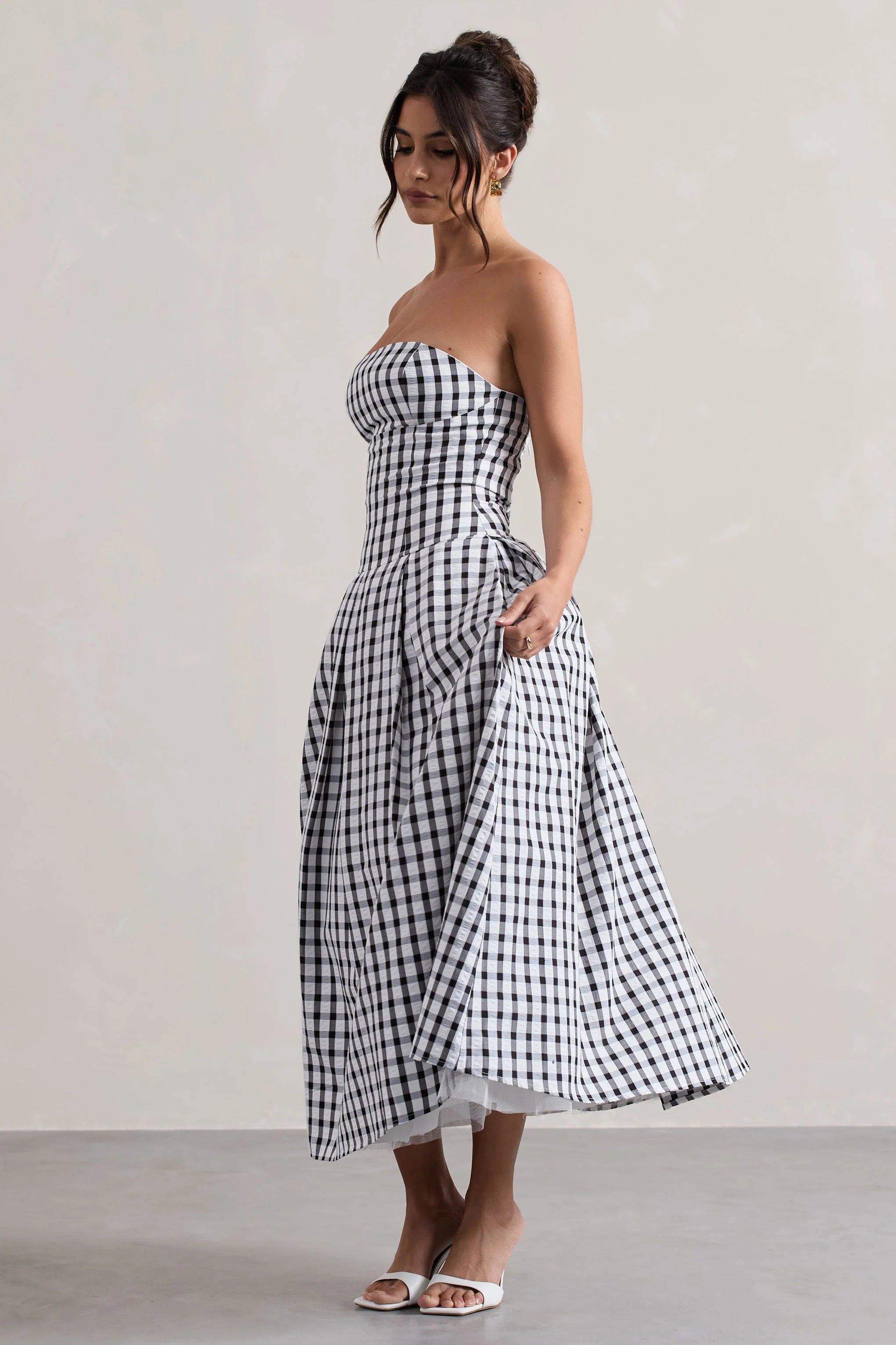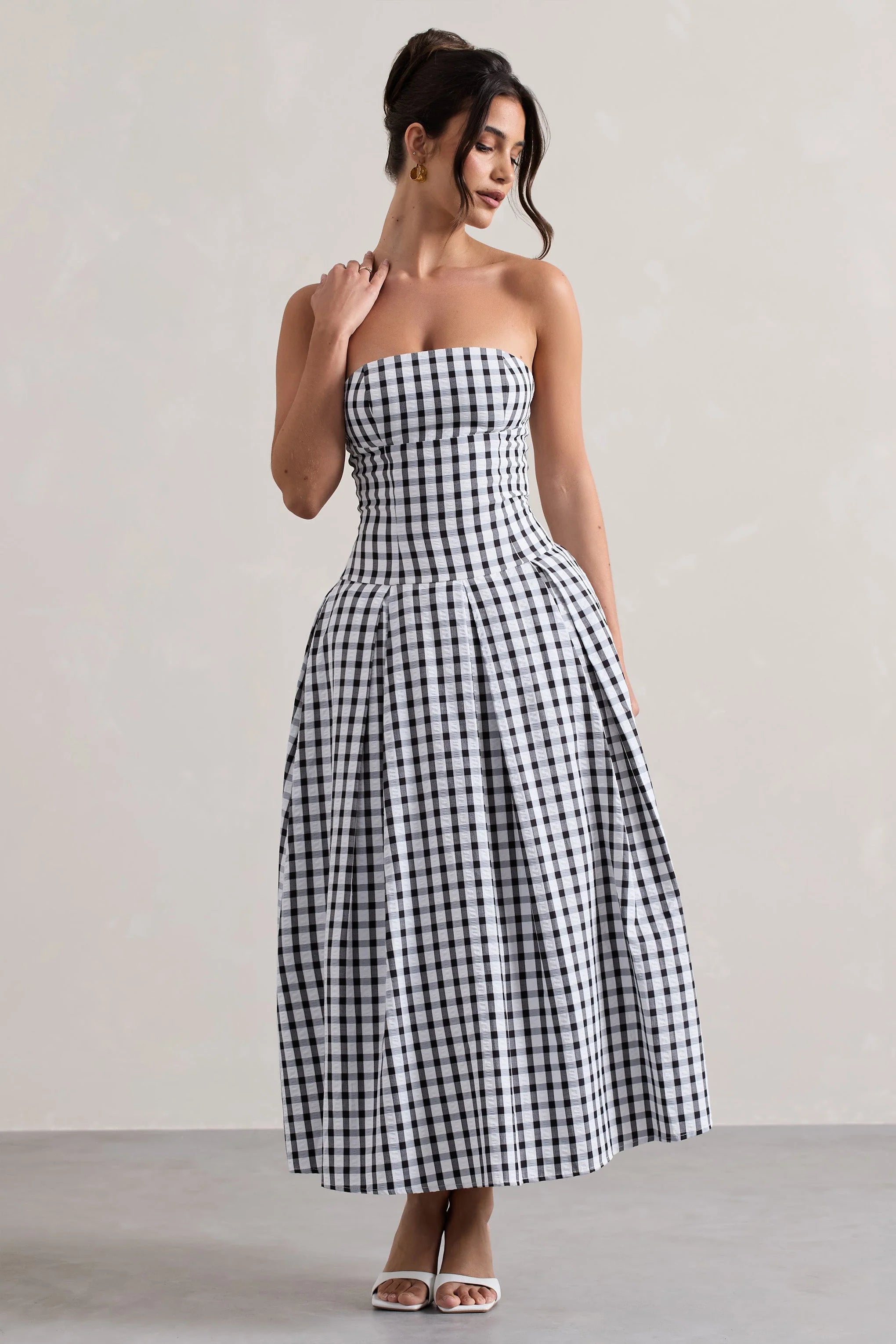 The most dreamy summer day dress is here, meet Maisy. This maxi arrives cut in a feminine black and white gingham that radiates romance, Maisy is detailed with a strapless bandeau neckline and flattering dropped waist. Style yours with some strappy sandals and head out into the sun.