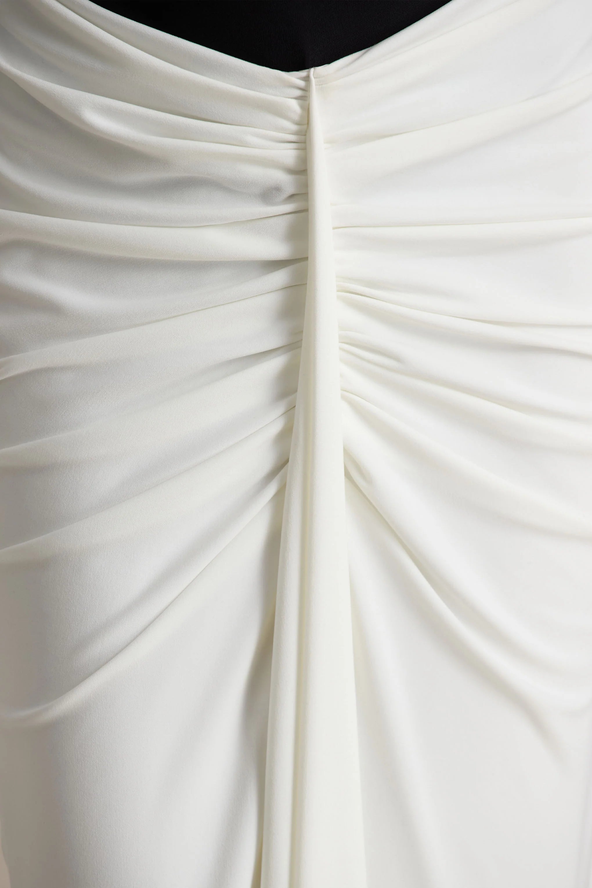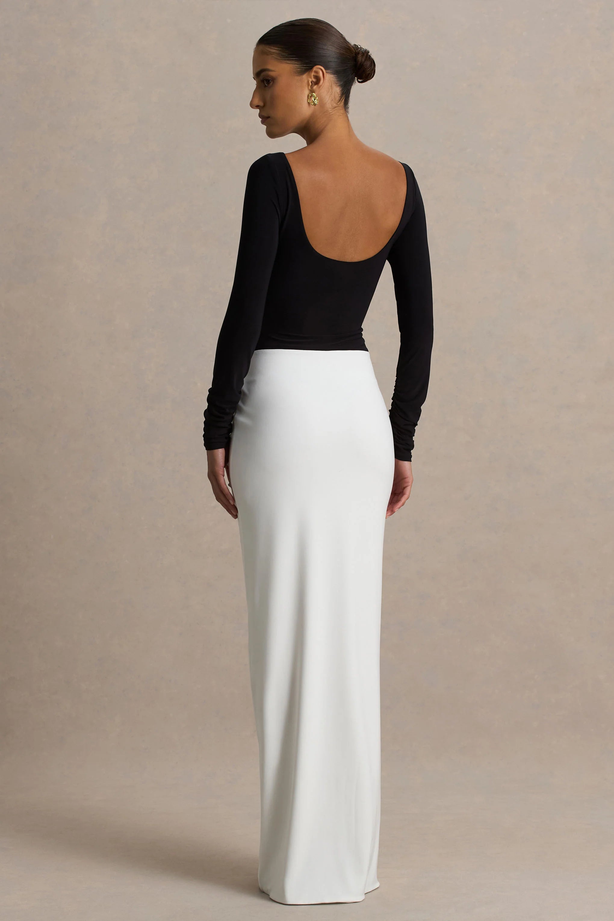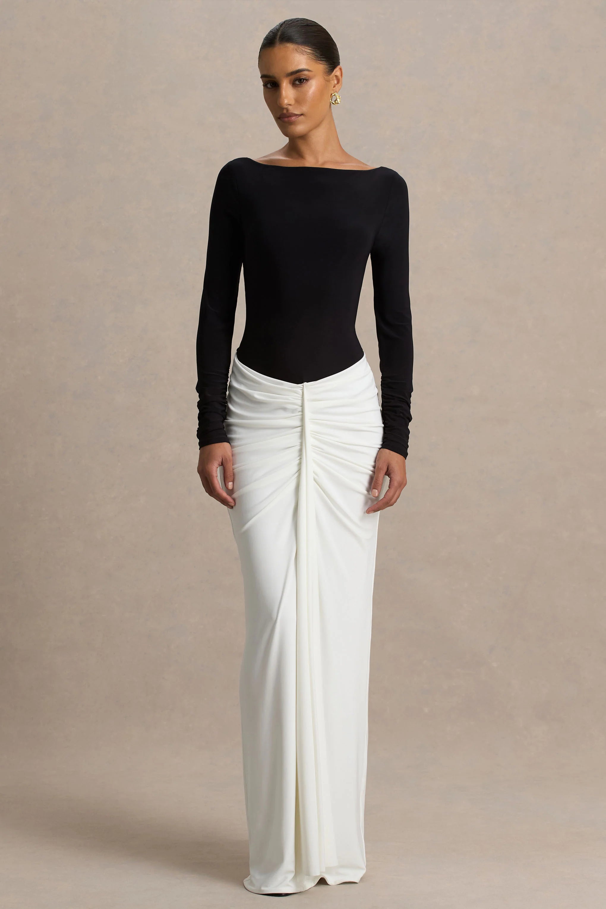 Make a striking statement in Matilda, a timeless maxi that effortlessly blends classic elegance with contemporary flair. Crafted from our premium stretch jersey, in contrasting black and white shades, this dress flatters your silhouette like no other. Featuring a sophisticated boat neckline and long sleeves for a graceful finish, Matilda surprises with a subtle scoop back that adds a hint of allure. Finished with a ruched waist detail that cinches and sculpts your silhouette, in this dress you won't be forgotten.