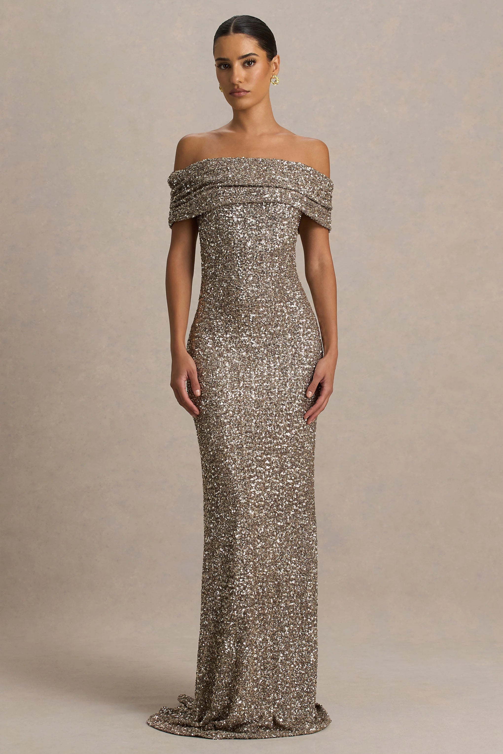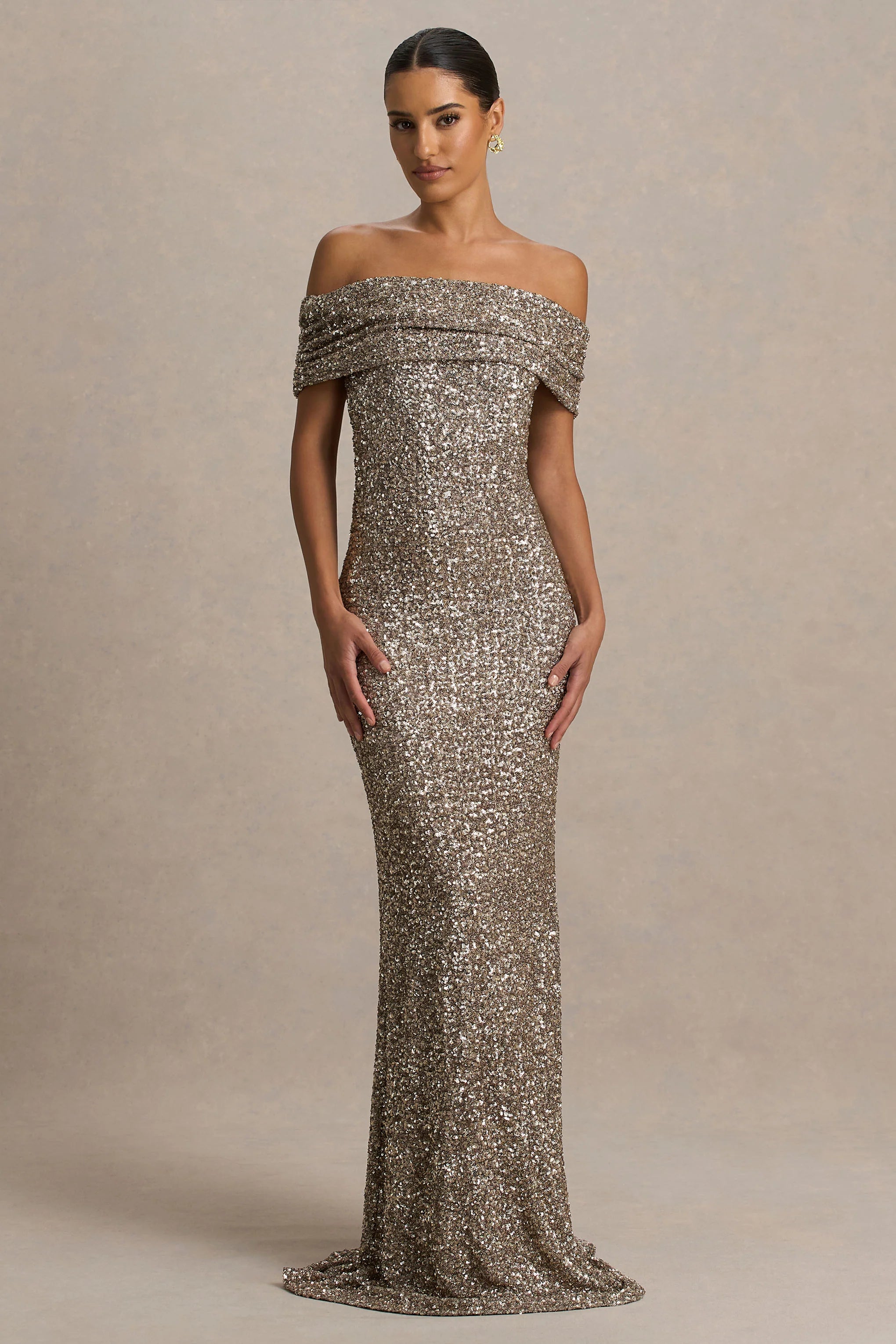 Step into modern elegance with Melina, a statement maker for your next occasion. Crafted from our premium sequin, in a luxurious champagne hue, this maxi dress catches the light beautifully with every movement. Designed with a flattering bardot neckline that frames the shoulders, in Melina you will be photo-ready from all angles. For all special occasions this season, in this gown all eyes will be on you.