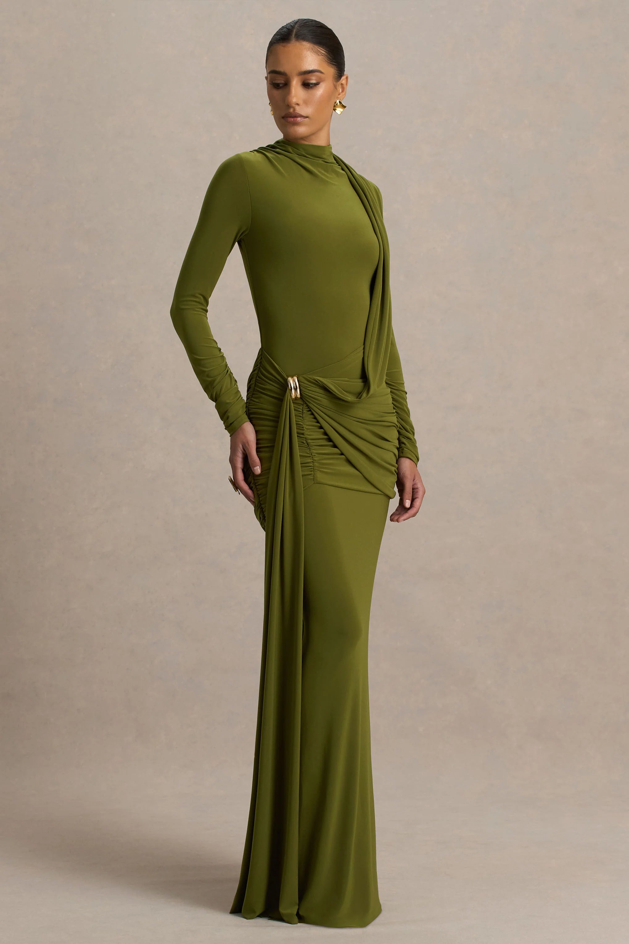 Elevate your evening look with Melissa. Crafted from our premium olive stretch jersey, it offers a figure-flattering fit in a floor-skimming maxi length. Featuring a classic high neckline and long sleeves, the dress is elevated with draped detailing from the shoulder across the bodice, creating a sophisticated, fluid silhouette. A sash detail cinches the waist, complemented by subtle gold trim for a touch of luxe, making Melissa the perfect choice for elegant evenings and special occasions.
