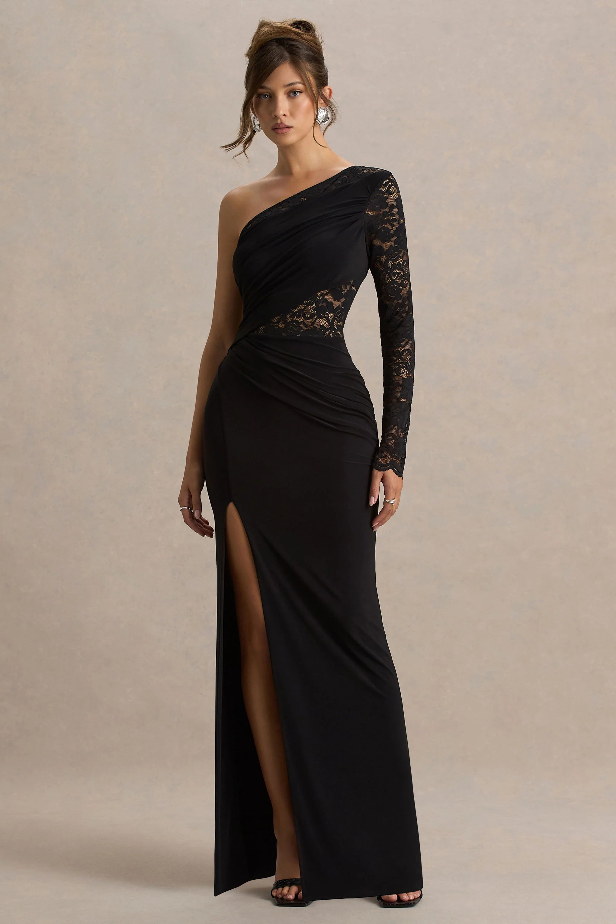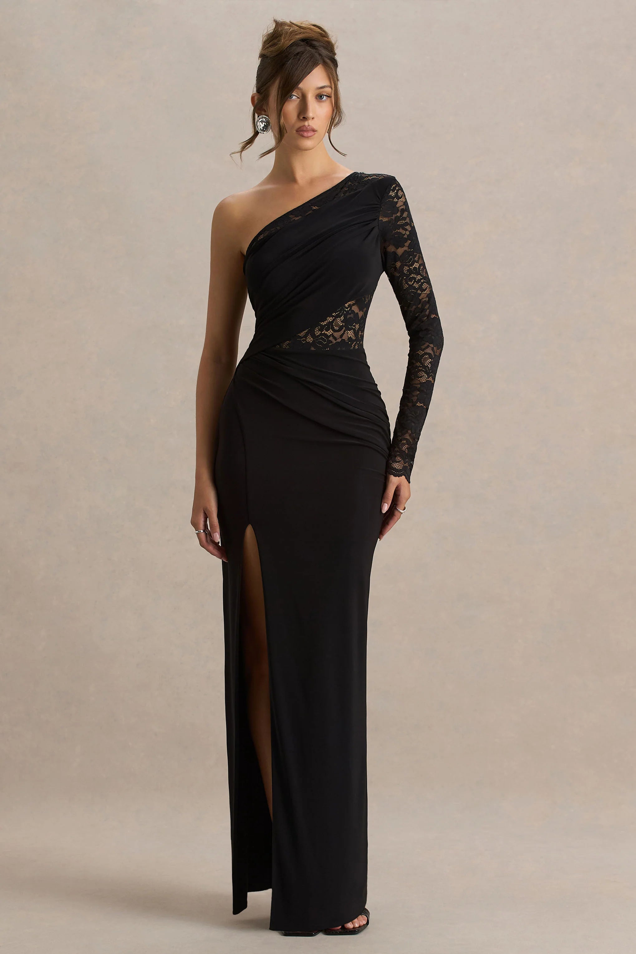 Introducing Melody, the definition of dark romance and daring elegance. Designed in a luxurious blend of our premium stretch jersey and delicate black lace, this maxi dress is made to mesmerise. Featuring an asymmetric neckline and a single long sheer lace sleeve, Melody strikes the perfect balance between bold and feminine. Sheer lace panels across the back and waist add a sultry edge, while the gathered detailing sculpts your curves flawlessly. Finished with a dramatic front-high split, Melody is your statement piece for after-dark allure.