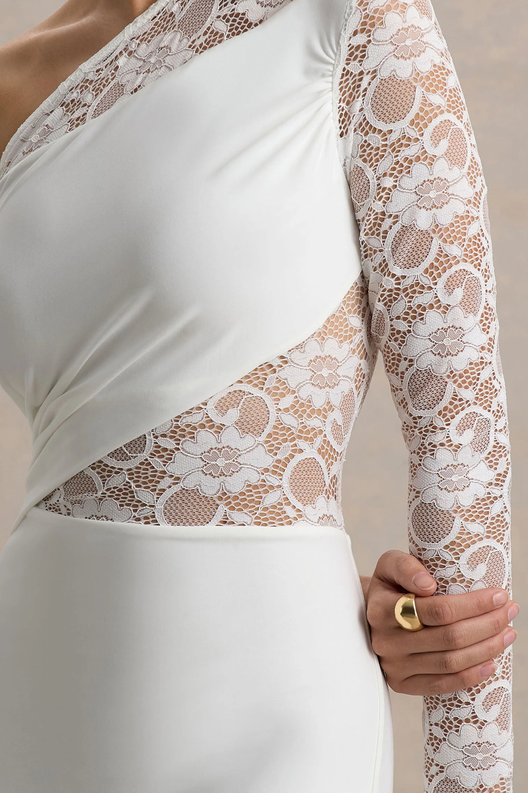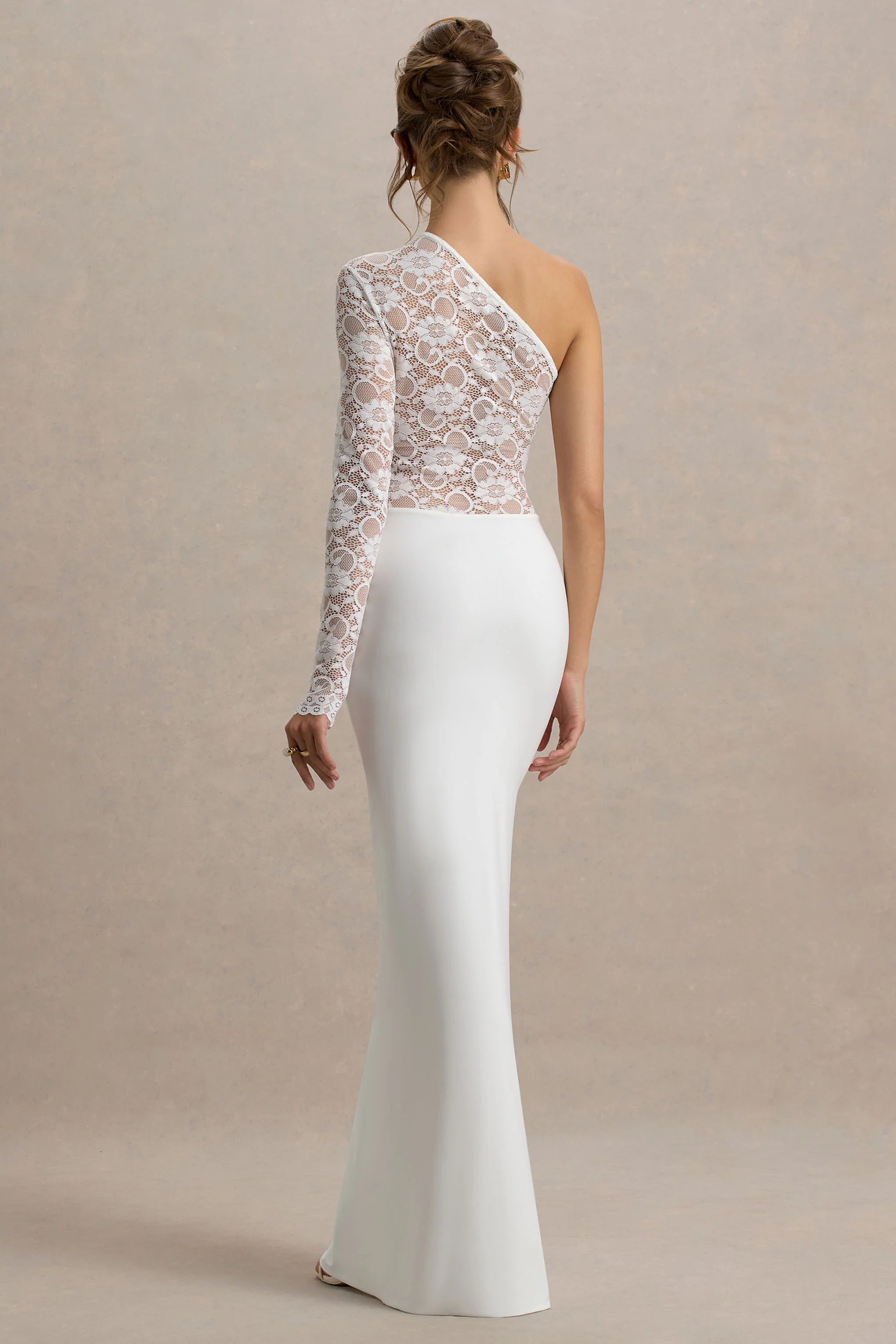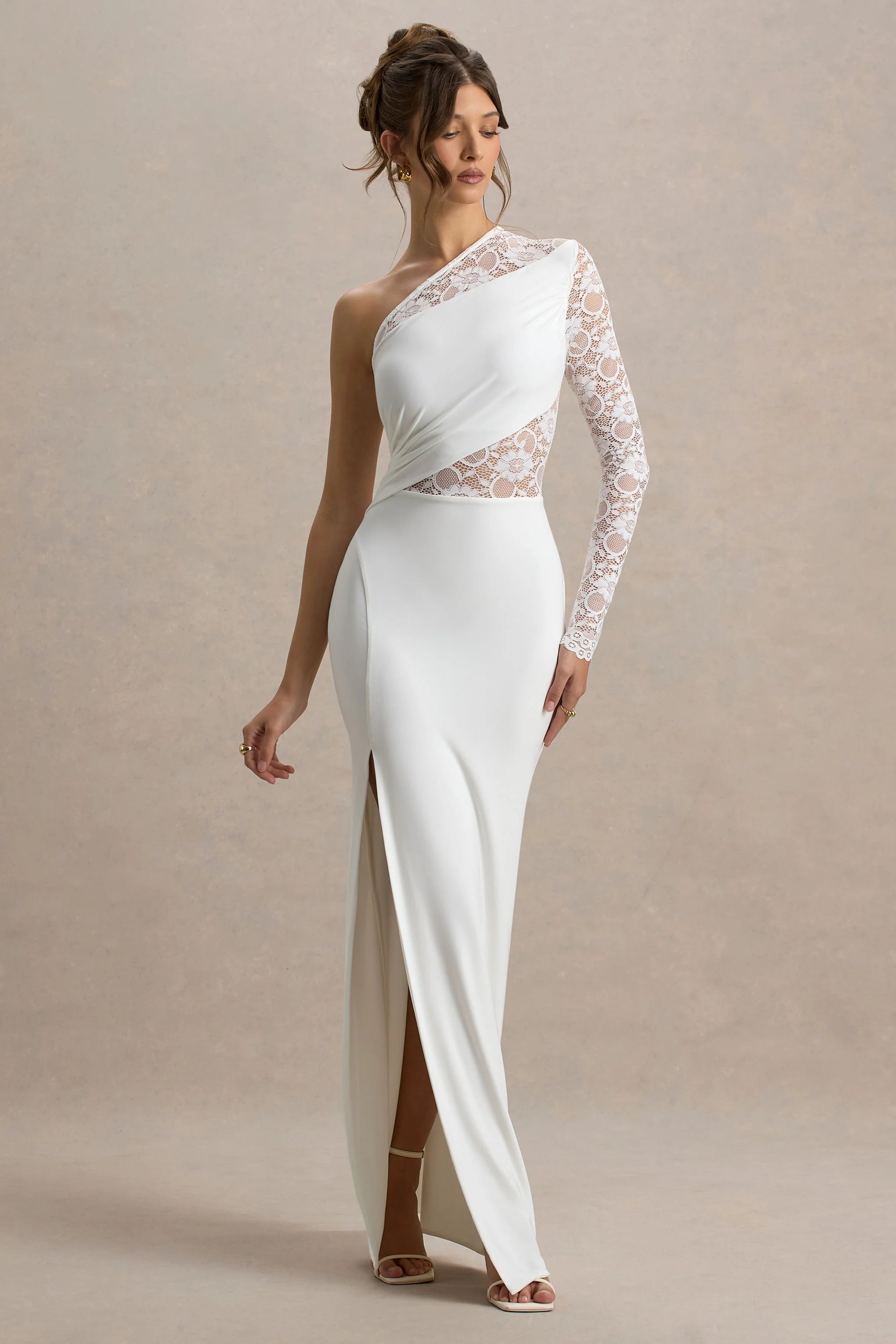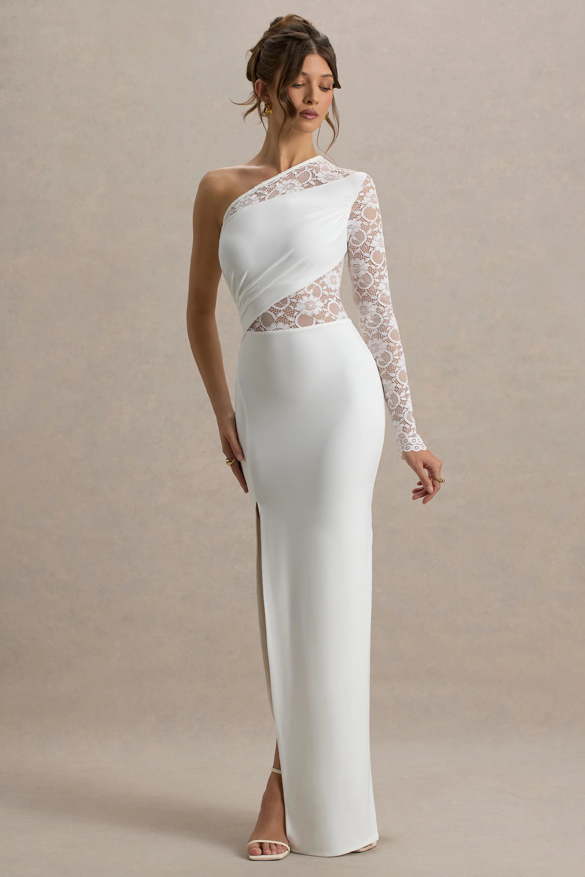 Radiate confidence in Moonlight, the ultimate statement of elegance and allure. Crafted from our premium stretch jersey in a striking white hue, this show stopping design hugs your curves to perfection. The asymmetric neckline adds a modern edge, while delicate ruched detailing enhances your silhouette. A sheer, single layer lace back offers a touch of romance, beautifully contrasting the bold front leg split that ensures just the right amount of drama. This piece guarantees all eyes on you at any evening affair this season.