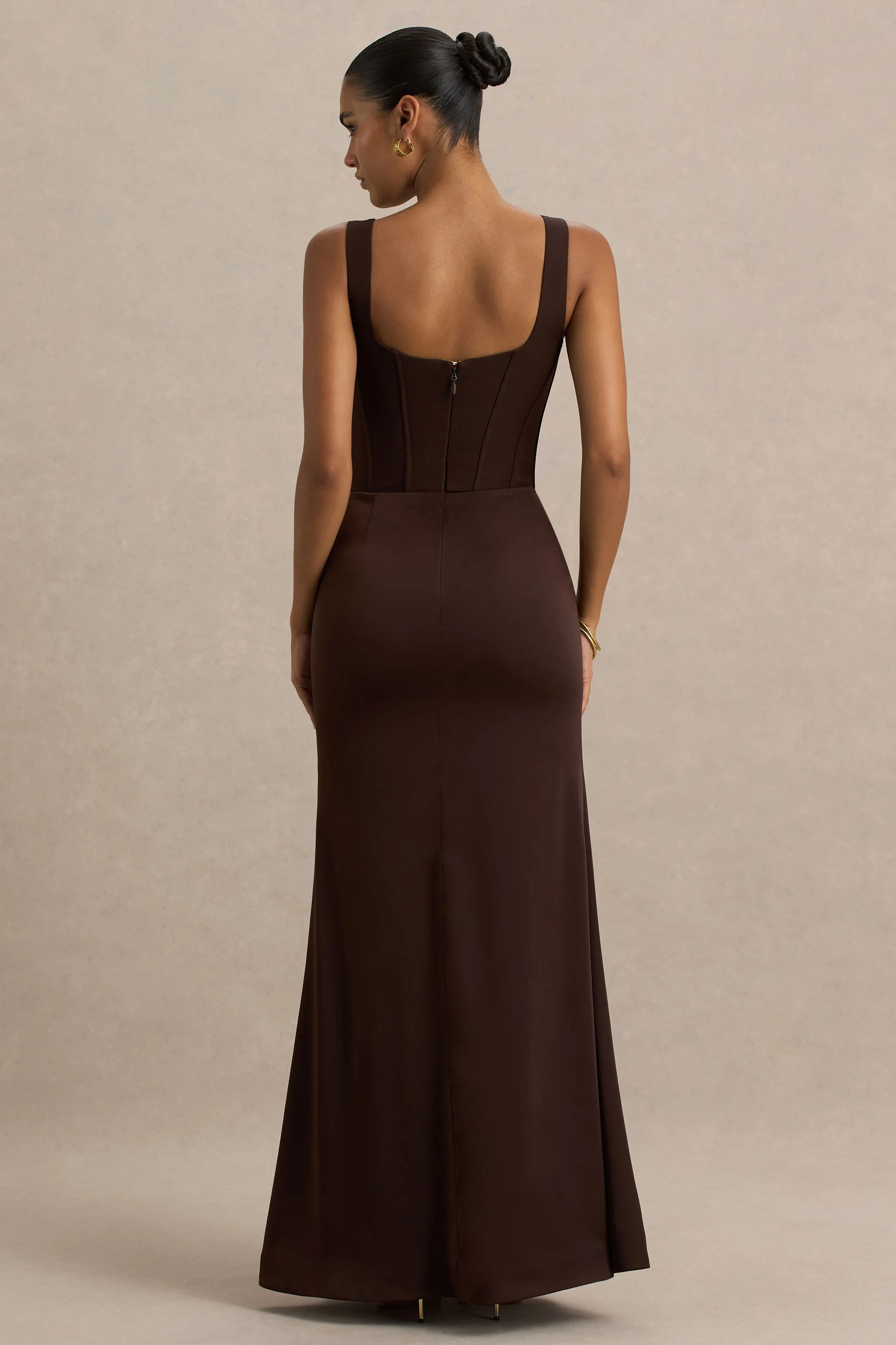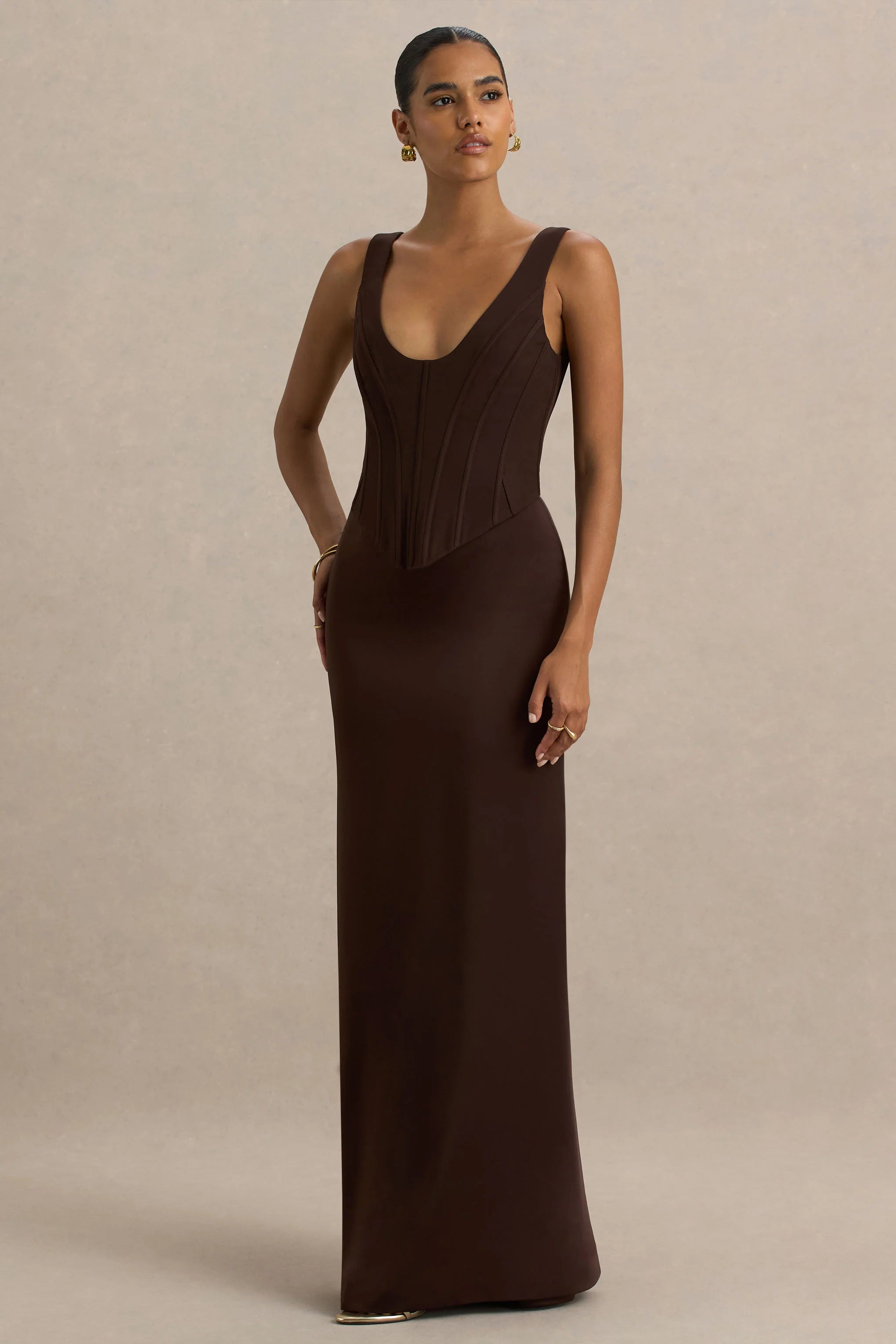 Make an entrance in Morgan, a piece that is sultry, sculpted and unapologetically glamorous. This maxi is cut from our premium stretch crepe and luxe satin, in a rich brown shade, and is designed to flatter every curve. Finished with a structured corset bodice, that gives you a gorgeous hourglass silhouette, and a daring plunge neckline, this dress exudes elegance and femininity. The bodice is contrasted beautifully with a sleek satin skirt that moves with you effortlessly, Morgan strikes the perfect balance of allure and elegance. Pair with gold accessories and a clutch bag for a showstopping look.