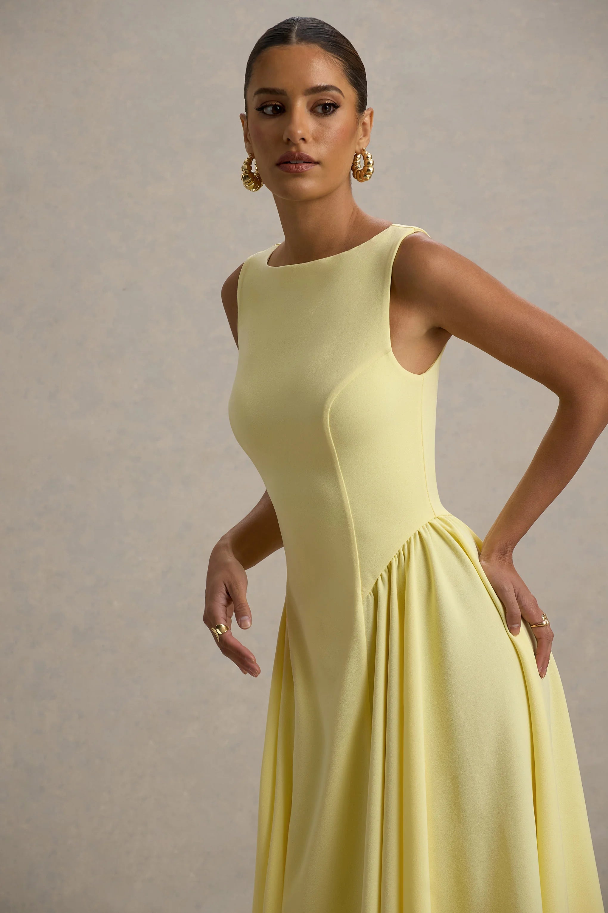 Designed in a timeless, sophisticated silhouette, Muriel was made for special events. Crafted in a light lemon shade of our premium scuba crepe, this midi dress features a classic boat neckline and wide shoulder straps. With an elegant spin, Muriel reveals a flouncy volume skirt that adds dimension and flair.