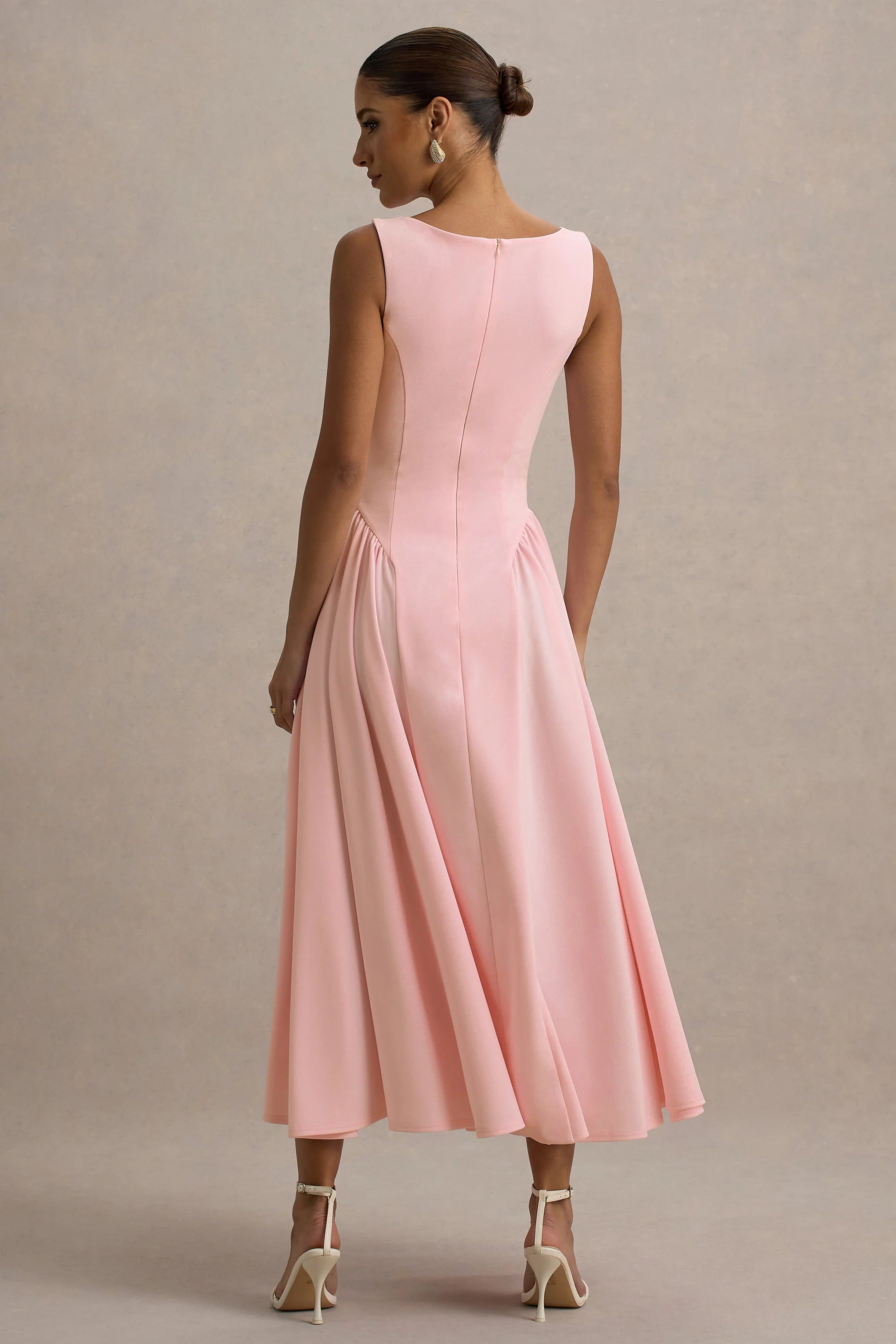 Designed in a timeless, sophisticated silhouette, Muriel was made for special events. Crafted in a pink shade of our premium scuba crepe, this midi dress features a classic boat neckline and wide shoulder straps. With an elegant spin, Muriel reveals a flouncy volume skirt that adds dimension and flair.