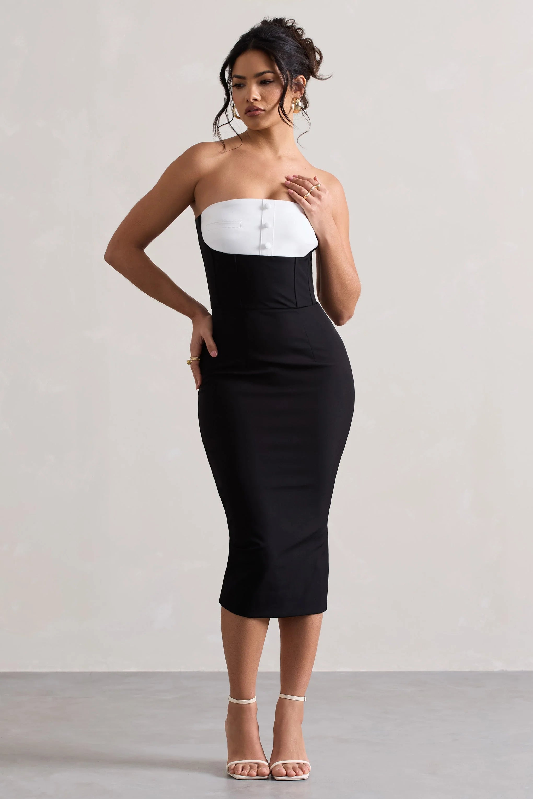 A modern midi with classic detailing, meet My Darling. This strapless black midi dress arrives in a premium crepe that creates a flattering tailored fit, My Darling is defined by a feminine white buttoned bust panel. Style this elegant midi with a tousled bun and some strappy stilettos for a simple yet striking look.