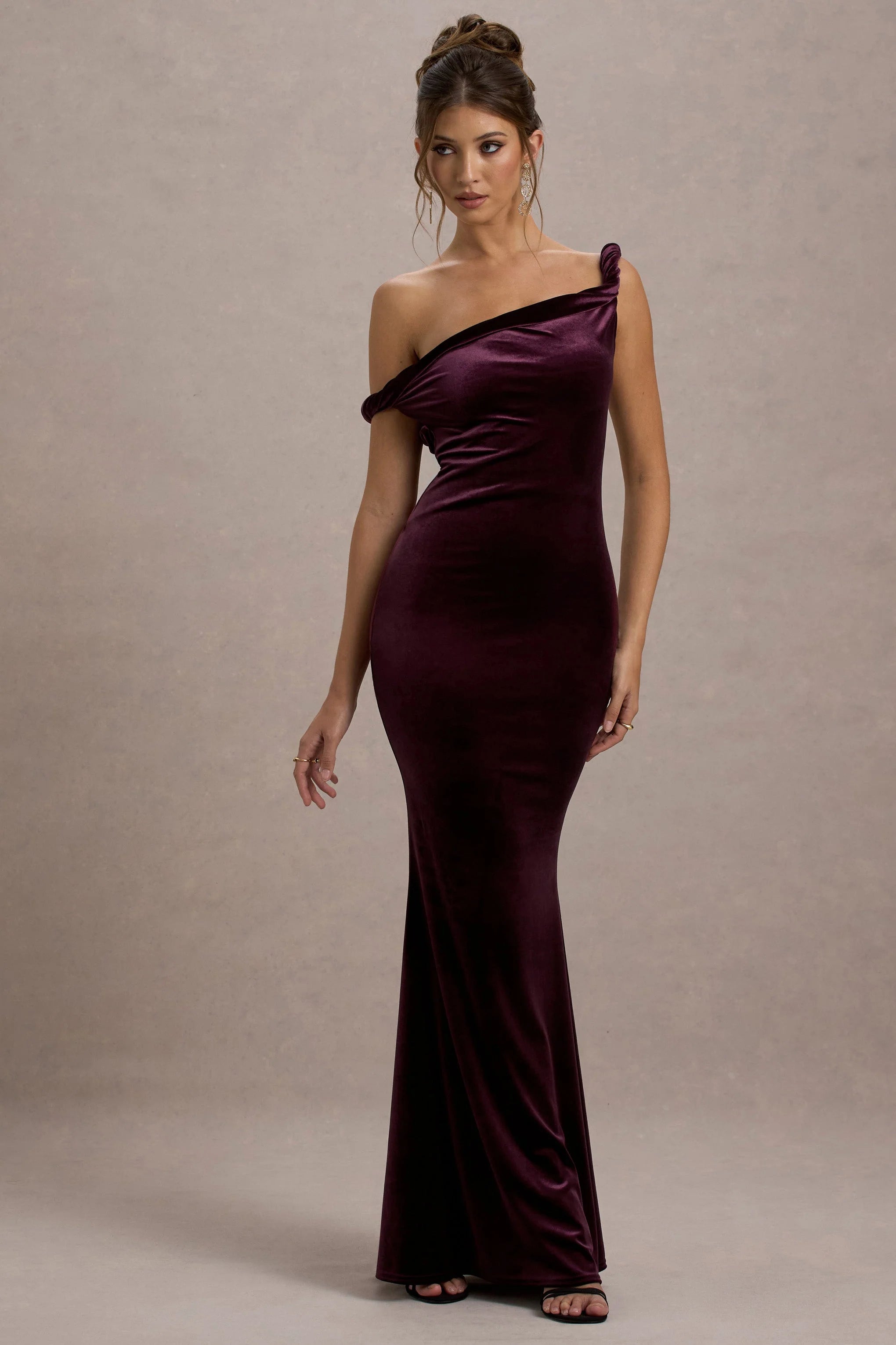 Defined by its luxurious fabric and bold design, Neeka is an unforgettable option for your most glamorous occasions. Crafted from our rich port velvet, this asymmetric maxi dress features a twisted front detail that effortlessly sculpts your silhouette. The sumptuous velvet creates a striking, curve-hugging fit, and the unique asymmetric hemline ensures you stand out from the crowd. Keep Neeka at the forefront of your look by pairing it with sleek, pointed heels and delicate jewelry.