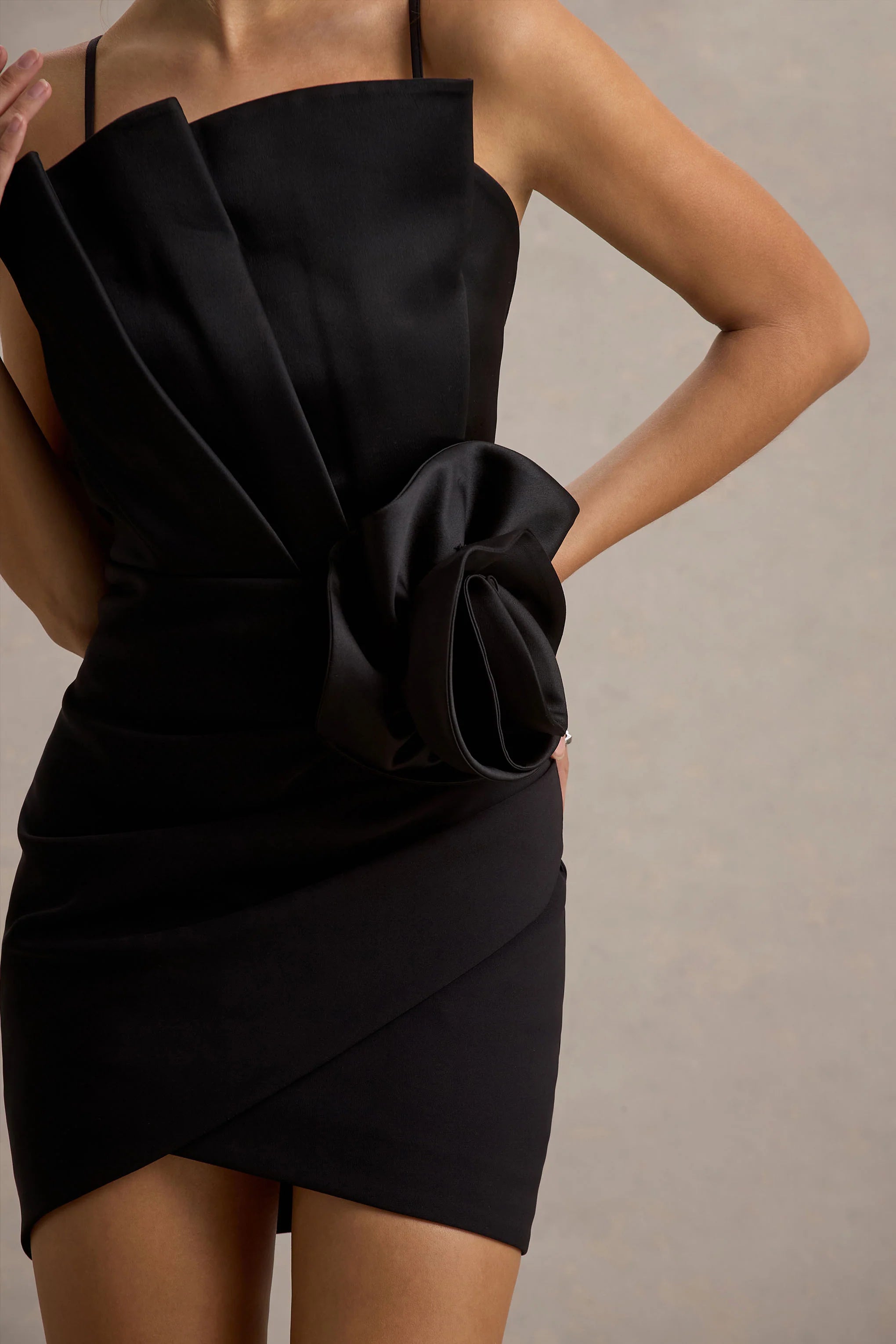 Introducing your new go-to LBD Olivette, where timeless elegance meets show stopping detail. Crafted from our premium stretch crepe in a classic shade of black, this mini dress is designed to sculpt and flatter with every wear. The bandeau neckline enhances your decolletage, while the statement corsage flower detail adds a touch of romance and high-fashion drama. Sleek, sophisticated and effortlessly chic, this is the perfect dress for any VIP moment, all eyes will be on you.