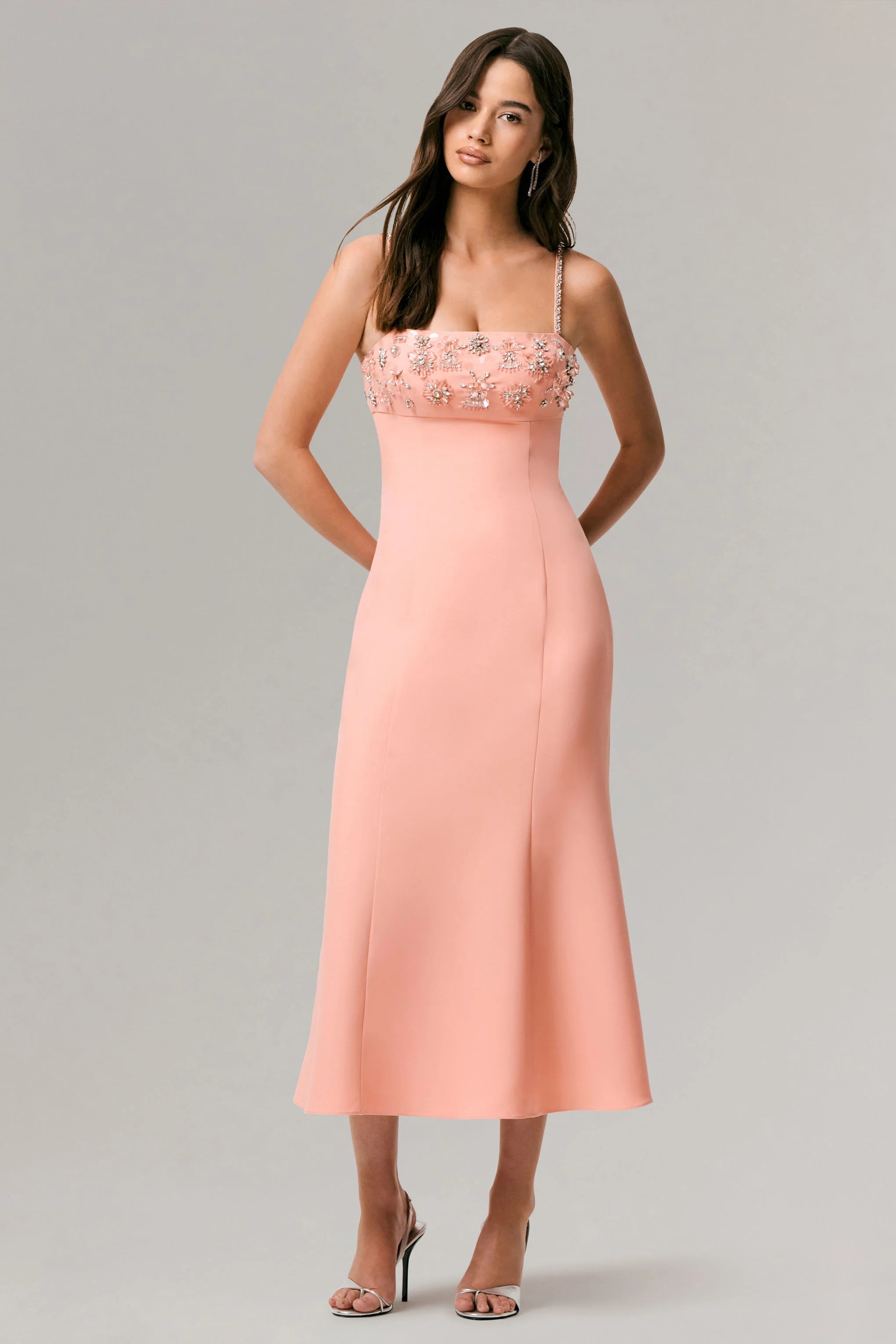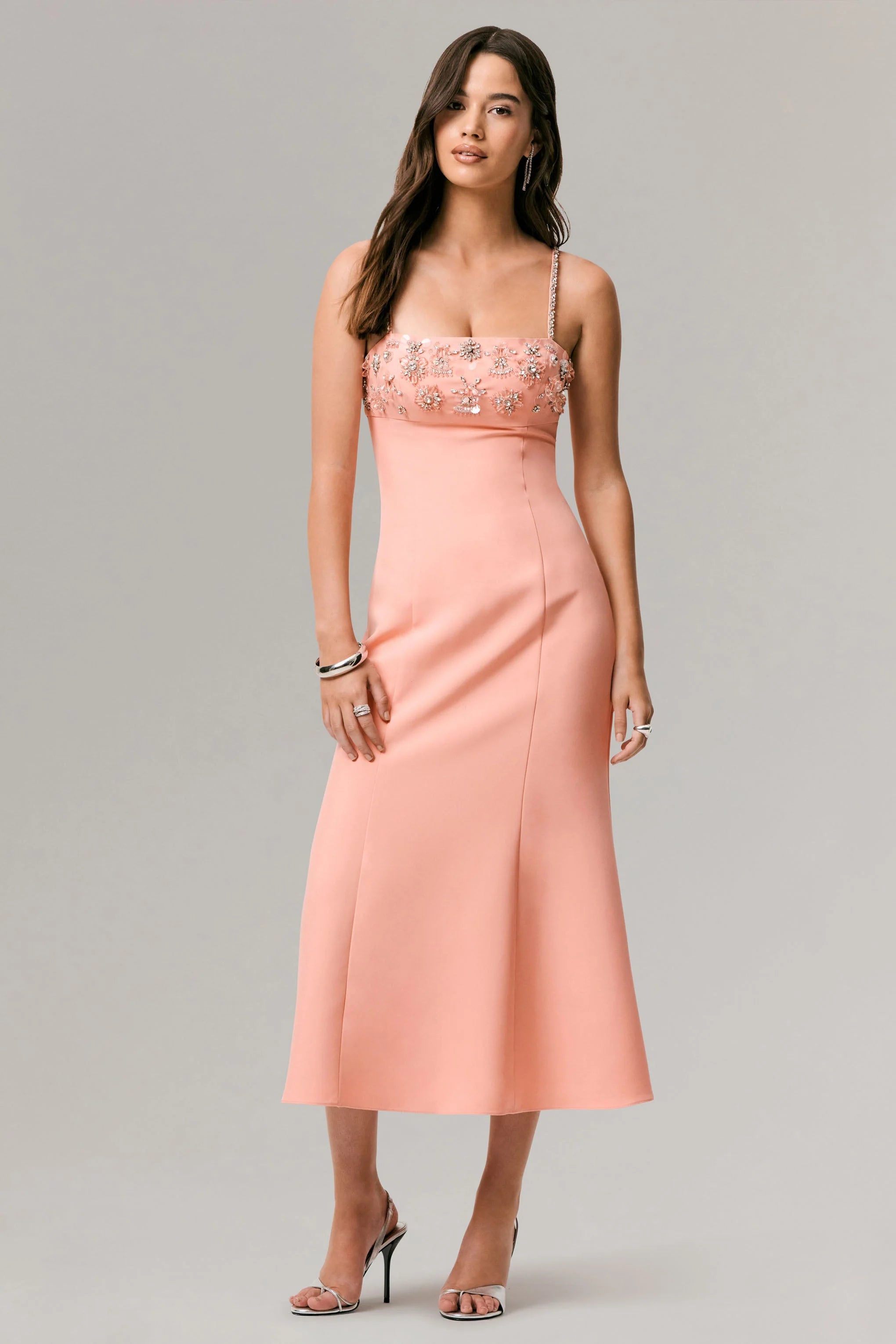 Designed to captivate from every angle, One To Remember is your go-to for standout occasion wear. Crafted in a bold coral hue of our premium crepe, this midi dress offers a structured and sleek fit with a striking, eye-catching finish. Featuring a flattering square neckline framed by embellished, adjustable cami straps, while the coordinating hand embellished bust panel adds a touch of drama. Finished with a striking fluted hem, this midi effortlessly enhance your curves and is perfect for your next glam event. Style with sleek heels and sparkling jewellery for an unforgettable look.